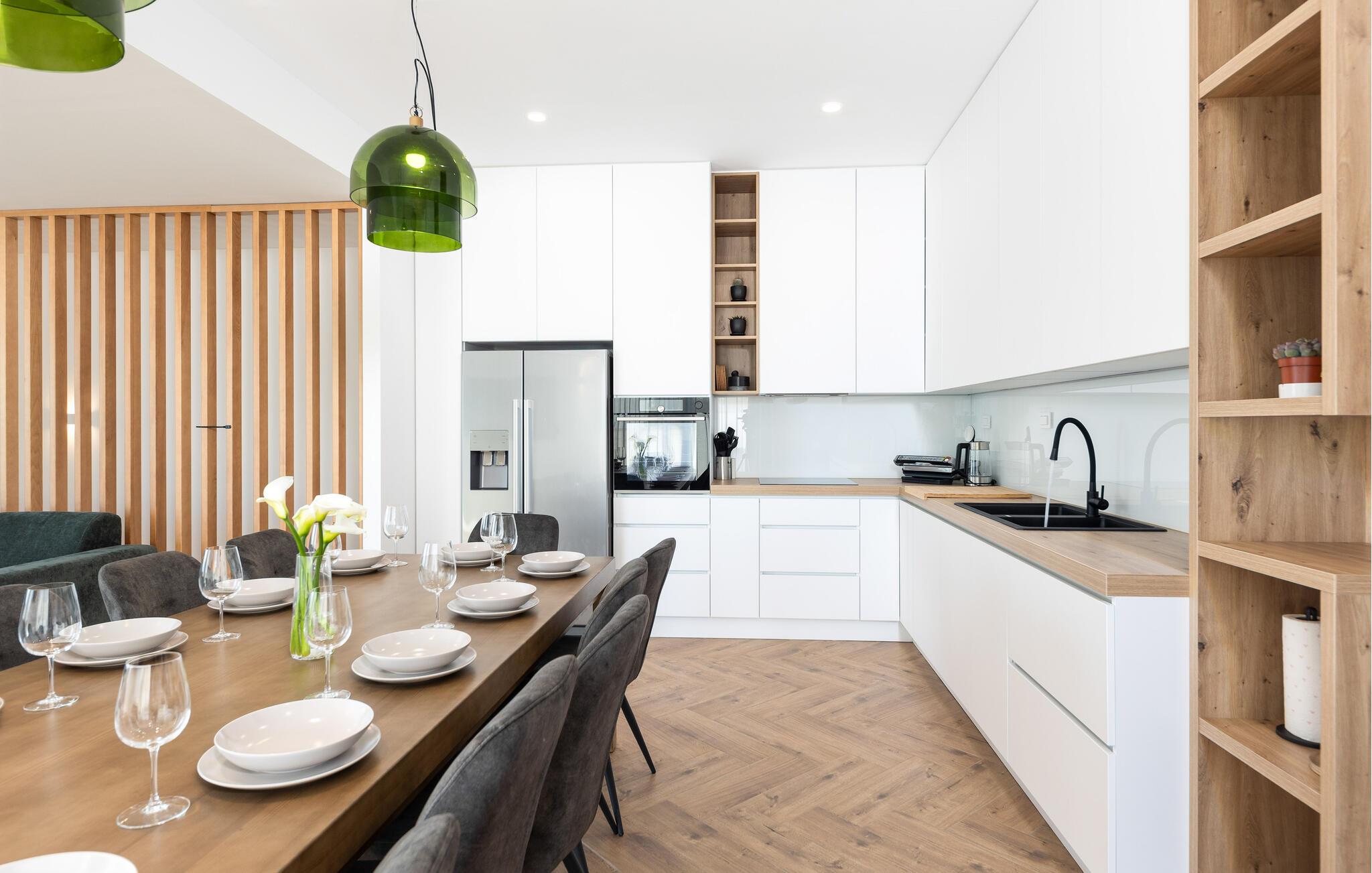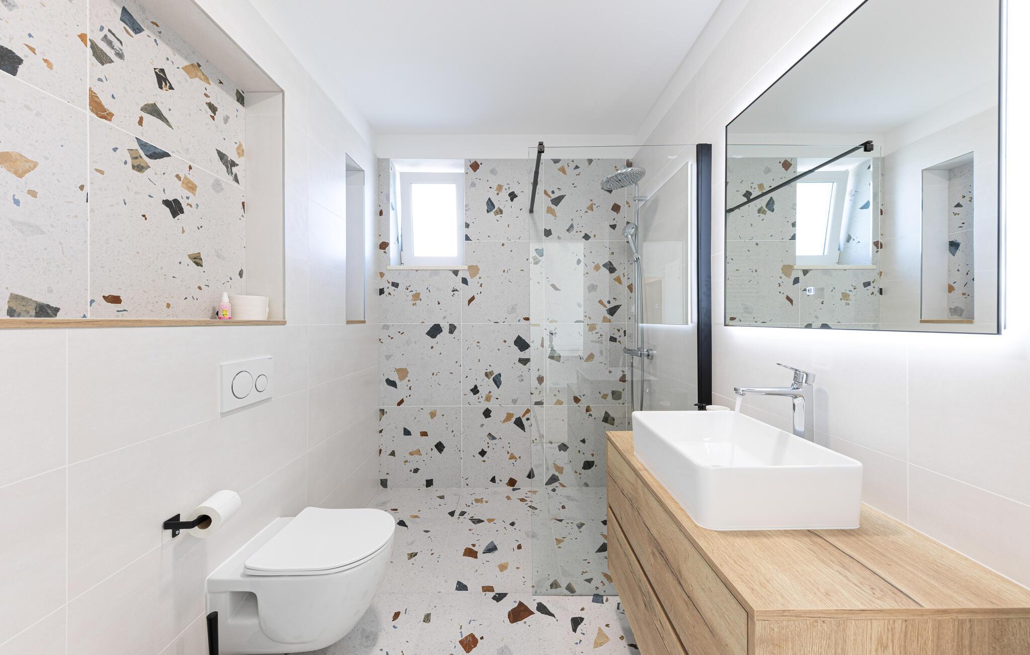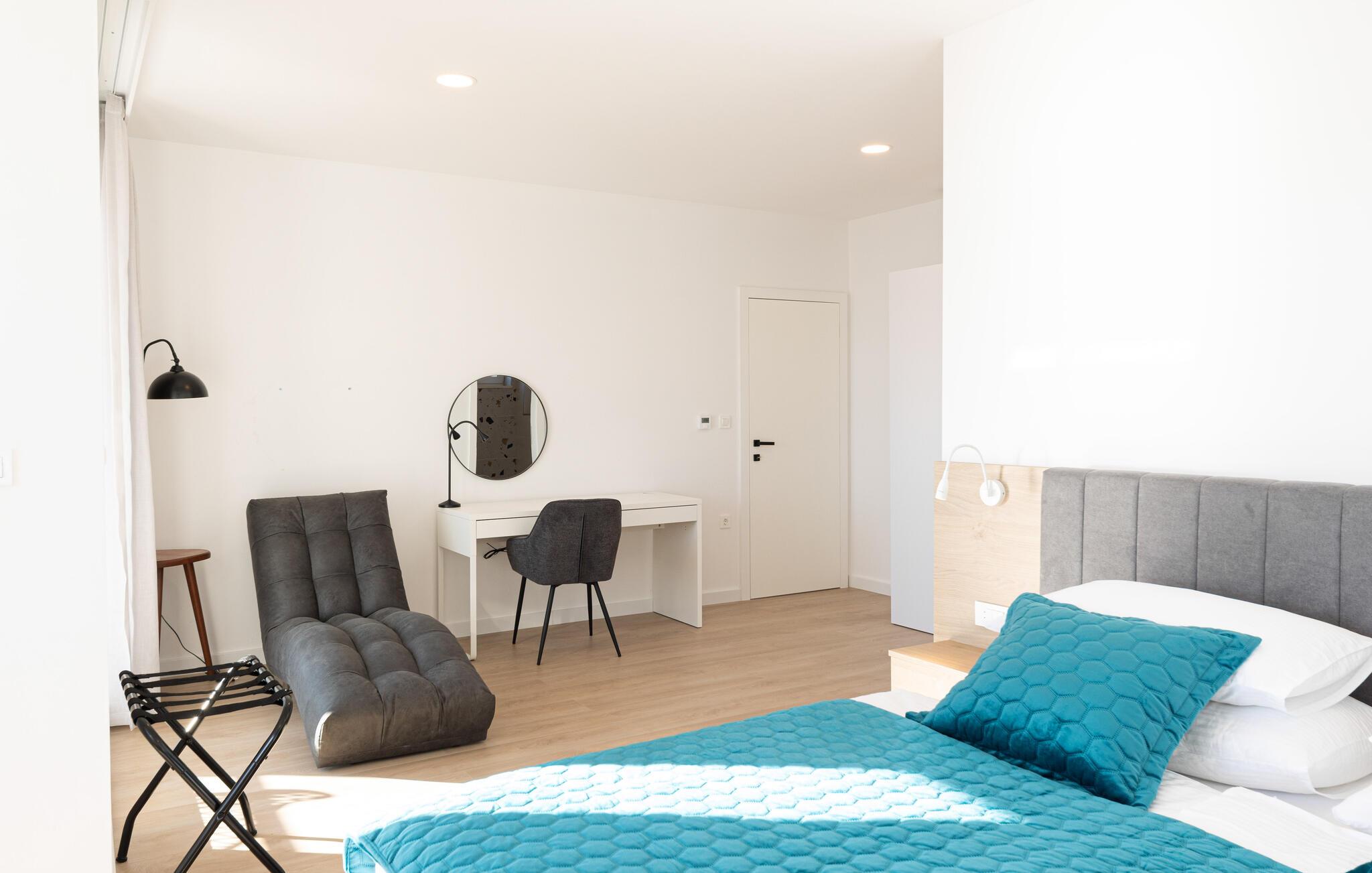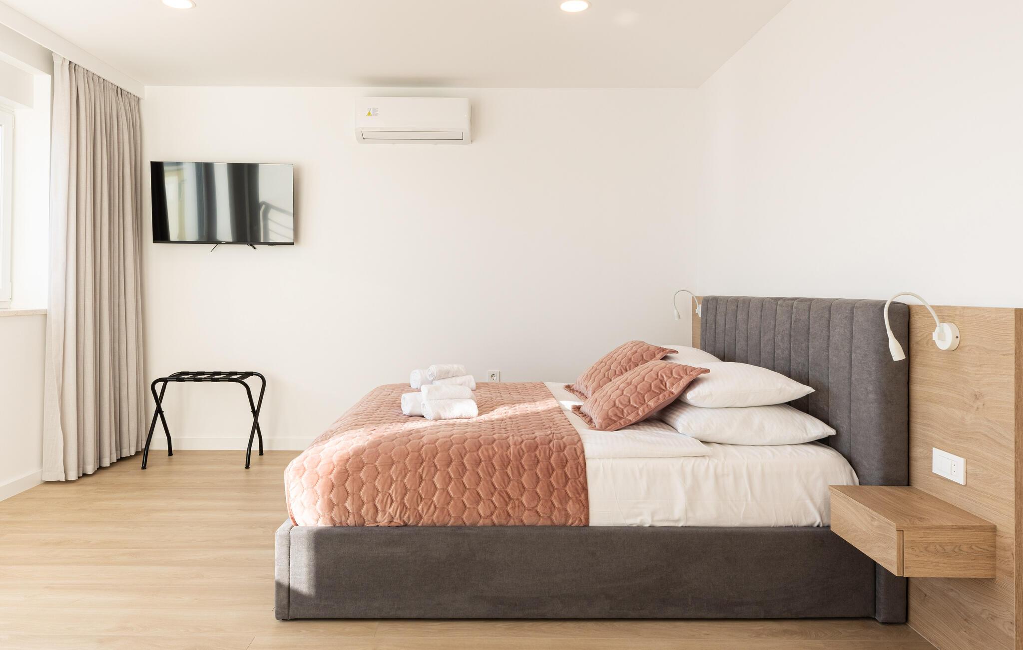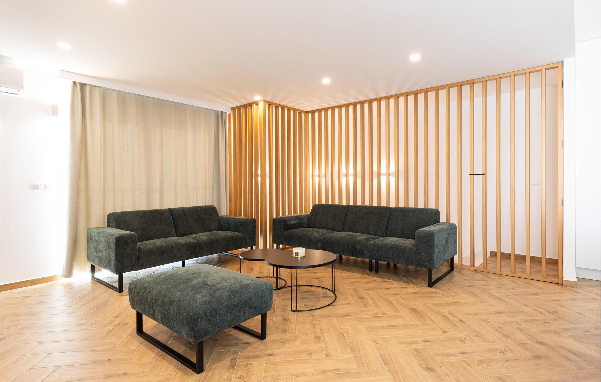 I denne rummelige villa på den dalmatiske kyst venter en uforglemmelig pause på jer i en privilegeret beliggenhed direkte over det turkise hav. Det elegante interiør kombinerer minimalistisk design med varme træelementer og bløde toner. Fremtryll kulinariske højdepunkter i det åbne køkken, og tag plads ved det stilfulde spisebord. Slap af i den åbne opholdsstue og afslut dagen med en filmaften eller en god samtale.