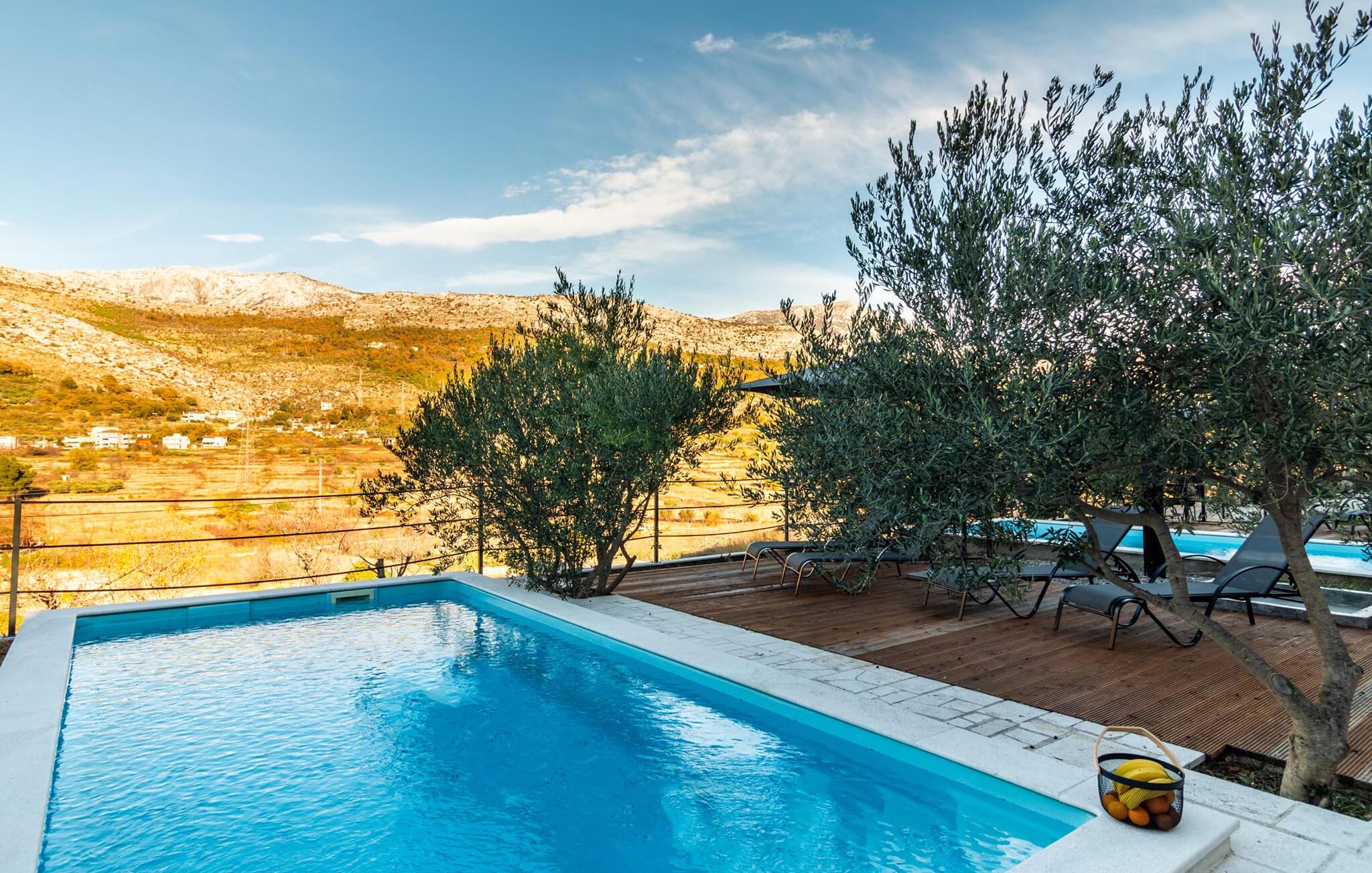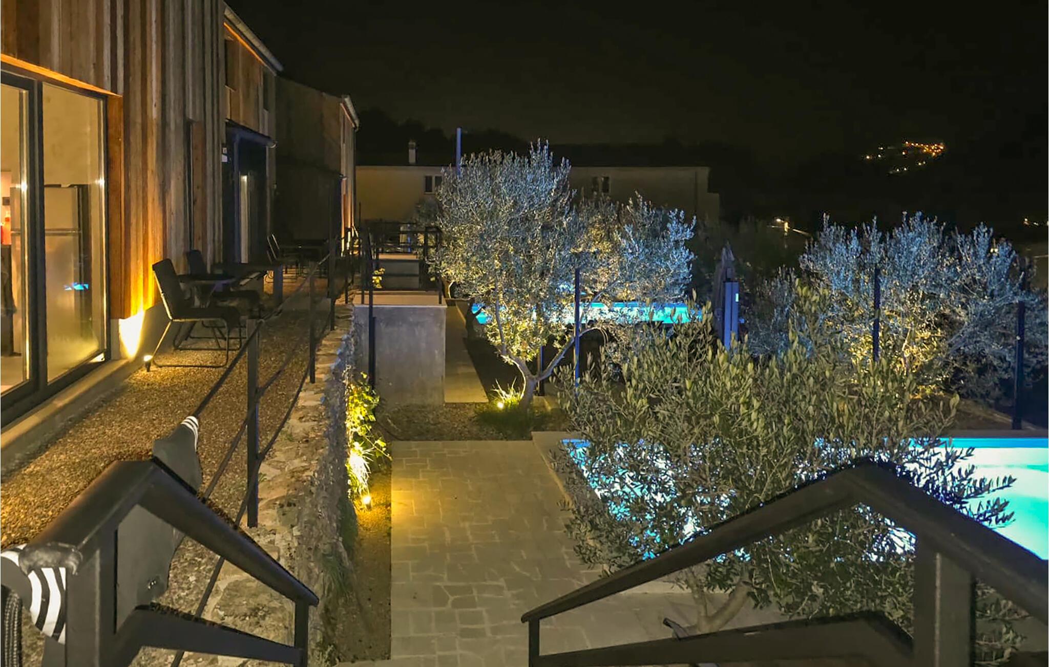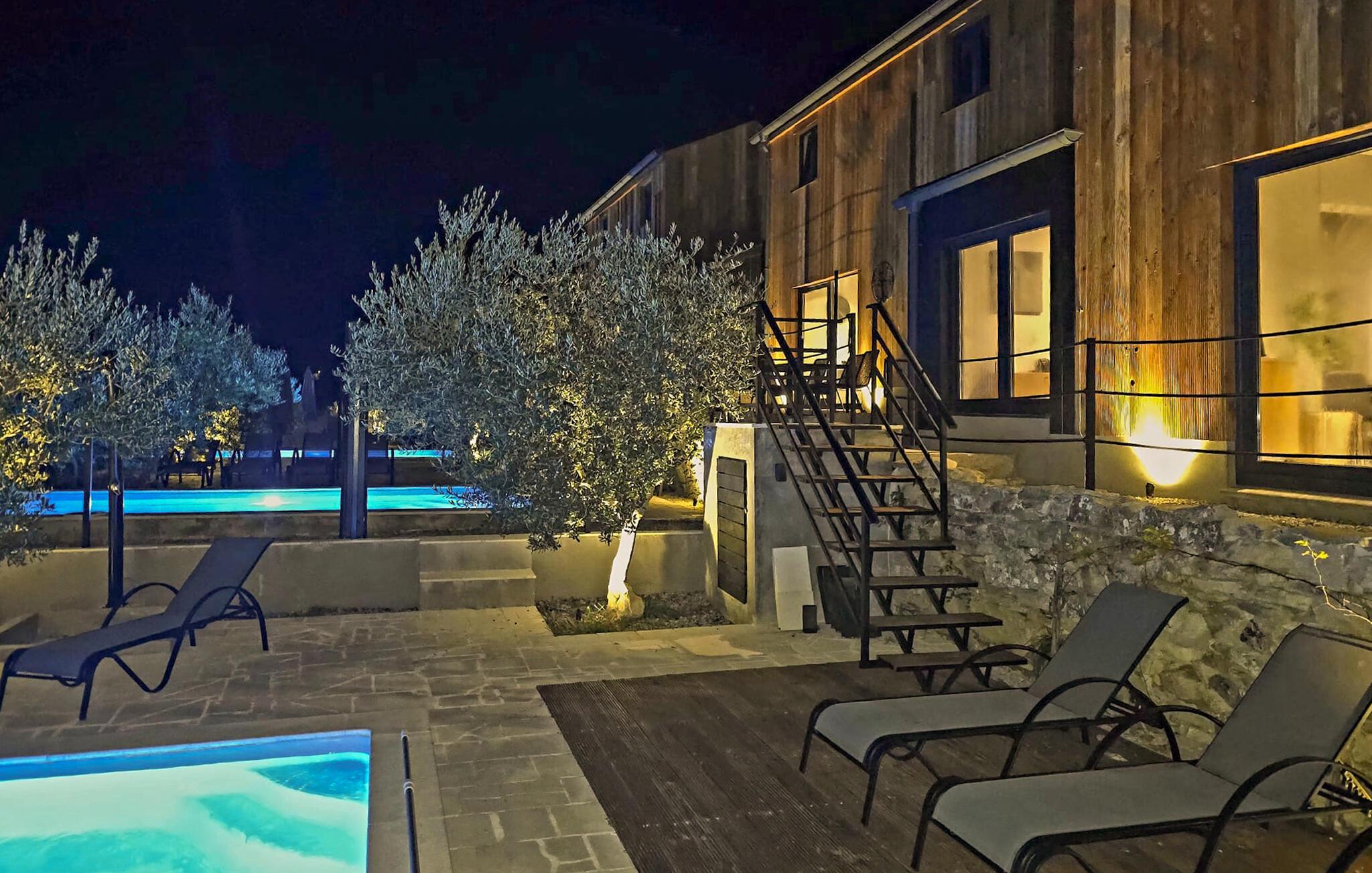 Træd ud på terrasserne og nyd udsigten over de omkringliggende bakker. Slap af på liggestolene ved de tre private pools og lad det mousserende vand snuppe en frisk dukkert. Find et roligt sted på loungemøblerne til fredelige aftener og se den nedgående sol bade dalen i varmt lys. Oplev de veldesignede udendørsområder med træ- og naturstenselementer, der giver huset en moderne karakter.