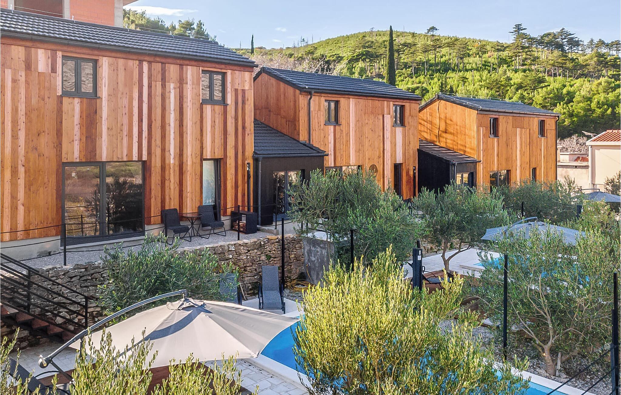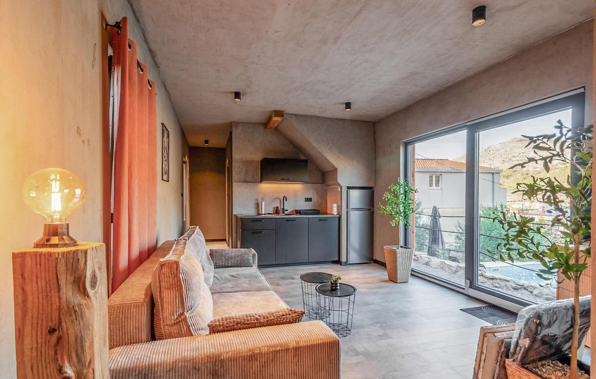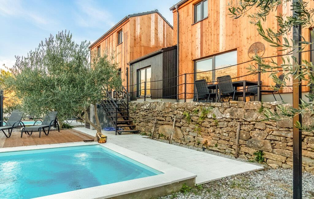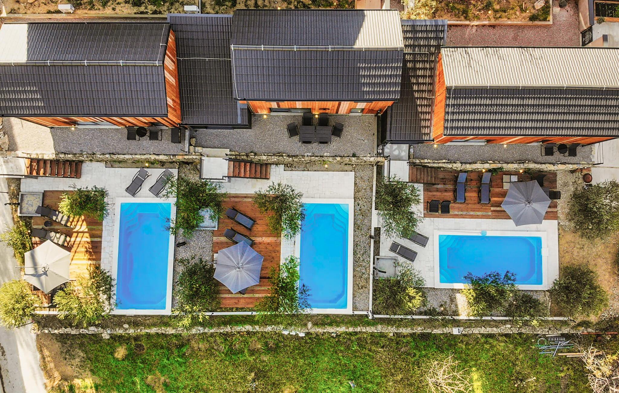 Jeres stilfulde feriehus består af tre separate boligenheder, hver med sin egen private pool, hvilket sikrer en høj grad af privatliv. De lyse opholdsområder er indrettet med moderne materialer og store vinduer. Læn jer tilbage i de komfortable sofaer og nyd det naturlige lys, der oversvømmer værelserne. Tilbered jeres måltider i de kompakte køkkener og nyd dem ved spisebordet, som giver et behageligt rum til fælles øjeblikke.