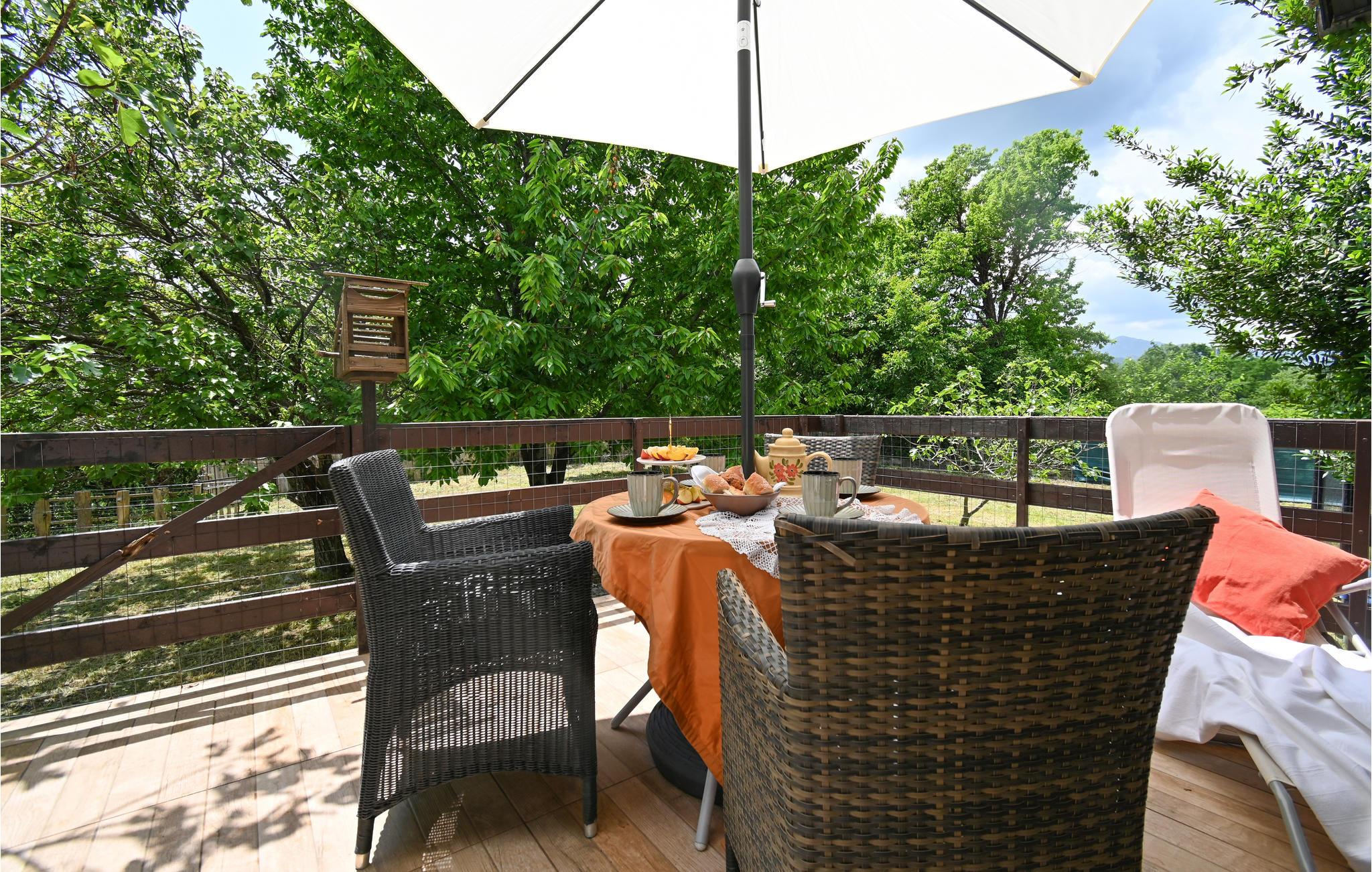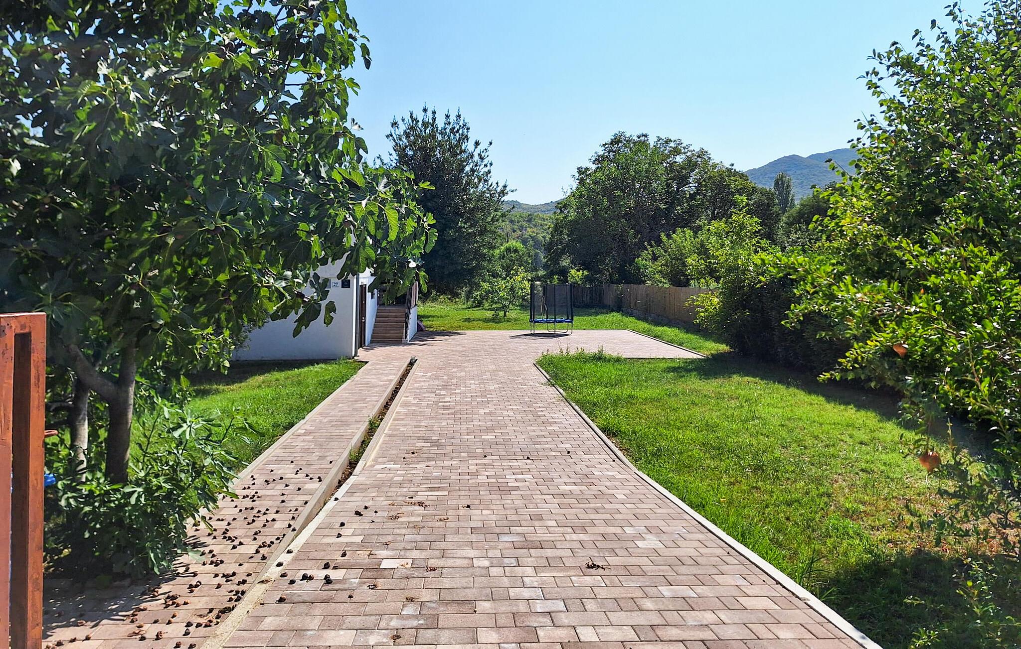 Ud over behagelig skygge under frugttræerne byder den store have også på bademuligheder for børnene og god plads til at boltre sig og lege. Selv familiens hund kan frit løbe rundt i det indhegnede område. I kan også køle ned i den nærliggende flod.