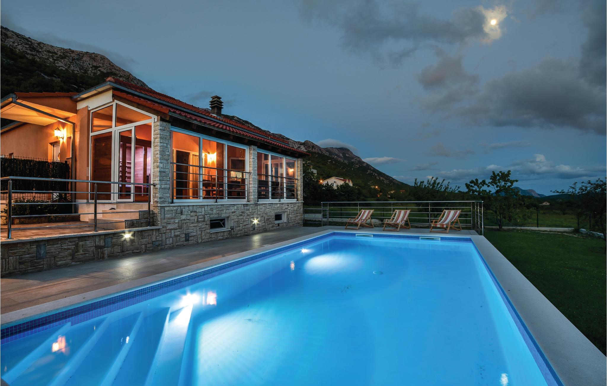 Hold en ferie langt væk fra hverdagens stress og storbyens larm og mange mennesker i dette skønt indrettede feriehus. Det ligger i en lille og rolig by og rummer tre soveværelser, badeværelse, toilet og køkken der er i åben forbindelse med stuen. . Huset ligger på en stor grund med en pool til en forfriskende svømmetur. Lav forskellige lækre retter på grillen, køb ind på det lokale marked hvor I kan finde lokalt dyrkede grøntsager alt efter sæson. Besøg Omis hvor der er mange aktivitetsmuligheder og underholdning for unge og gamle. Tag også en tur til en af Europas smukkeste byer - Split, der har en særlig charme, pga sinde mange gamle bygninger og sin beliggenhed ved havet.