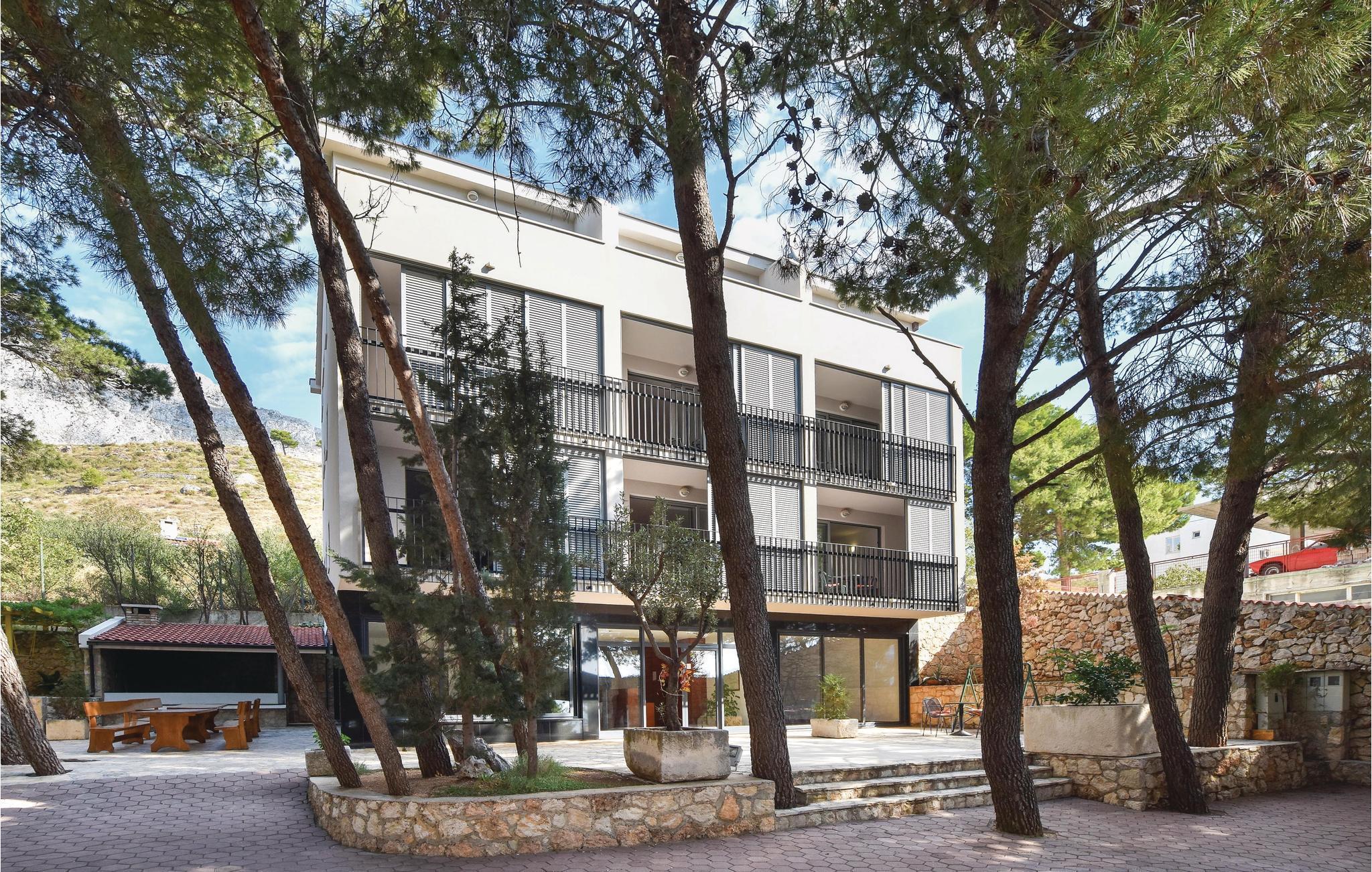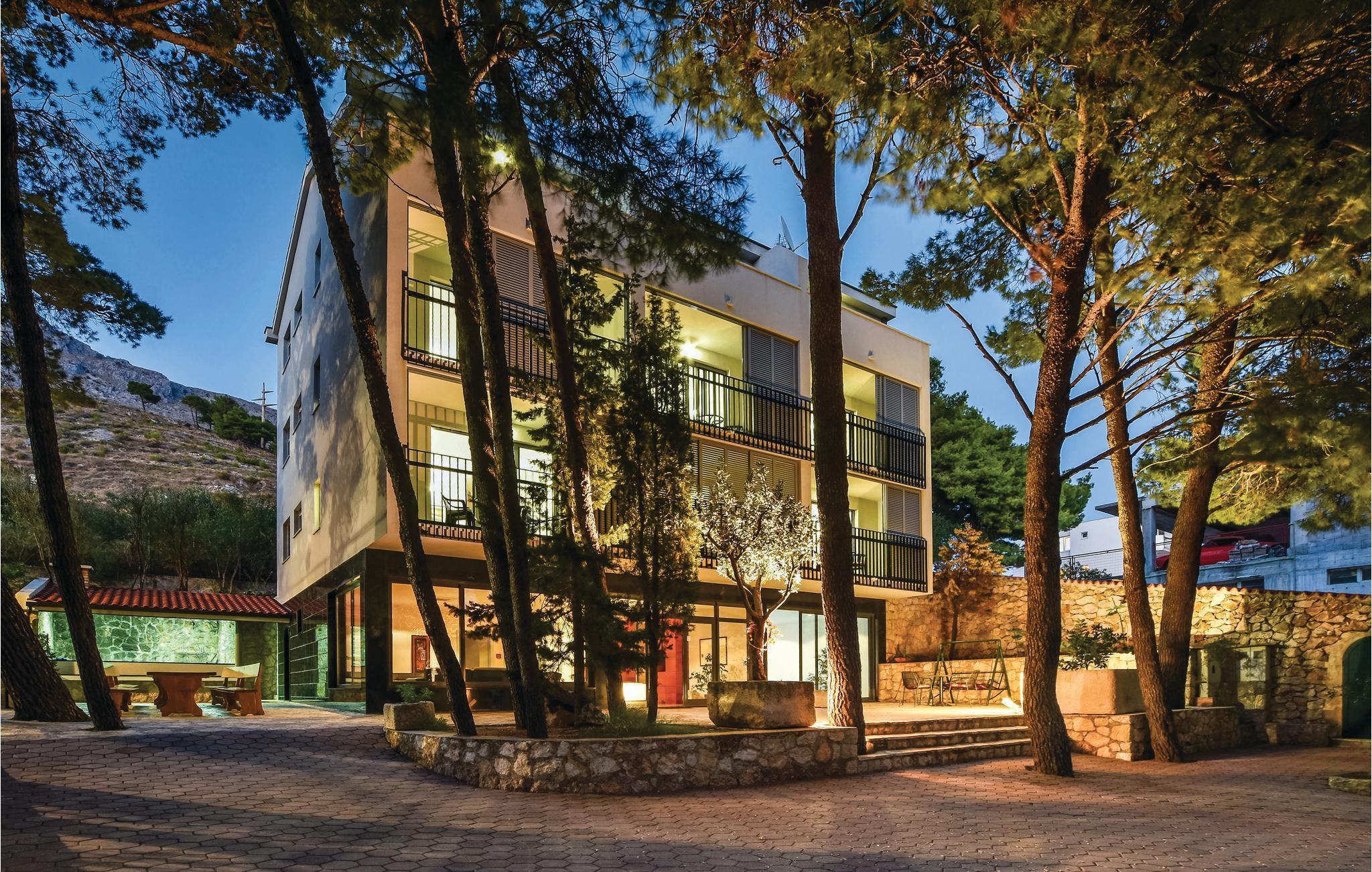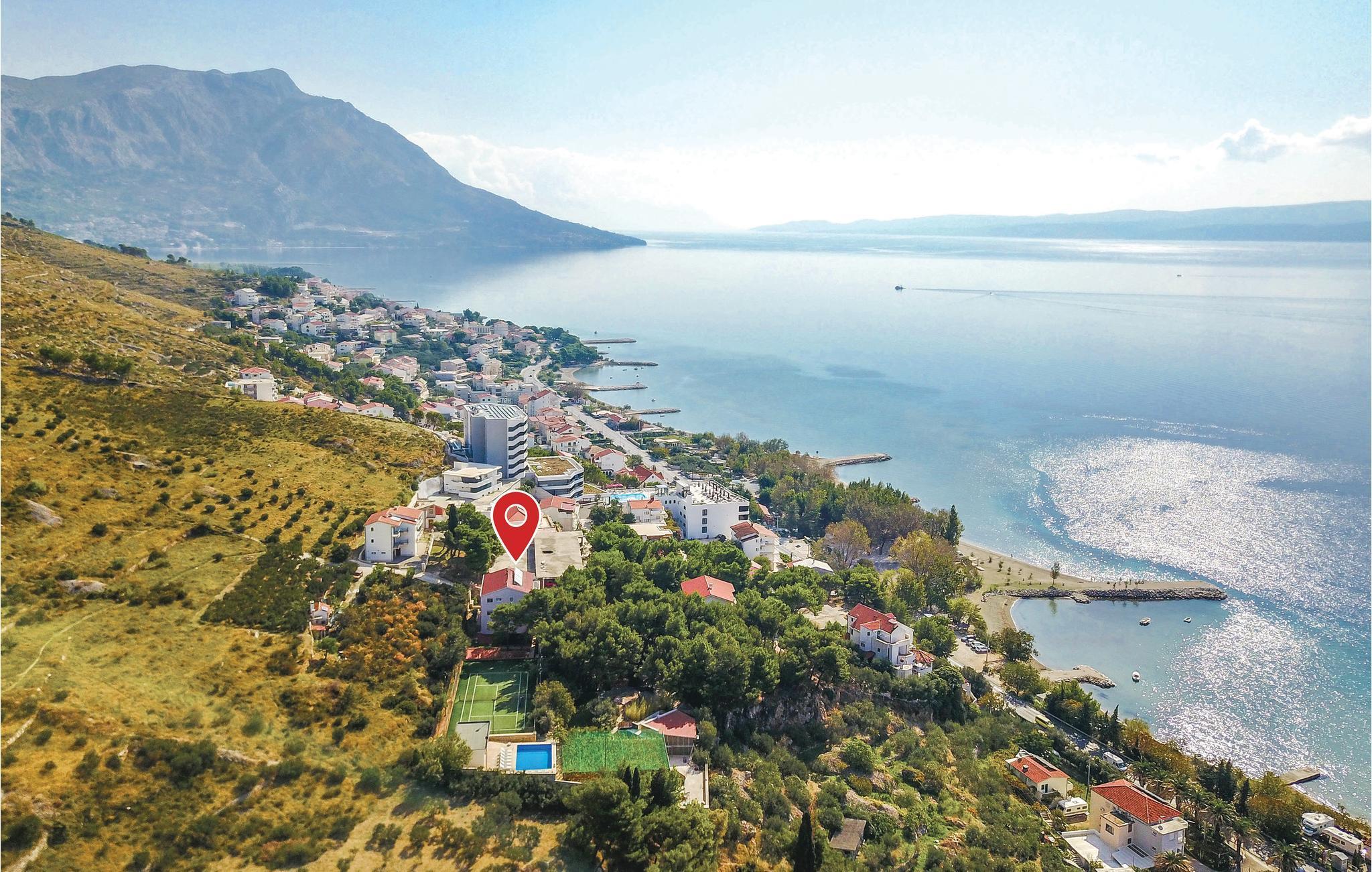 Moderne hus med masser af ekstraudstyr. Lejlighederne er forbundet via trapper og en elevator. Det fuldt klimatiserede hus ligger på en stor grund, og giver jer alle forudsætningerne for en afslappende og rolig ferie. Den hyggelige stue og indendørs pool i stueetagen inviterer dig til at slappe af fra hverdagens stress og jag. En stor udendørs terrasse med bar og grill er placeret ved siden af ??hovedhuset. Ved den store udendørs swimmingpool har du en fabelagtig panoramaudsigt over bugten ved Omis. På petanque eller tennisbanen kan voksne og børn dyste mod hinanden. Du kan også bruge tennisbanen, der har professionelt udstyr. I skyggen af ??fyrretræerne kan du på forskellige terrasser finde afkøling på de varmeste dage. Grunden har et lukket parkeringshus, hvor du kan parkere din bil. Administratoren bor i nærheden og er gerne behjælpelig med at arrangere ture til de dalmatiske øer. Hele Omis' Riviera byder på alt, hvad du behøver for en afslappende familieferie. Der er stadig steder, hvor du kan være uforstyrret, også i højsæsonen. Med bil kan man køre langs den smukke kystvej og nyde fabelagtig udsigt over til øen Brac. Nyd Middelhavet charme i de små kystbyer og gå ind i de små Konobars og restauranter. Du kan virkelig opleve de omkringliggende landsbyer, før du drejer til højre fra hovedvejen i byen. Du vil, så snart du forlader det pulserende liv på gaden, straks finde den fred, du søger.