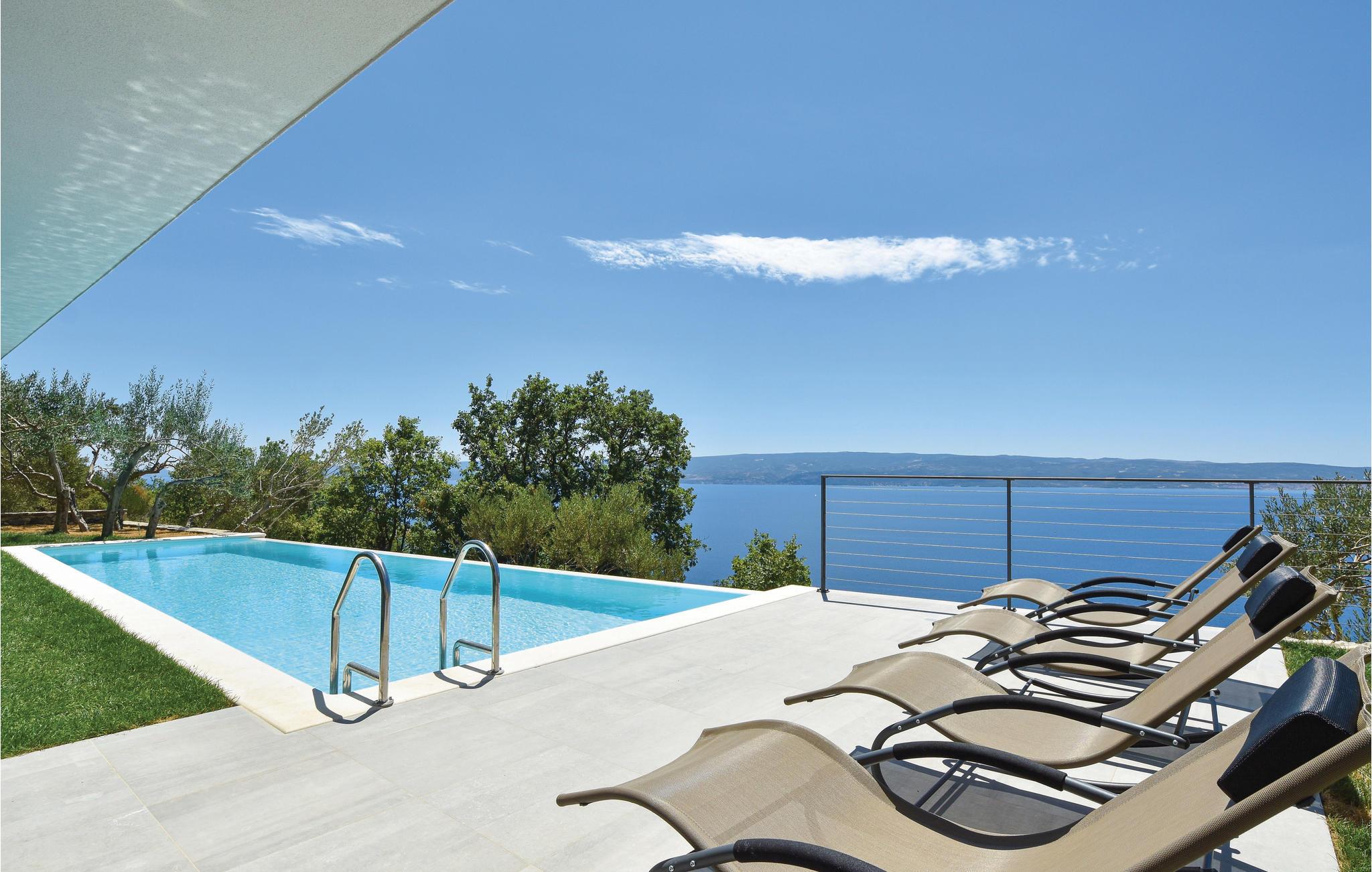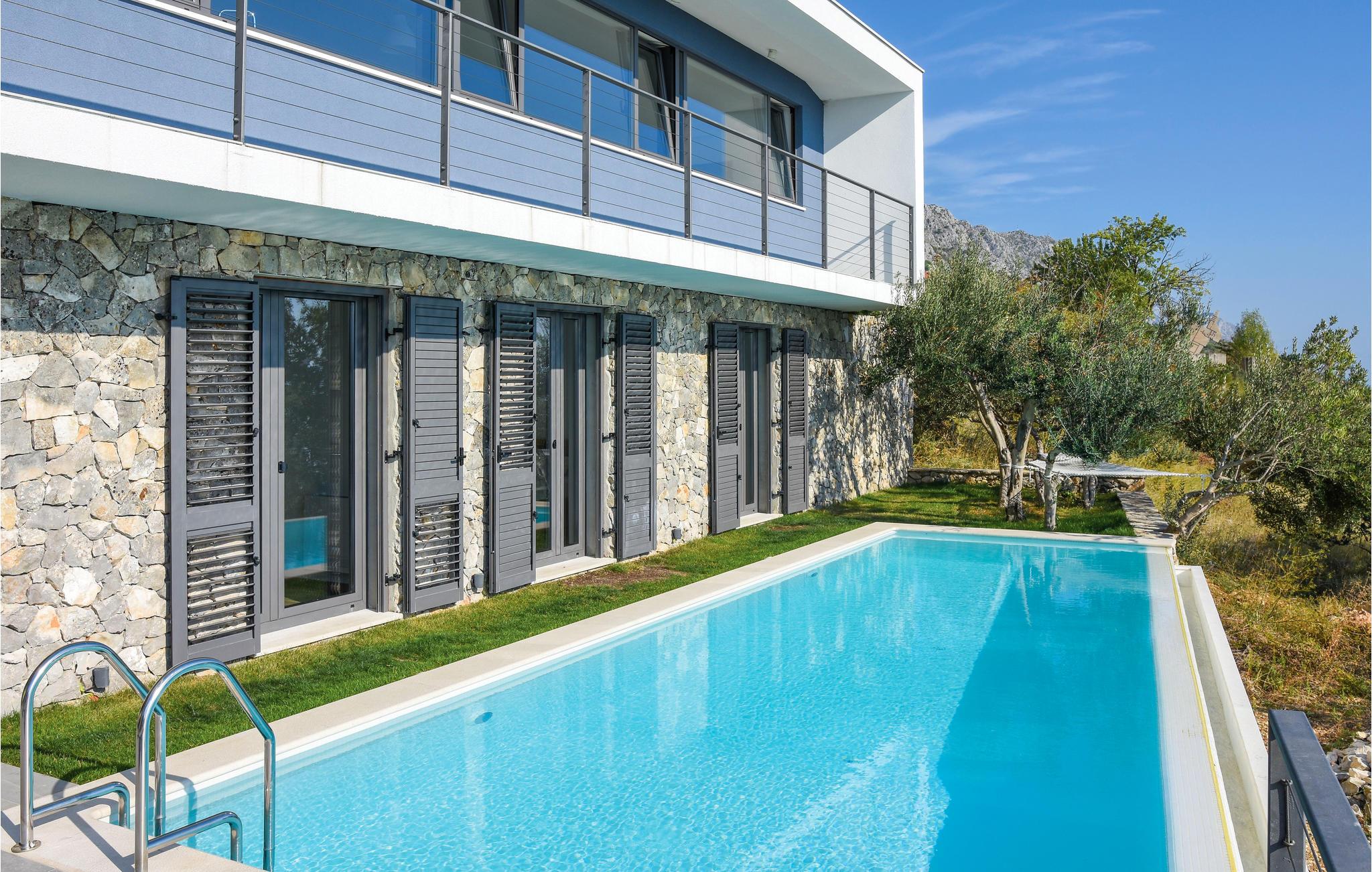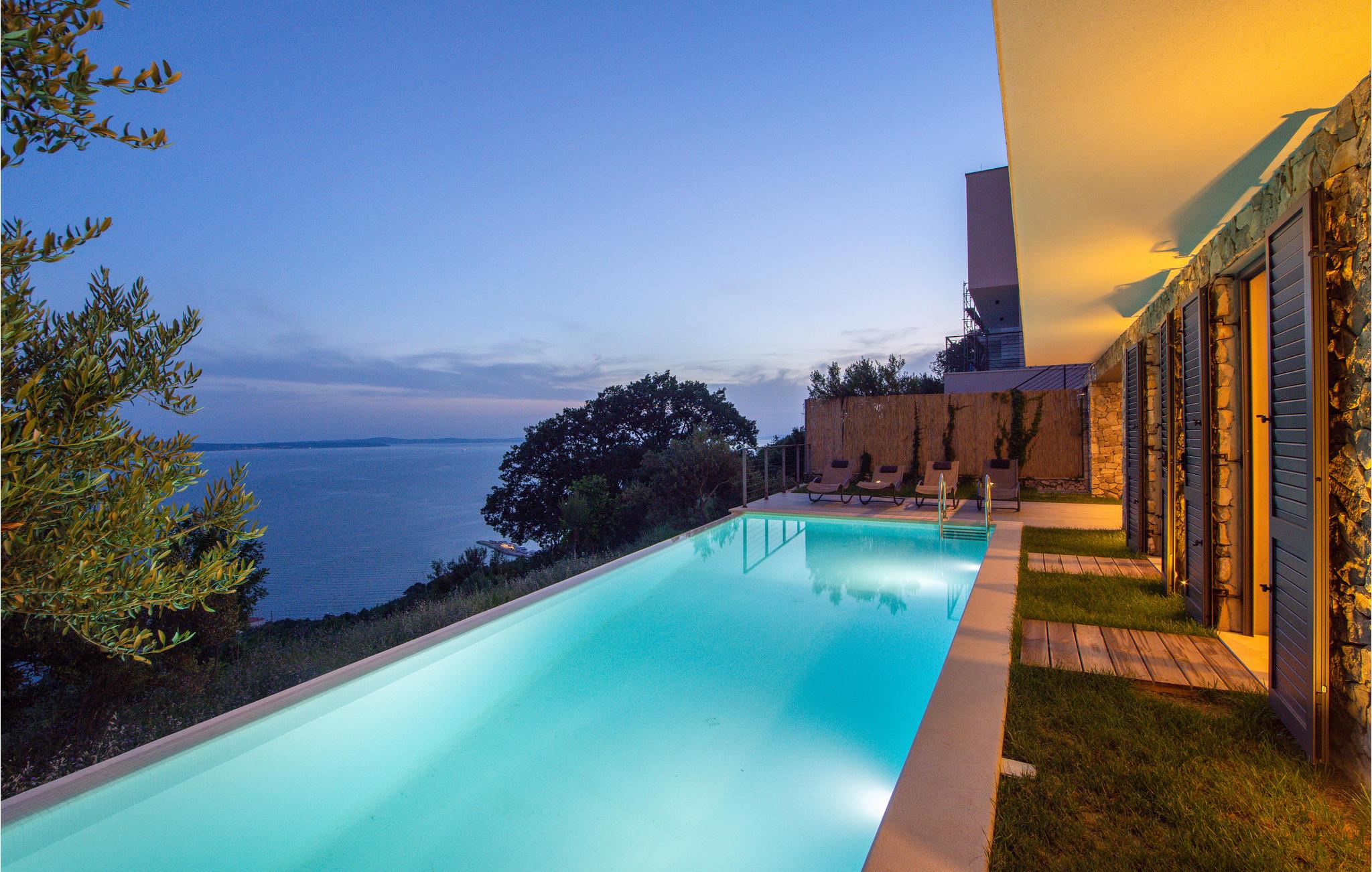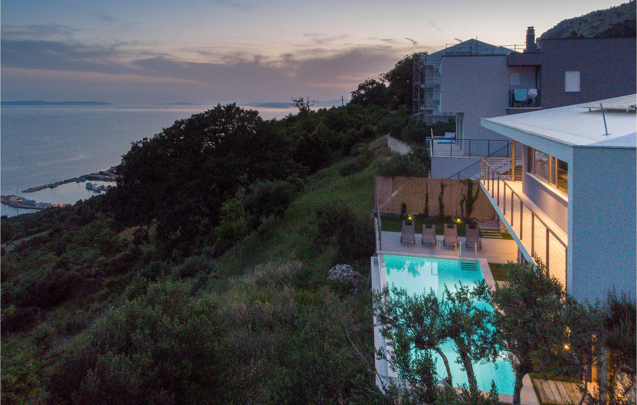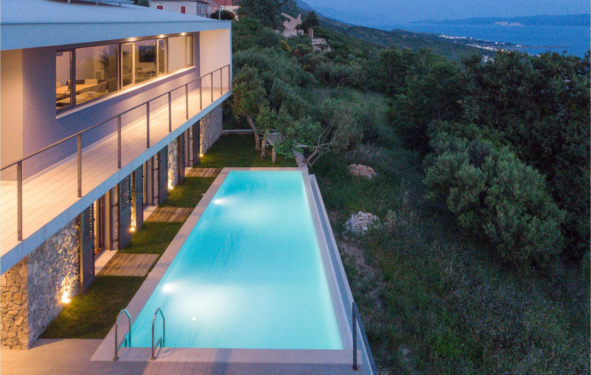 Et grandiost feriehus med en fantastisk stil og kunst, som indkapsler den mediterrane stil i det 21. århundrede. Indretningen er luksuriøs og fuldt møbleret, og der er en terrasse til huset. Fra parkeringspladsen kommer I lige ind i opholdsområdet. Ad både yder- og indertrapper kan I gå ned i den rolige oase. Her ligger poolen, hvorfra I har en flot panoramaudsigt. Også fra soveværelset på denne etage har I direkte udgang til poolen, så I kan tage en frisk svømmetur, når I står op. Huset er virkelig spektakulært og ideelt, hvis I gerne vil væk fra den travle hverdag og byens larm for en stund. Med denne luksus samt den friske luft og natur får jeres ferie en helt ny dimension, hvor I kan lade batterierne op i et uforglemmeligt område.