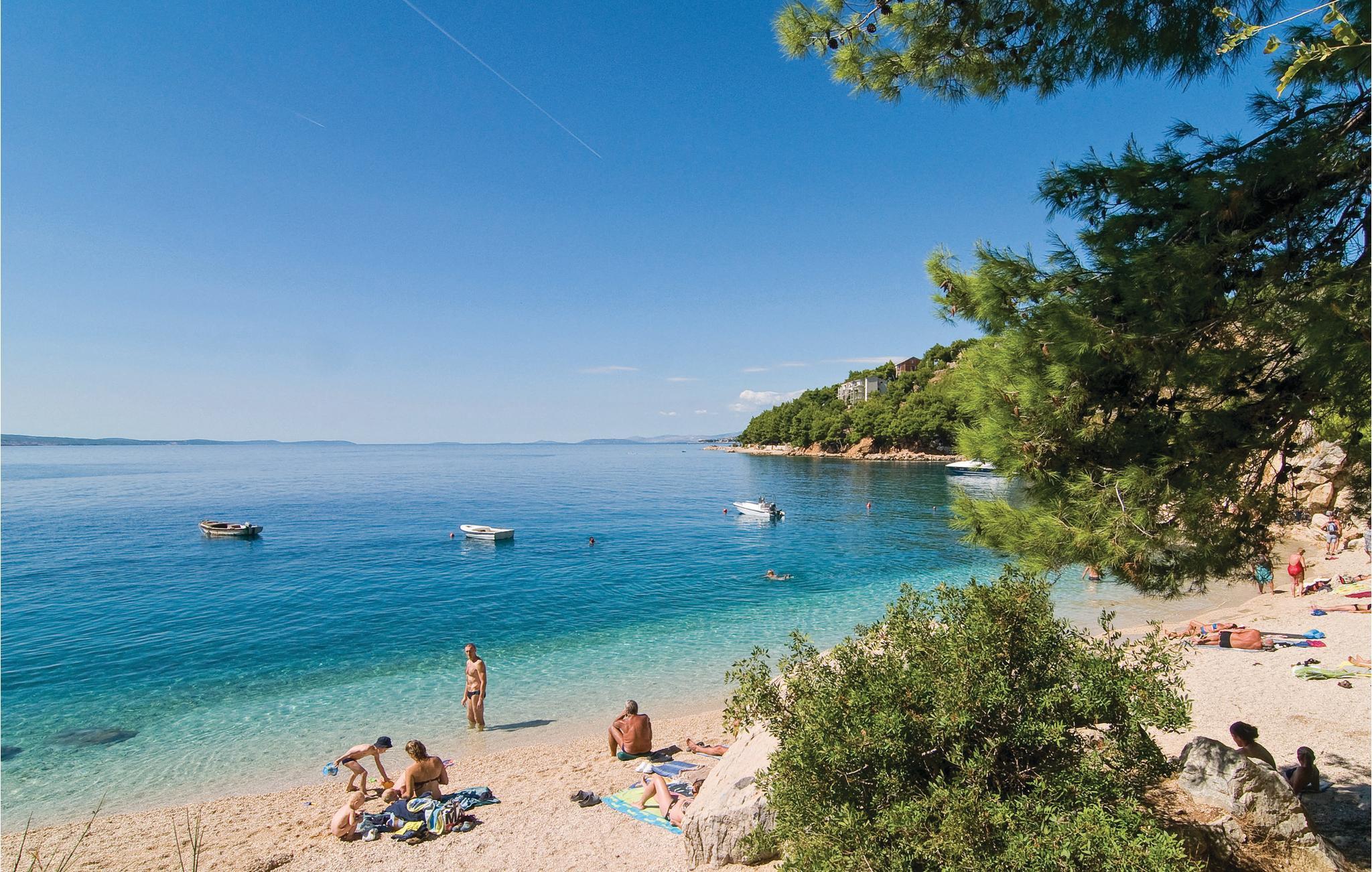 Dette feriehus ligger højt og er omgivet af pinjetræer, her ligger denne hyggeligt indrettede lejlighed til en vellykket ferie. En beliggenhed til en afslappet ferie. Det tager kun få minutter at køre til en lang kiesstrand og havet, så her kan I tilbringe mange dage med at bade og solbade under den varme kroatiske sommersol. Besøg de mange atmosfærefylde småbyer i området og find jeres yndlingsstrand ud til de lune Adriaterhav. Besøg også byerne Omiš og Makarska med mange former for sommerunderholdning.