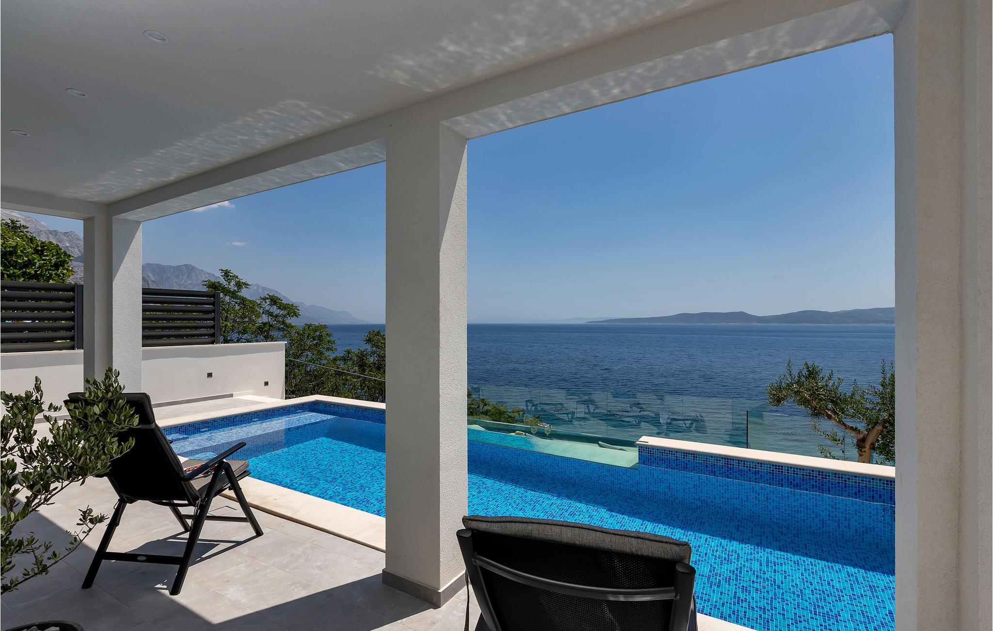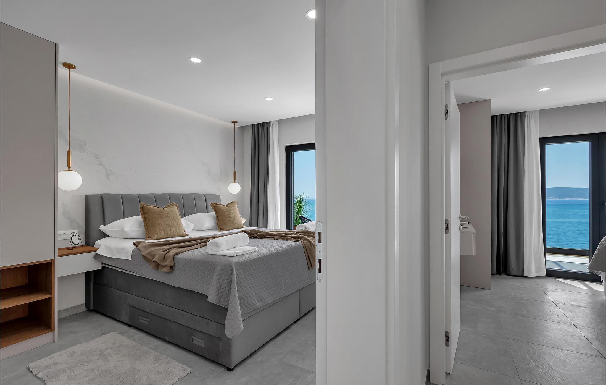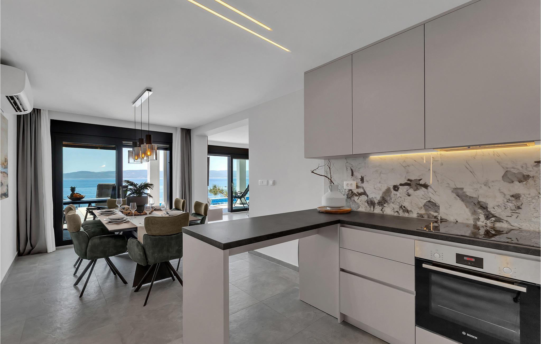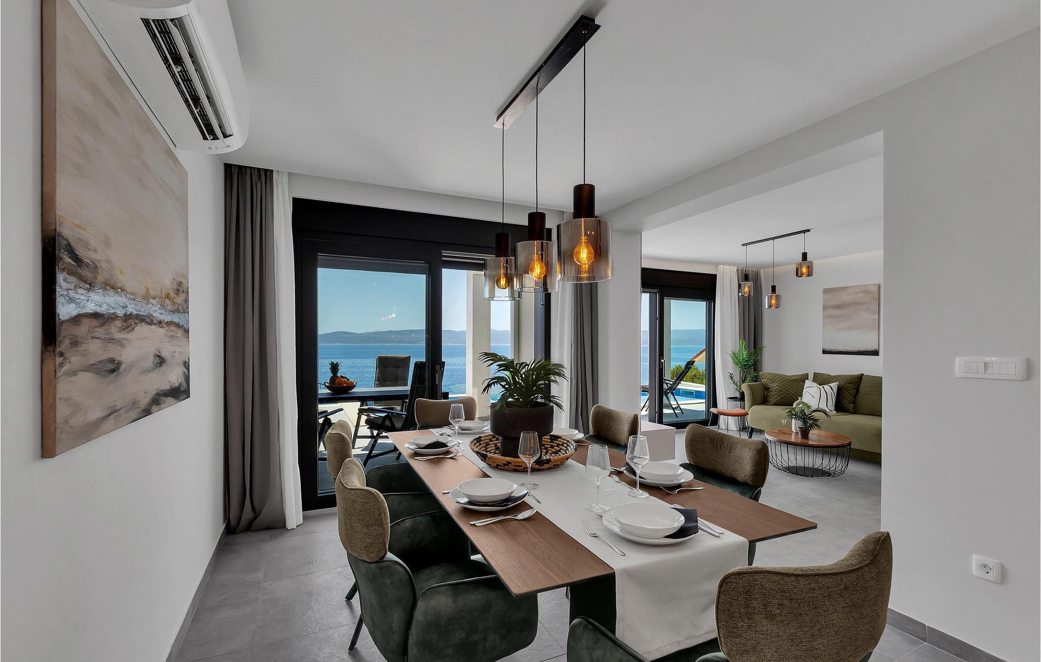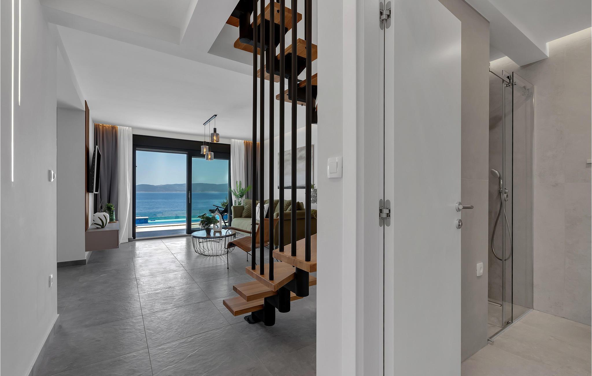 Dette elegante hus udstråler en rolig og luksuriøs atmosfære, forstærket af panoramaudsigten over det dybblå hav. Læn jer tilbage i sofaen og se sollyset glide blidt hen over vandet. Tilbring hyggelige timer med at læse eller deltage i stimulerende samtaler i stilfulde omgivelser. Lav mad sammen i det moderne køkken og nyd et lækkert måltid og et glas vin om aftenen.