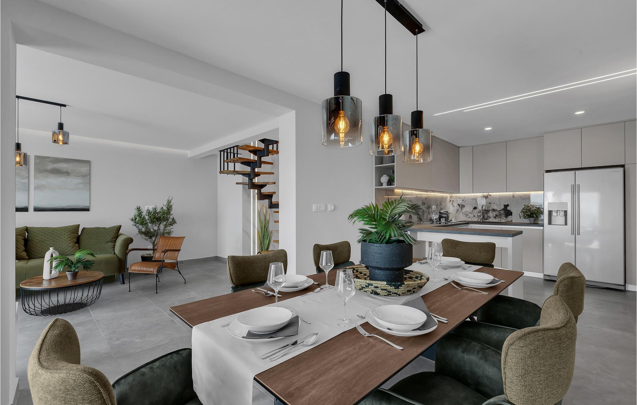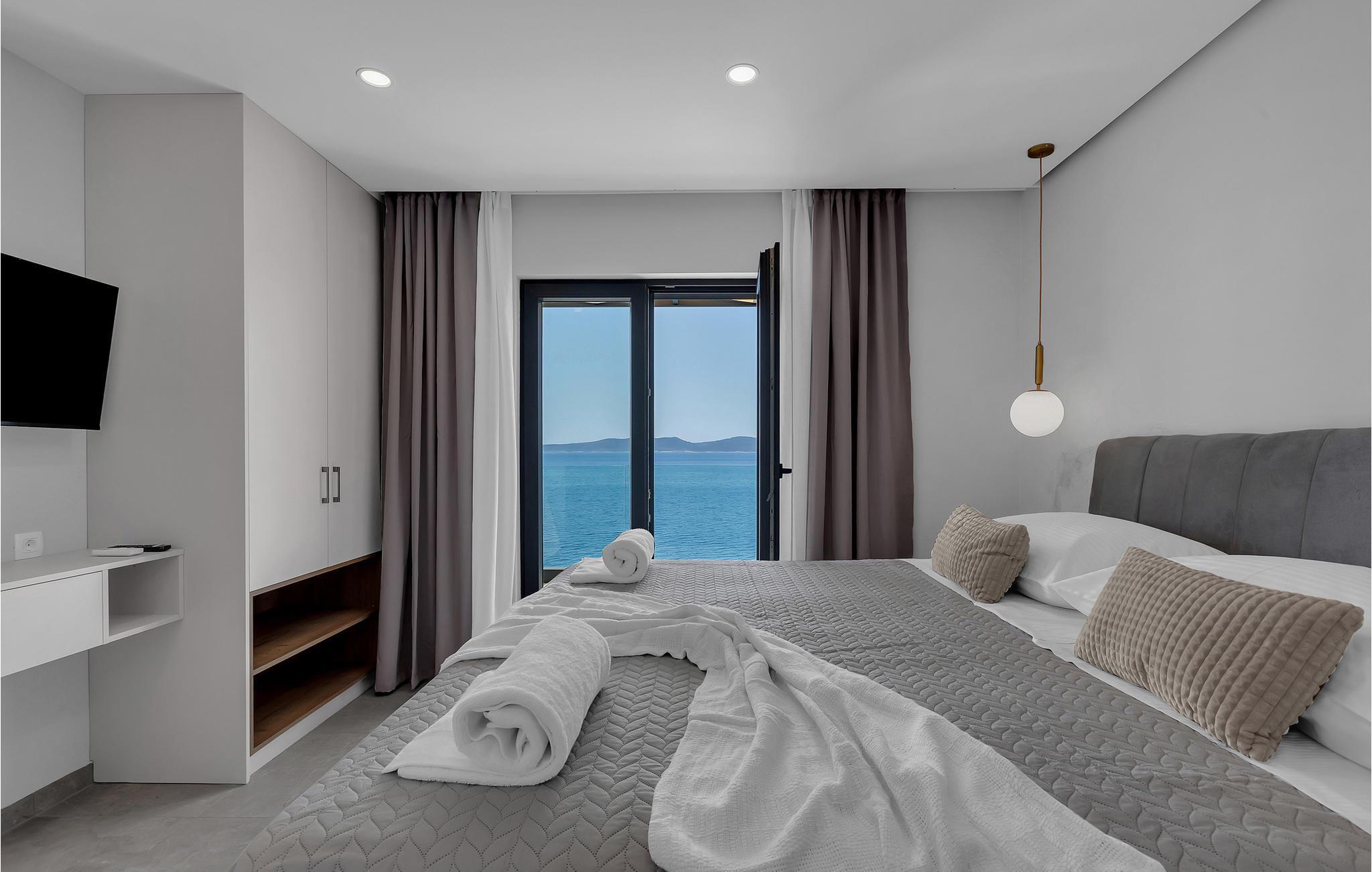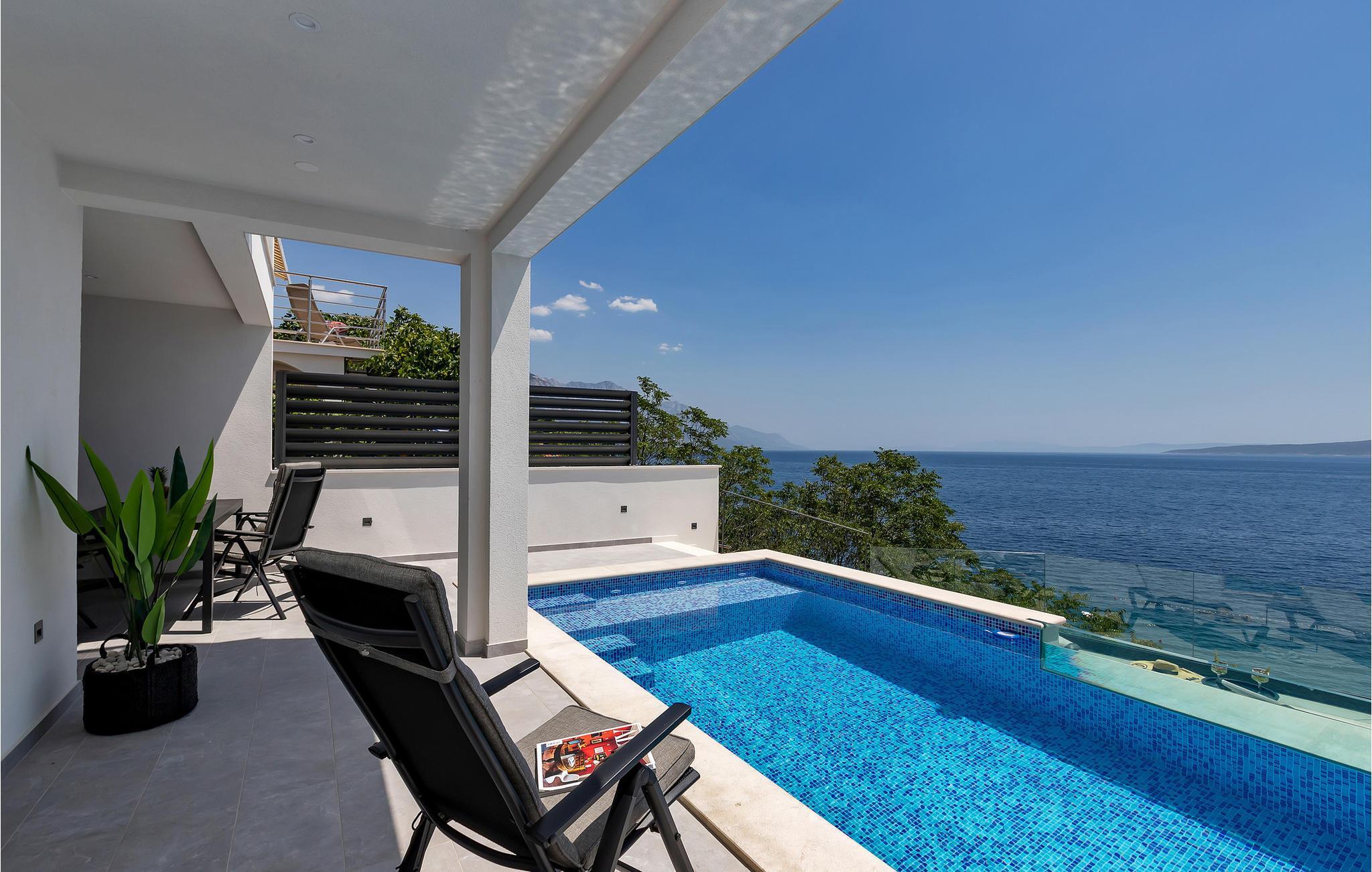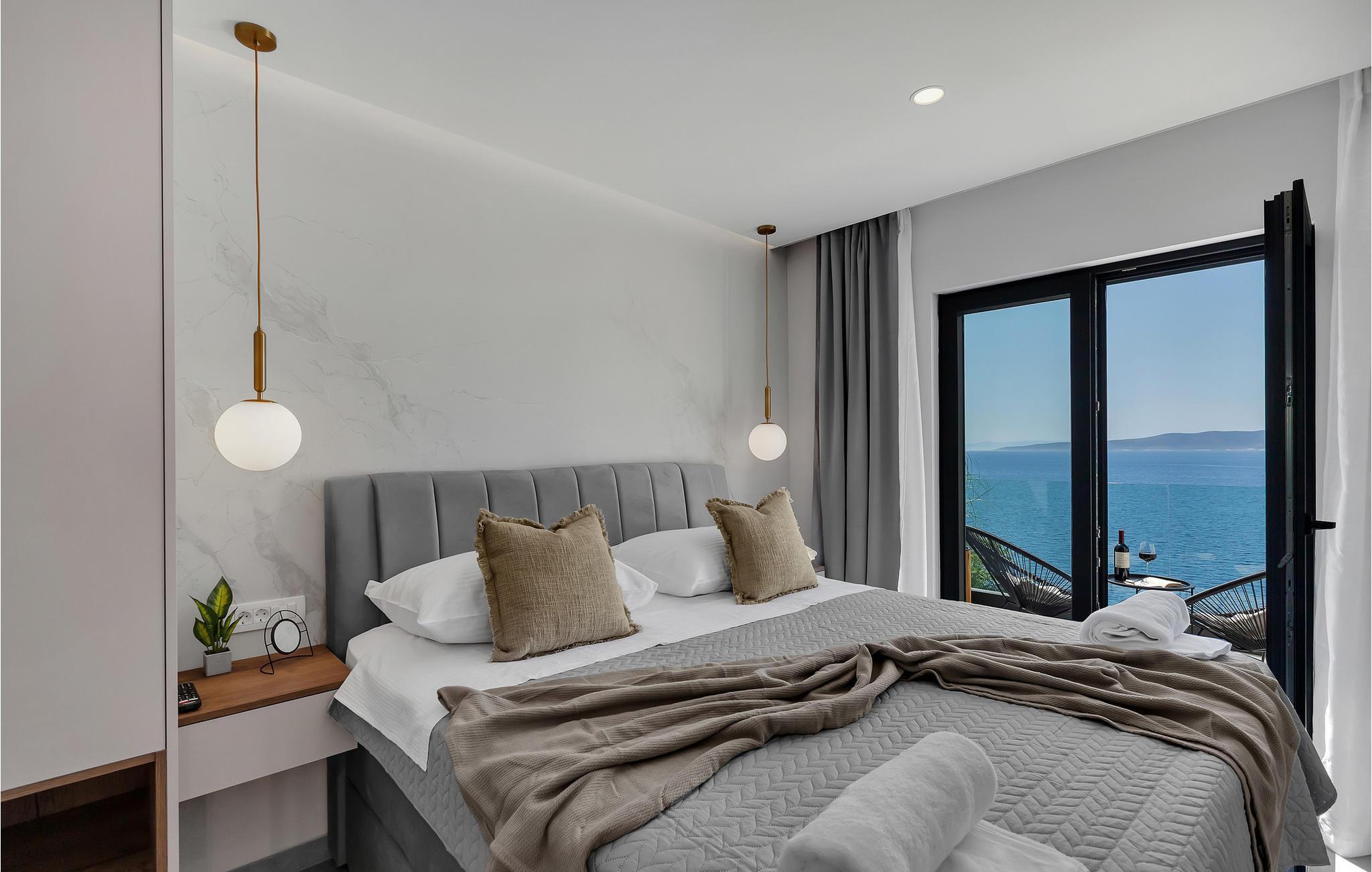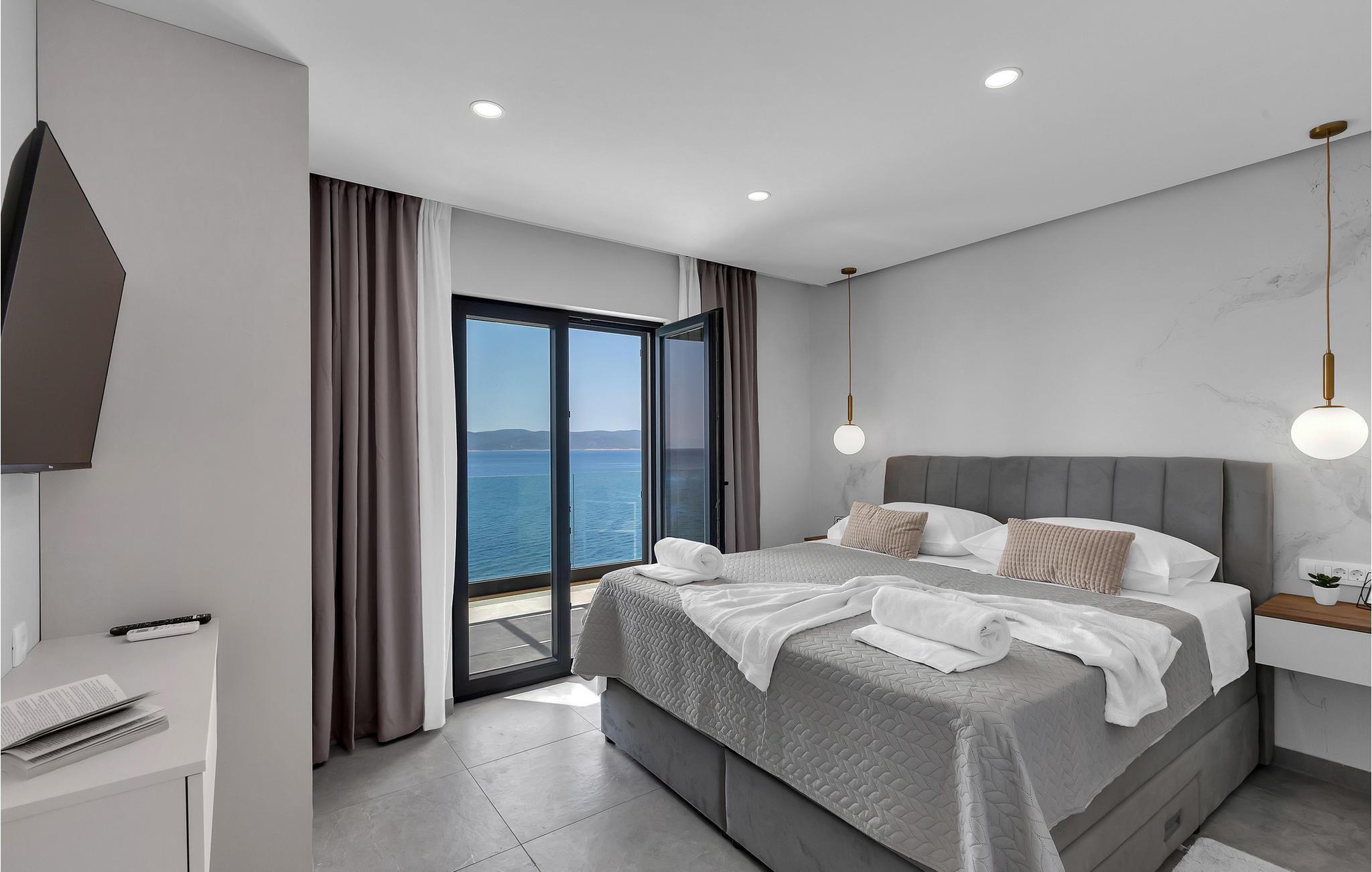 Dette elegante hus udstråler en rolig og luksuriøs atmosfære, forstærket af panoramaudsigten over det dybblå hav. Læn jer tilbage i sofaen og se sollyset glide blidt hen over vandet. Tilbring hyggelige timer med at læse eller deltage i stimulerende samtaler i stilfulde omgivelser. Lav mad sammen i det moderne køkken og nyd et lækkert måltid og et glas vin om aftenen.