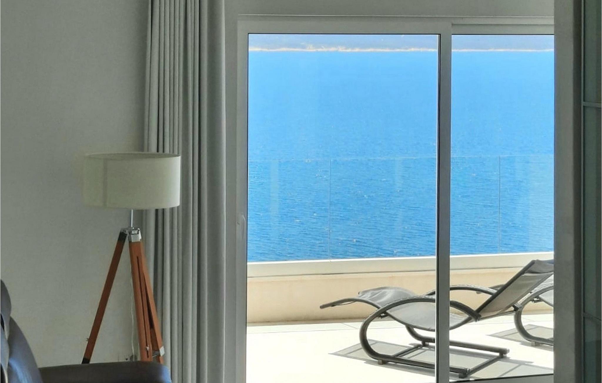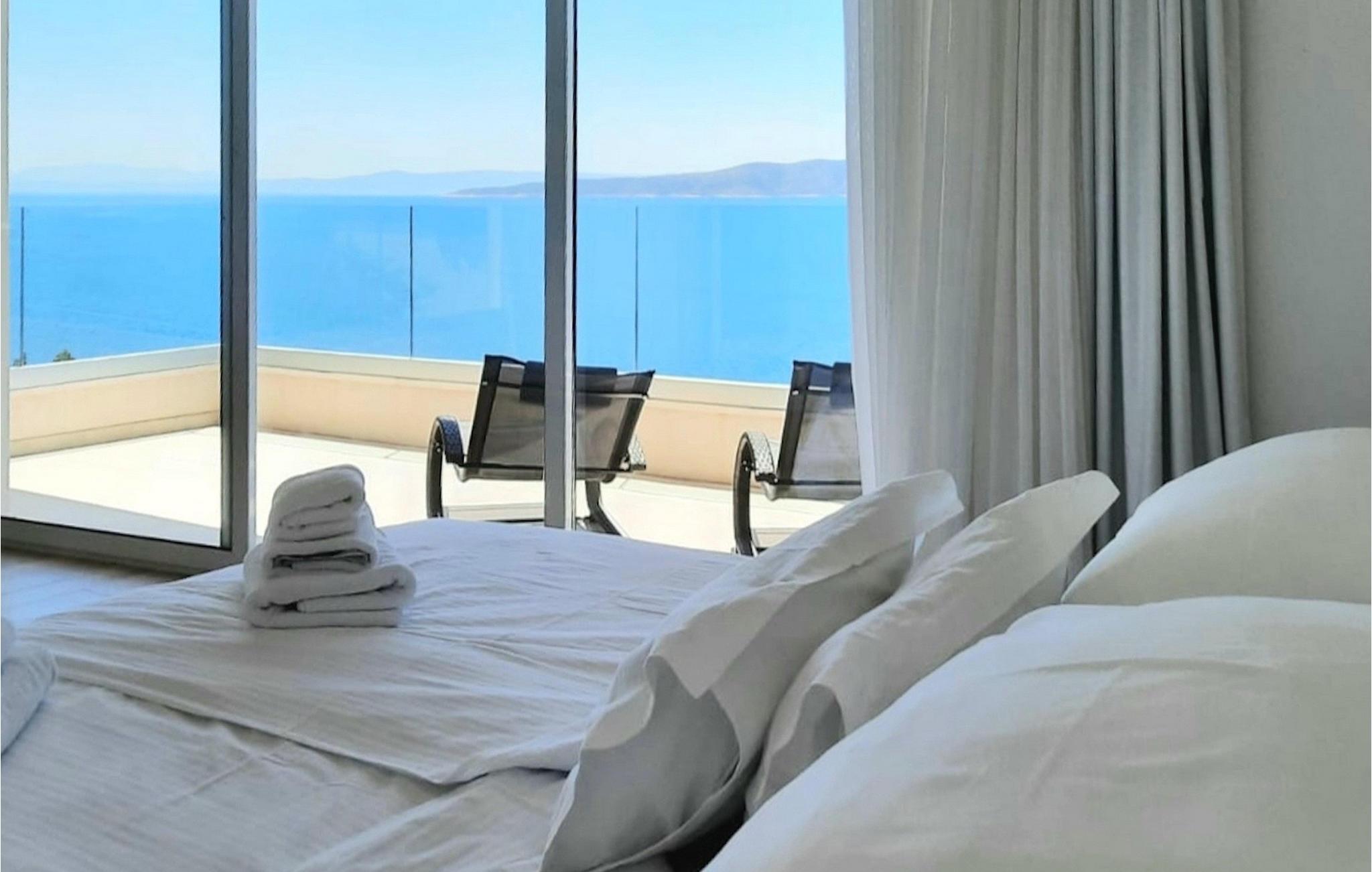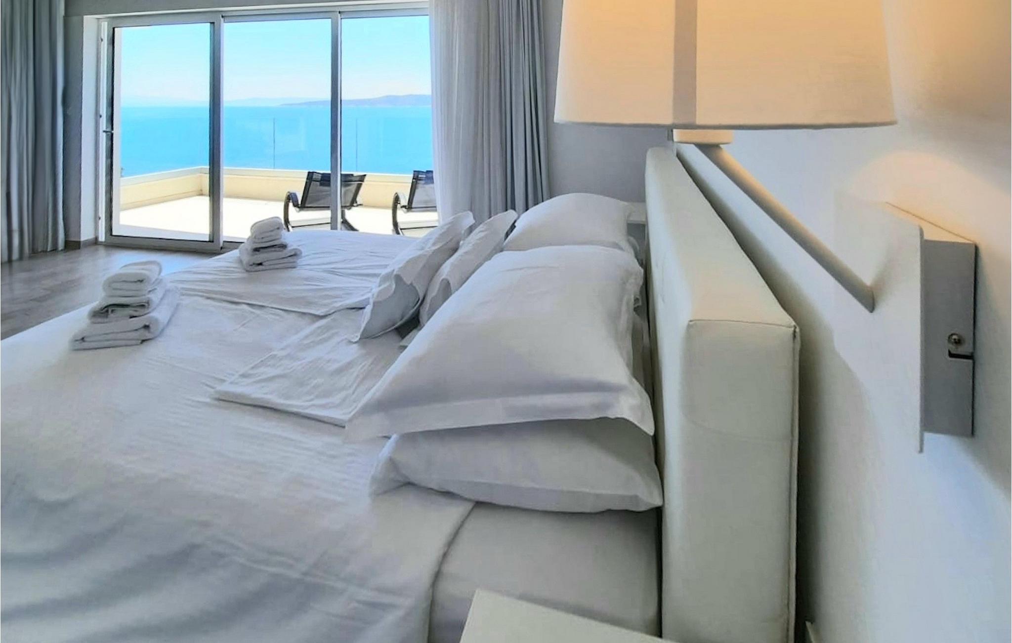 På villaens øverste etage finder du to, også moderne og neutralt indrettede soveværelser, begge med eget badeværelse. Et af soveværelserne har endda sin egen balkon med loungemøbler og direkte udsigt over havet. Velkommen til rolige morgener med kaffe på din egen terrasse med de første solstråler og en uovertruffen udsigt.