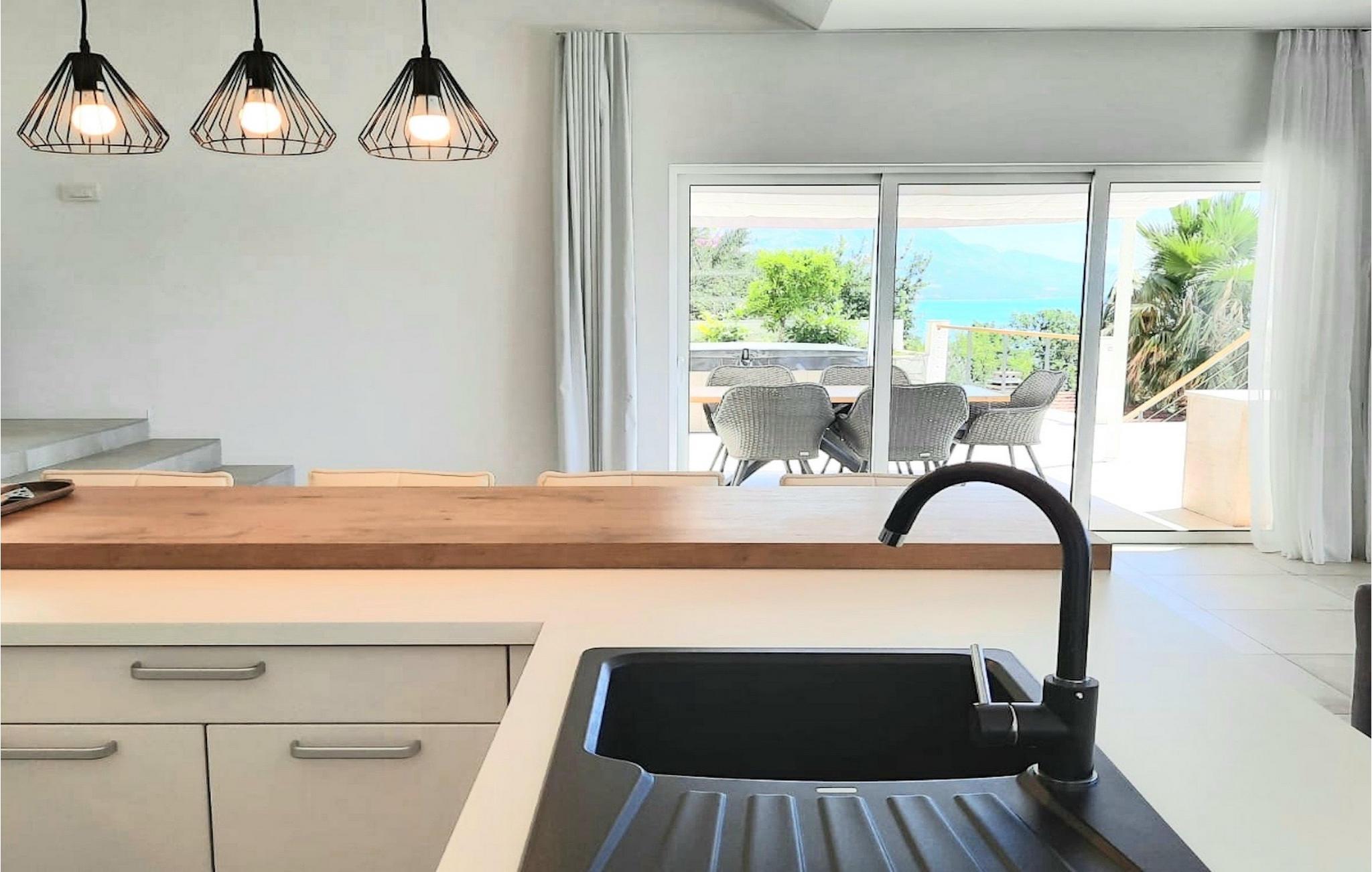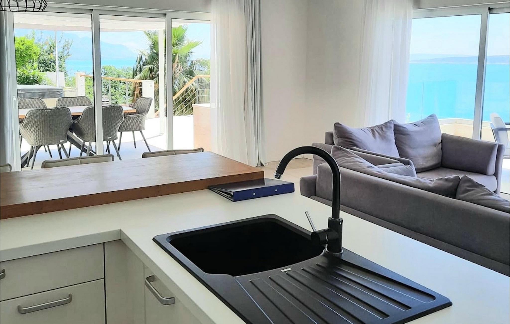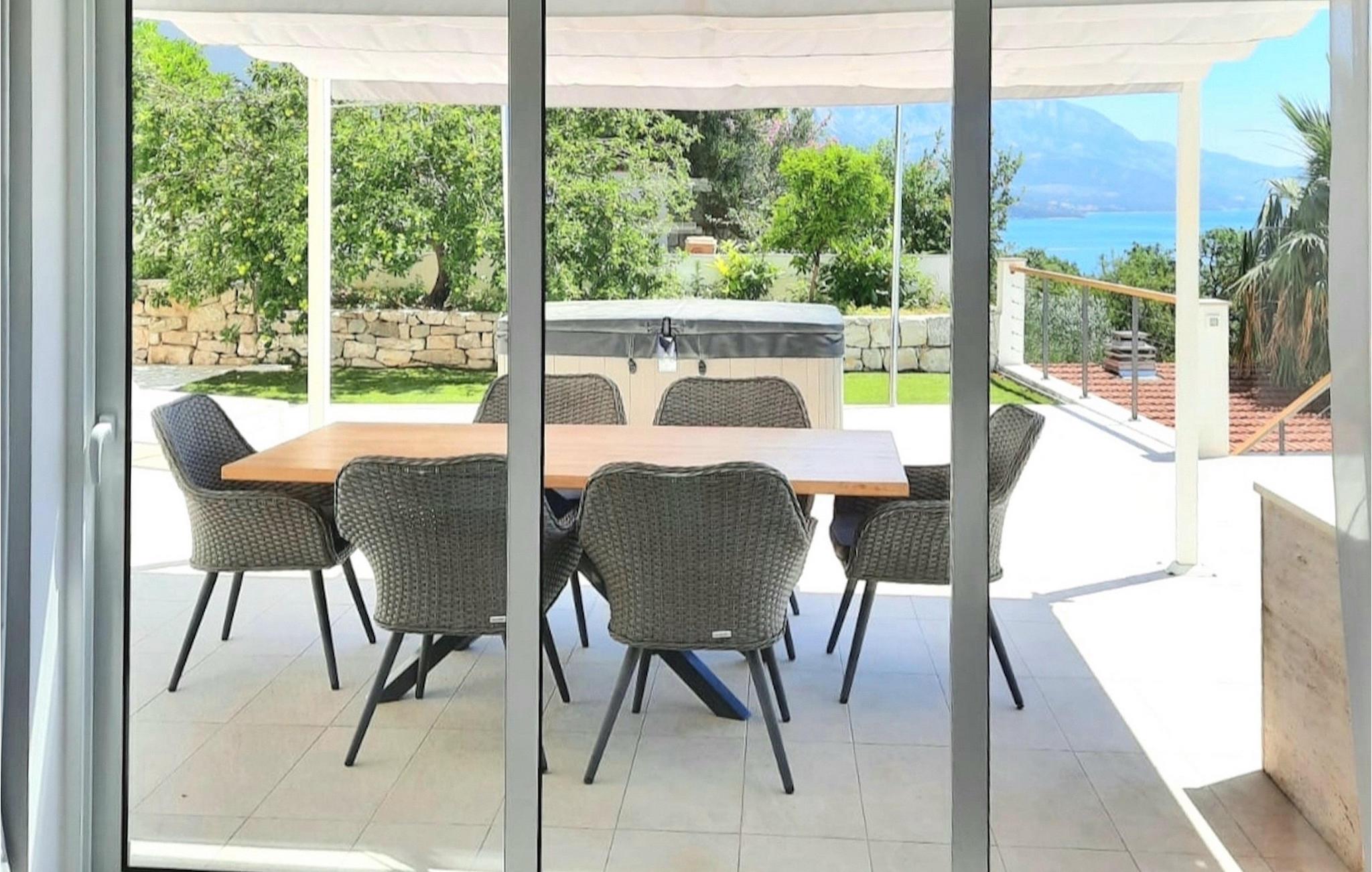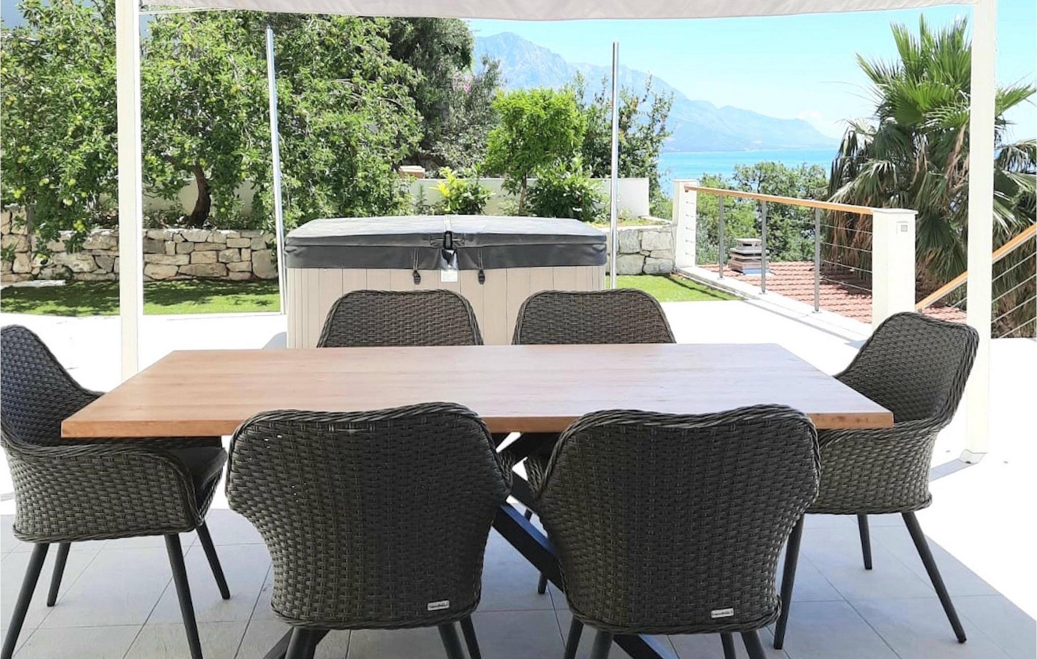 Villaen har to terrasser, som begge byder på fænomenal panoramaudsigt over havet. Der er en privat pool på den nederste terrasse, hvorom der er arrangeret liggestole, for maksimal nydelse i eller ved siden af poolen. Den overdækkede del af terrassen nær poolen er udstyret med et højt bord og stole og en grill, til de øjeblikke, hvor du har brug for ly for solen. Palmer, oliventræer og andre planter omkring terrasserne tjener til at skabe en endnu mere komplet middelhavsatmosfære. Hvis du klatrer op ad trappen til den øverste terrasse, venter endnu en overraskelse på dig - en udendørs jacuzzi! I slutningen af dagen kan du derfor nyde at se solnedgangen fra jacuzzien med et glas af din yndlingsdrink. Således er der på den ene del et spisebord til at nyde fælles måltider, og på den anden side finder du et loungeområde med direkte udsigt over havet, som et perfekt sted for en morgenkaffe. Glasdøre på disse områder af den øverste terrasse giver direkte adgang til stuen i villaens stueetage. Med mange lyskilder virker den åbne plantegning af stuen, spisestuen og det fuldt udstyrede køkken endnu mere rummelig og luftig. Det neutrale arrangement af villaens ydre og indre komplementerer hinanden perfekt og skaber kontinuitet i hele rummet.