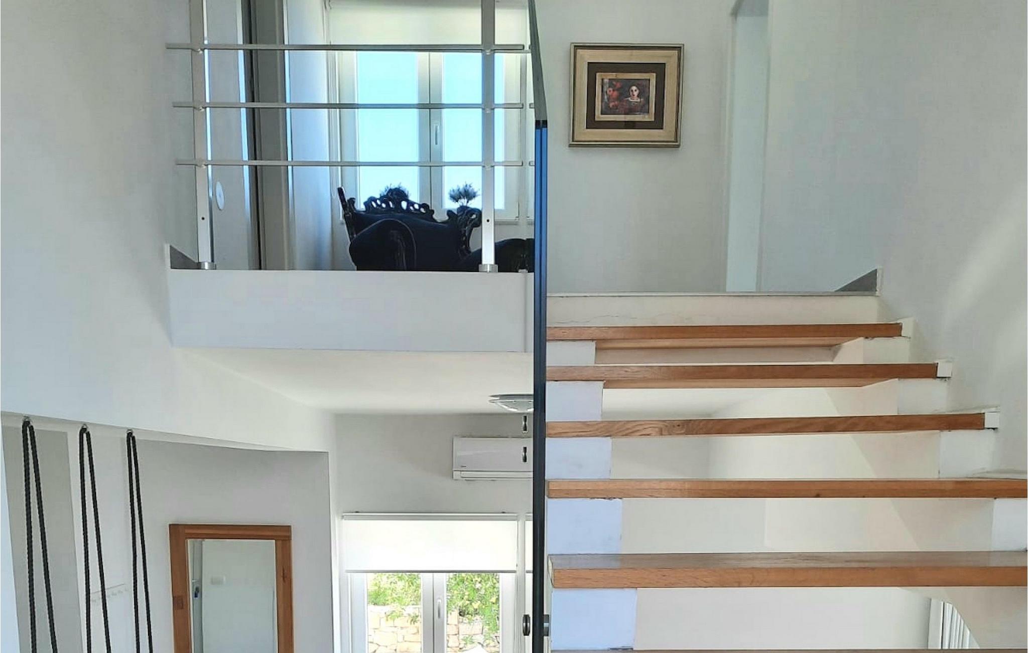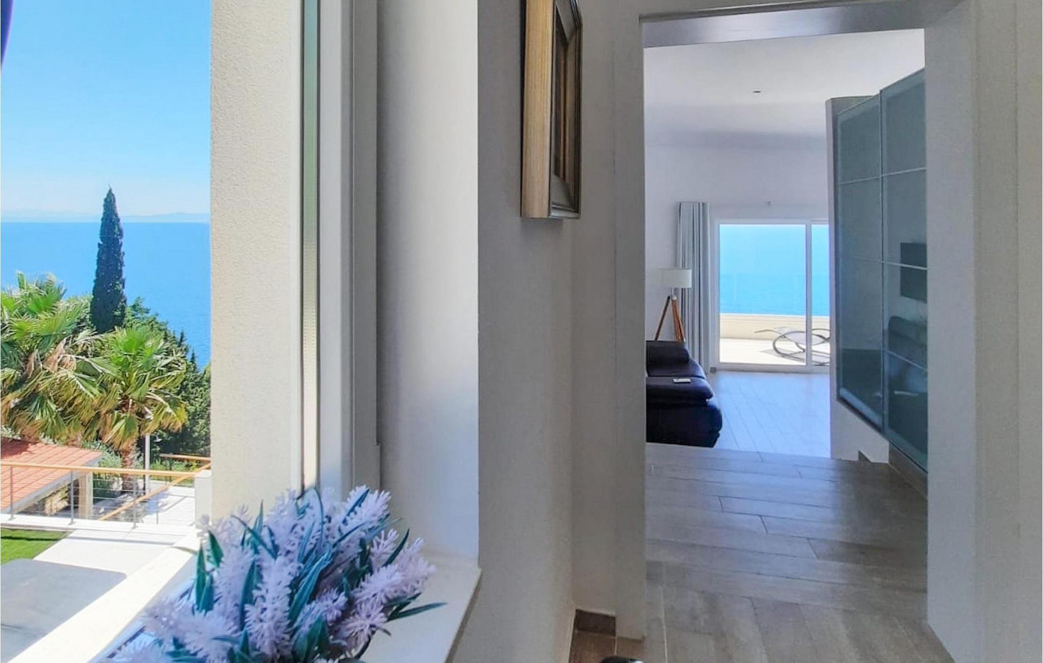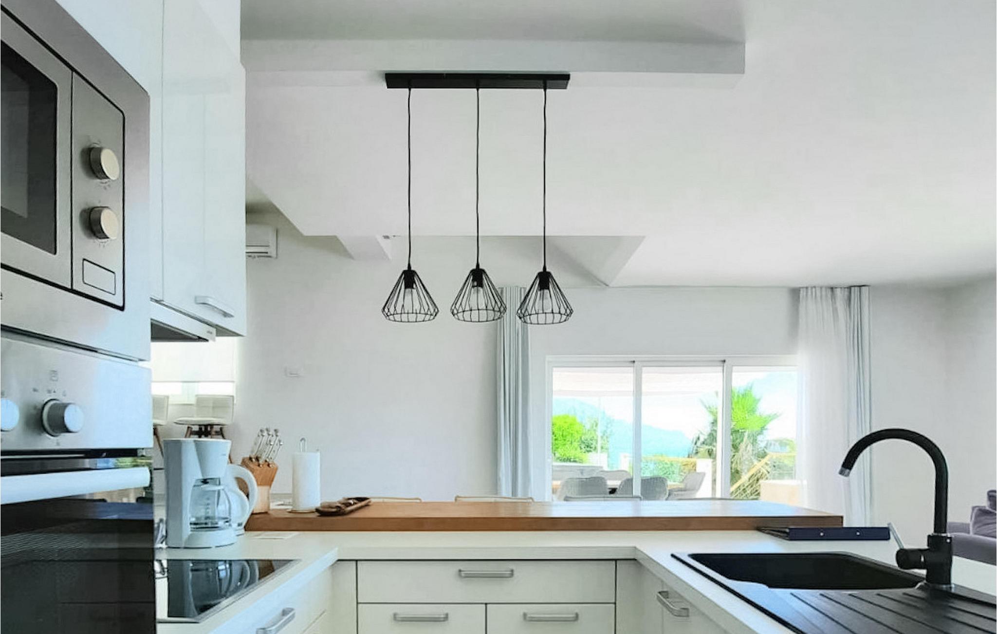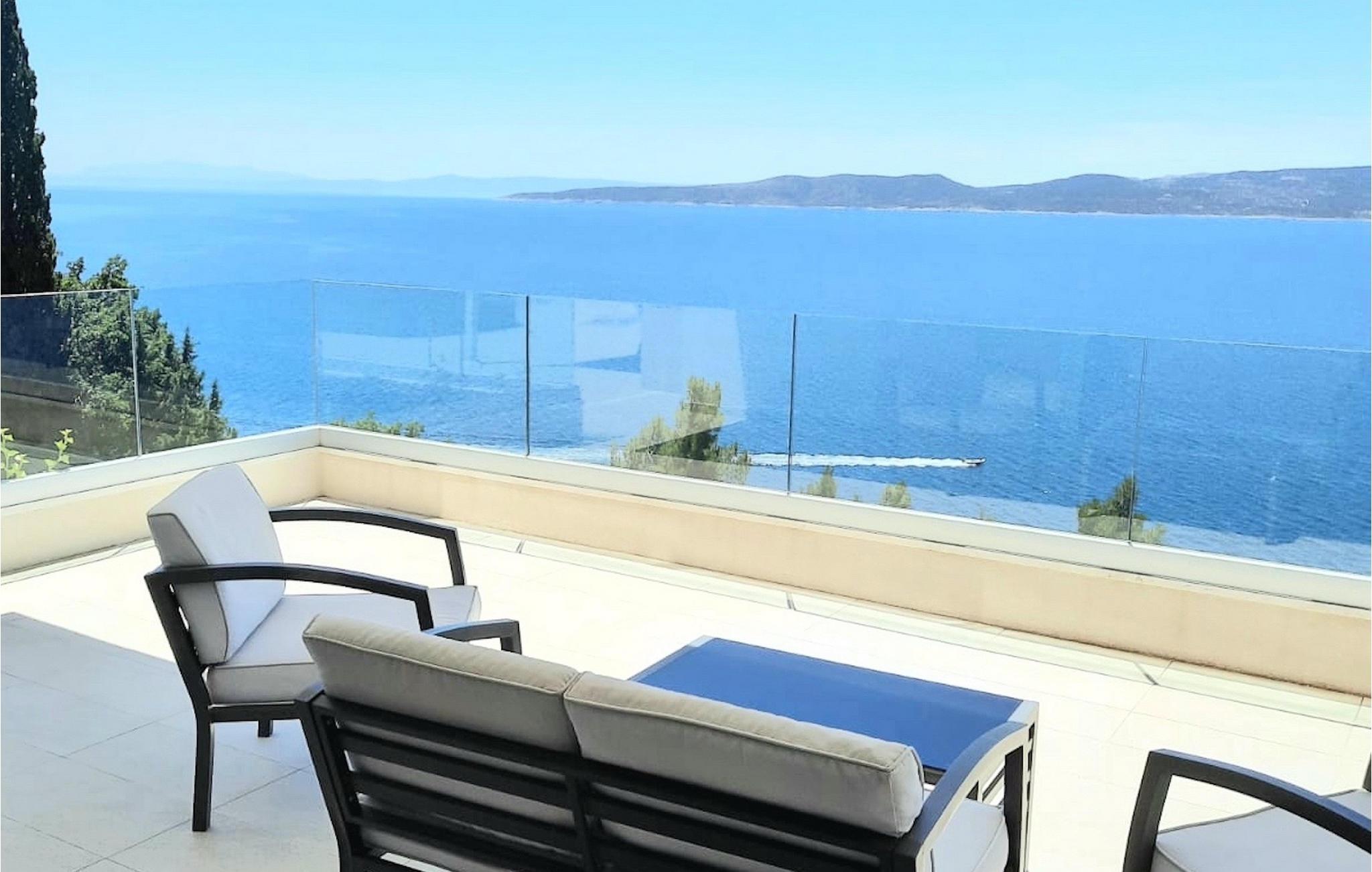 Villaen har to terrasser, som begge byder på fænomenal panoramaudsigt over havet. Der er en privat pool på den nederste terrasse, hvorom der er arrangeret liggestole, for maksimal nydelse i eller ved siden af poolen. Den overdækkede del af terrassen nær poolen er udstyret med et højt bord og stole og en grill, til de øjeblikke, hvor du har brug for ly for solen. Palmer, oliventræer og andre planter omkring terrasserne tjener til at skabe en endnu mere komplet middelhavsatmosfære. Hvis du klatrer op ad trappen til den øverste terrasse, venter endnu en overraskelse på dig - en udendørs jacuzzi! I slutningen af dagen kan du derfor nyde at se solnedgangen fra jacuzzien med et glas af din yndlingsdrink. Således er der på den ene del et spisebord til at nyde fælles måltider, og på den anden side finder du et loungeområde med direkte udsigt over havet, som et perfekt sted for en morgenkaffe. Glasdøre på disse områder af den øverste terrasse giver direkte adgang til stuen i villaens stueetage. Med mange lyskilder virker den åbne plantegning af stuen, spisestuen og det fuldt udstyrede køkken endnu mere rummelig og luftig. Det neutrale arrangement af villaens ydre og indre komplementerer hinanden perfekt og skaber kontinuitet i hele rummet.