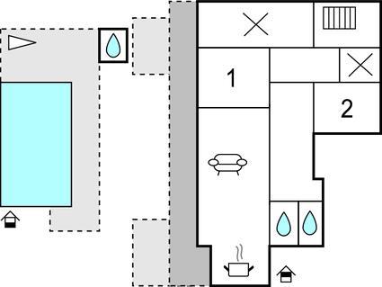 Denne komfortable ferielejlighed på første sal består af tre soveværelser, hvor af soveværelse nr. 3 har sin egen direkte indgang. Dette soveværelse kan I også komme ind i ad den lange terrasse, der strækker sig langs hele husets forside. På grund af det veludstyrede køkken, de rummelige værelser og de tre badeværelser er denne ferielejlighed velegnet til en ferie for en større familie eller til dejlige dage sammen med venner. Til poolen i stueetagen kommer I ad indendørs trapper. Poolen har I for jer selv, mens den fælles terrasse og grillen deles med ejeren.