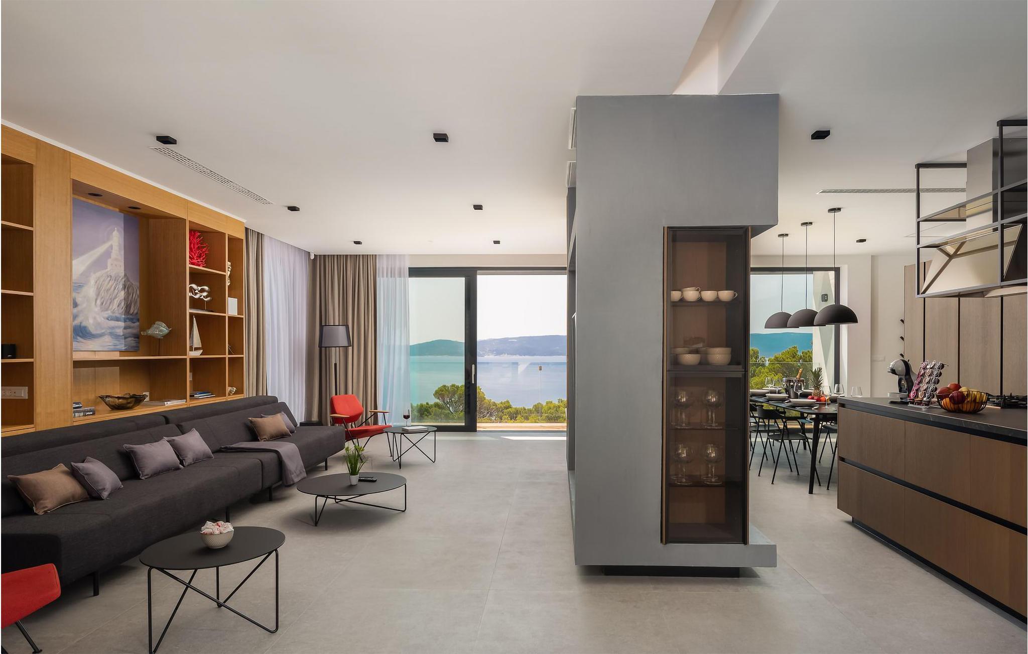 Velkommen til dette stilfuldt indrettede feriehus og glæd jer til en fantastisk ferie. Nyd den vidunderlige panoramaudsigt til havet og øen Brac fra den store, centrale terrasse, som er direkte forbundet med alle værelser og stuen. Hop en tur i den store pool eller svøm et par runder, så dagens motion er klaret. I kan også se frem til det store wellness-område med spabad, sauna, fitnessudstyr og tepidarium. Hvis I vil have en rolig alenestund, er der separate udendørsterrasser til hvert værelse.