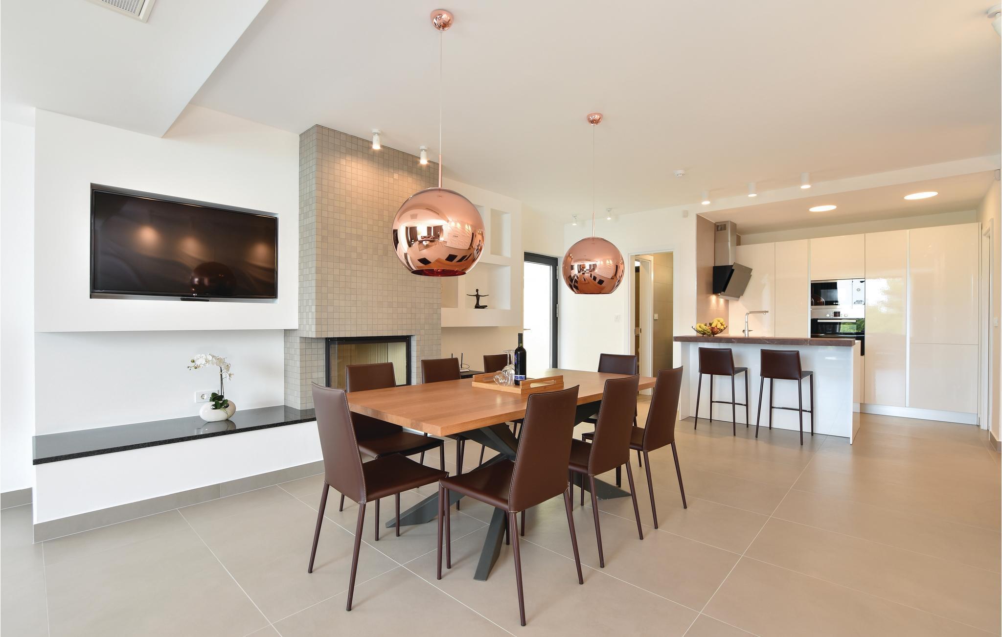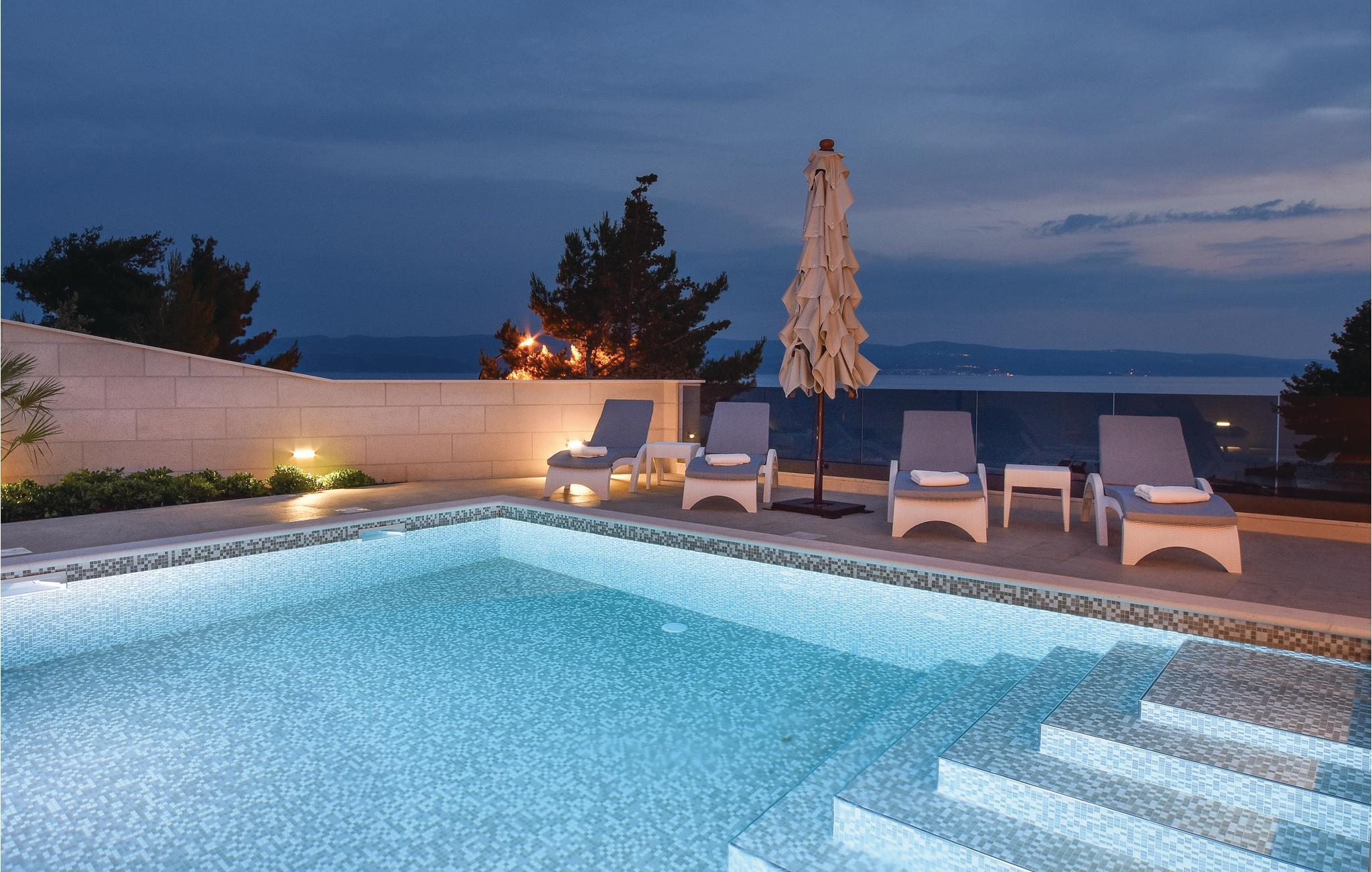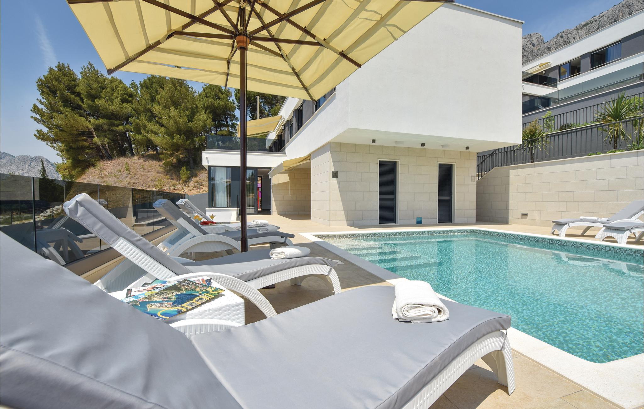 Denne attraktive ferievilla ligger i Omiš, i det mondæne boligområde Brzet. Feriehuset er rummeligt og godt udstyret. Set udefra dominerer de berømte sten fra Brac og et elegant hegn af mørkt glas. Husets indre er indrettet med god smag og de store glasfacader lukker lyse ind og giver en betagende udsigt over havet, øerne og stranden. Ikke langt fra feriehuset er en skøn, lang kiesstrand ud til det klare vand, her kan I nyde lange afslappede badedage. Selvom huset ligger i et populært område som er eftertragtet af både feriegæster og lokale, er her en høj grad af privatsfære, da huset næsten ligger for enden af en gade. Grunden er videoovervåget. Kun 50 meter fra huset, lige ud til stranden, ligger en restaurant, hvorfra I kan få maden leveret til huset. Husets venlige og imødekommende ejer bor i Omis centrum og hjælper jer gerne med at arrangere en udflugt fx til slugten med floden Cetina, hvor I kan opleve en fascinerende natur, prøve at riverrafte eller suse over floden i zipline. Omis er en lille Mellemdalmatisk by, der ligger ved floden Cetinas udmunding, med skønne strande som er oplagt til lange afslappede badedage. Byen er også berømt, fordi mange feriegæster vælger at komme igen år efter år for at tilbringe deres kostbare ferietid netop her. I løbet af sommeren afholdes her mange interessante og sjove former for underholdning. Fx livekoncerter og DJ-festivaler hvor verdens dygtigste får dansegulvet til at ryste til den lyse morgen. Her er mange andre former for underholdning for alle uanset alder og interesser. Her kan I holde en ferie for hele familien som vi stå lysende i erindringen.