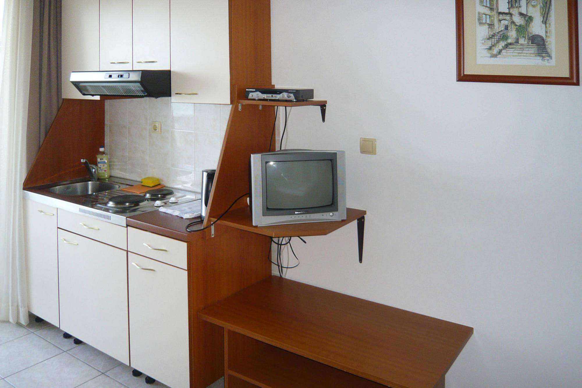 Tekøkken(kakkelovn, elkedel, køle-fryseskab), stue / spisestue(dobbeltsovesofa, Fjernsyn(parabol), spisebord), soveværelse(dobbeltseng), badeværelse(bruser, toilet), fællesrum(Bordtennis), Internetadgang, Strand, balkon, klimaanlæg, terrasse, havemøbler, grill(deles med andre gæster), parkering