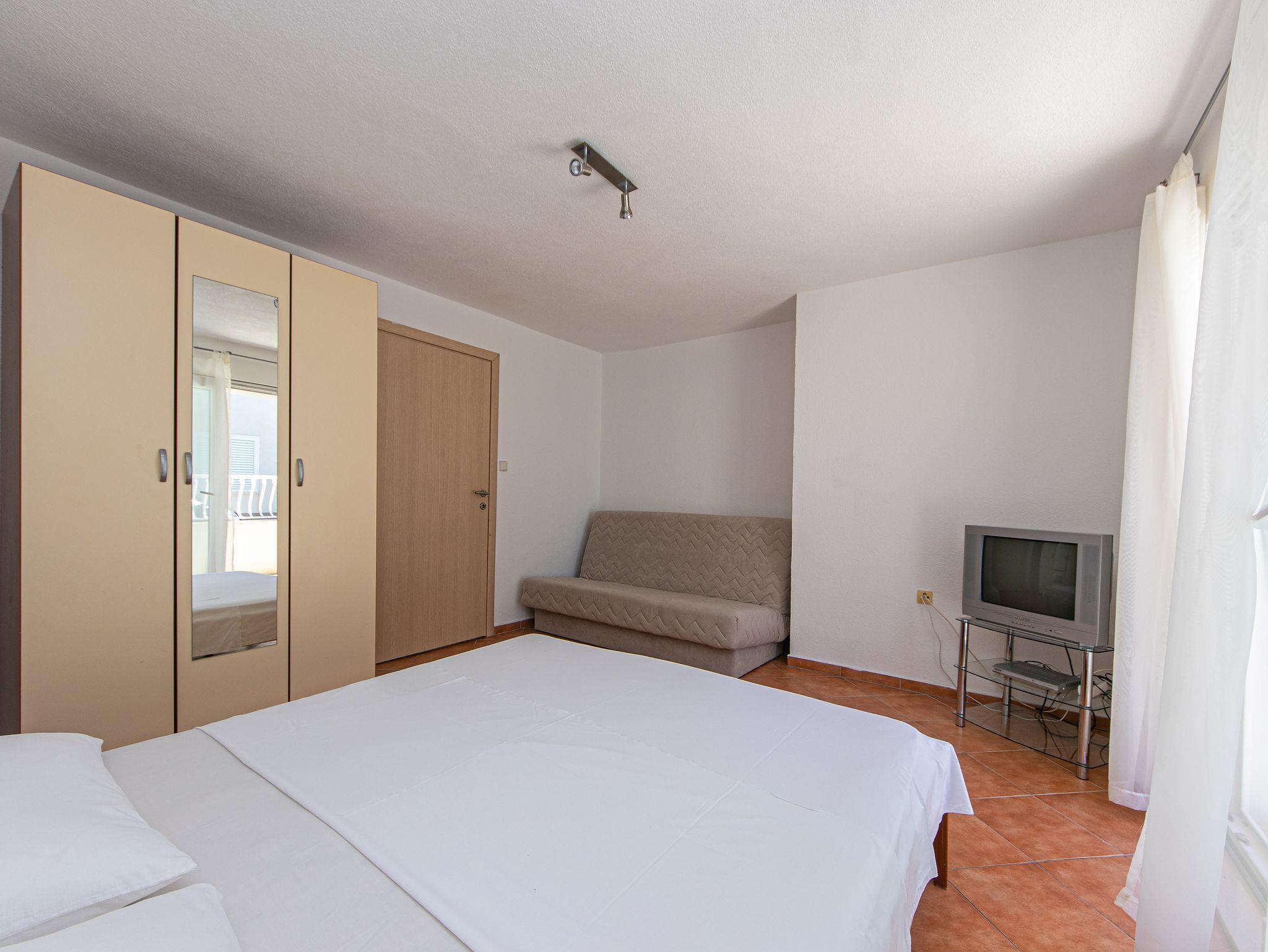 Studio bietet Platz für 5 Gäste. Die Betten sind in Schlafzimmern, die es 1 gibt, und in Wohnzimmer, innerhalb einer Gesamtfläche von 42m2, angeordnet. Die Gäste haben eine eigene Terrasse zur Verfügung, auf der sie in warmen Sommernächten genießen können. Das Studio-Apartment bietet Meerblick. Es ist erlaubt, Speisen auf dem Gemeinschafts-Grill vorzubereiten. IM PREIS INBEGRIFFEN: Kurtaxe, Endreinigung, Klimatisierung, Garage, Internet, Kinderbett, Föhn. VERBINDLICHE ZUSÄTZLICHE KOSTEN: Aufzahlung für Kurzaufenthalte (prozentualer Zuschlag pro Nächtigungsanzahl: 30% - 1, 20% - 2, 10% - 3). UNVERBINDLICHE ZUSÄTZLICHE KOSTEN: Wäschewaschen (5,00 € Waschen). Die Verfügbarkeit zusätzlicher Dienstleistungen in Ihrem reservierten Termin und die Preise derselben (falls nicht aufgeführt) müssen im Voraus überprüft werden. Zusätzliche Dienstleistungen die in der Zahlungsaufforderung nicht aufgeführt sind werden direkt beim Vermieter bezahlt, angenommen der Gast nutzt auch diese.