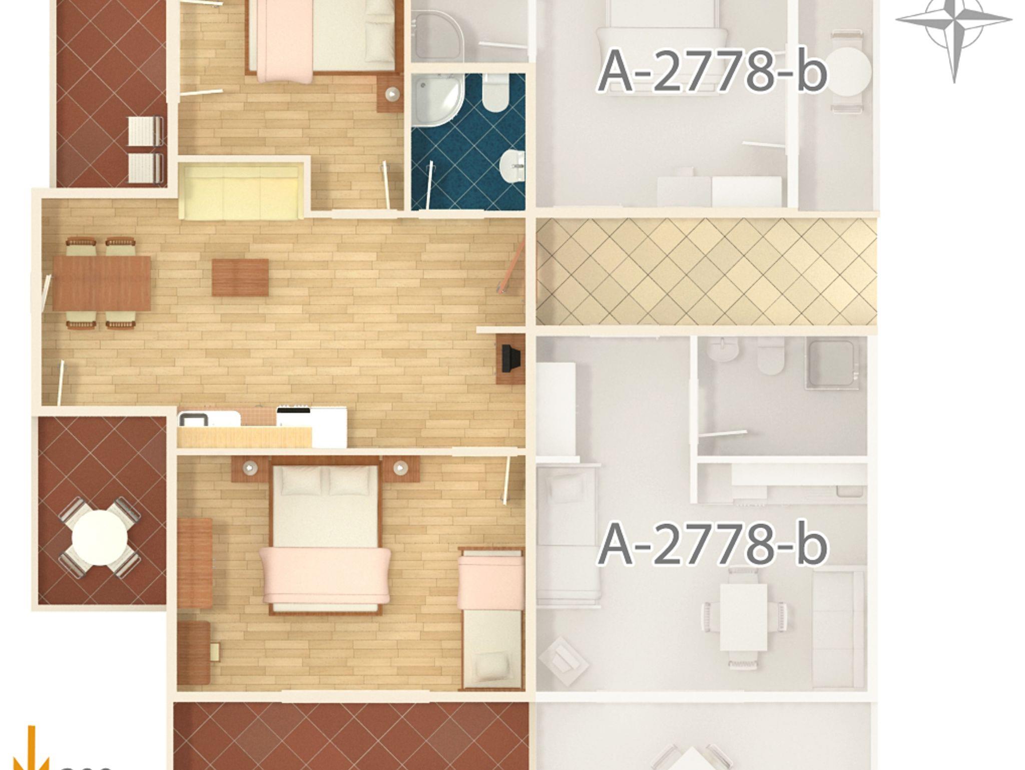Ferienwohnung bietet Platz für 6 Gäste. Die Betten sind in Schlafzimmern, die es 2 gibt, und in Wohnzimmer, innerhalb einer Gesamtfläche von 49m2, angeordnet. Die Gäste haben einen eigenen Balkon zur Verfügung, auf der sie in warmen Sommernächten genießen können. Das Apartment bietet Meerblick. Es ist erlaubt, Speisen auf dem Gemeinschafts-Grill vorzubereiten. IM PREIS INBEGRIFFEN: Kurtaxe, Endreinigung, Klimatisierung, Parkplatz, Internet. UNVERBINDLICHE ZUSÄTZLICHE KOSTEN: Wäschewaschen (5,00 € Waschen). Die Verfügbarkeit zusätzlicher Dienstleistungen in Ihrem reservierten Termin und die Preise derselben (falls nicht aufgeführt) müssen im Voraus überprüft werden. Zusätzliche Dienstleistungen die in der Zahlungsaufforderung nicht aufgeführt sind werden direkt beim Vermieter bezahlt, angenommen der Gast nutzt auch diese. Ermäßigung auf den Grundpreis: Gratistag 14=13 (bei einem Aufenthalt von 14 Tagen oder mehr erhalten Sie einen Gratistag für den Aufenthalt bis 31.12.26).