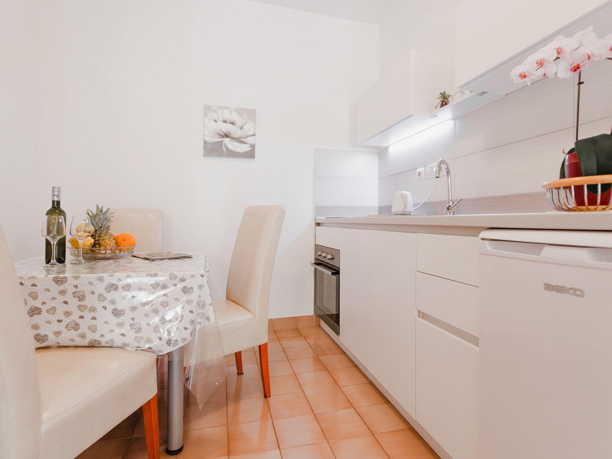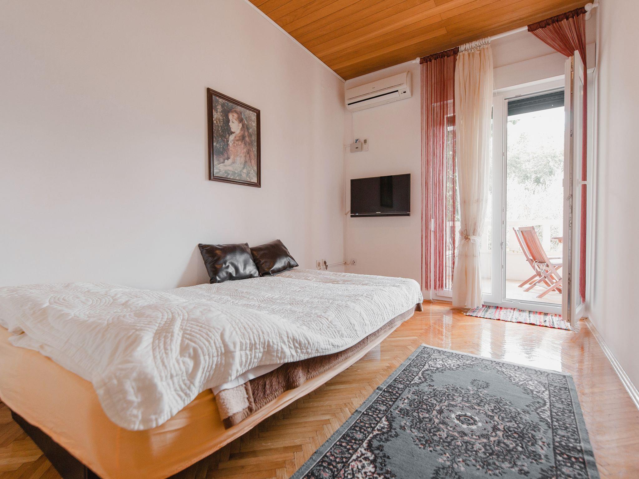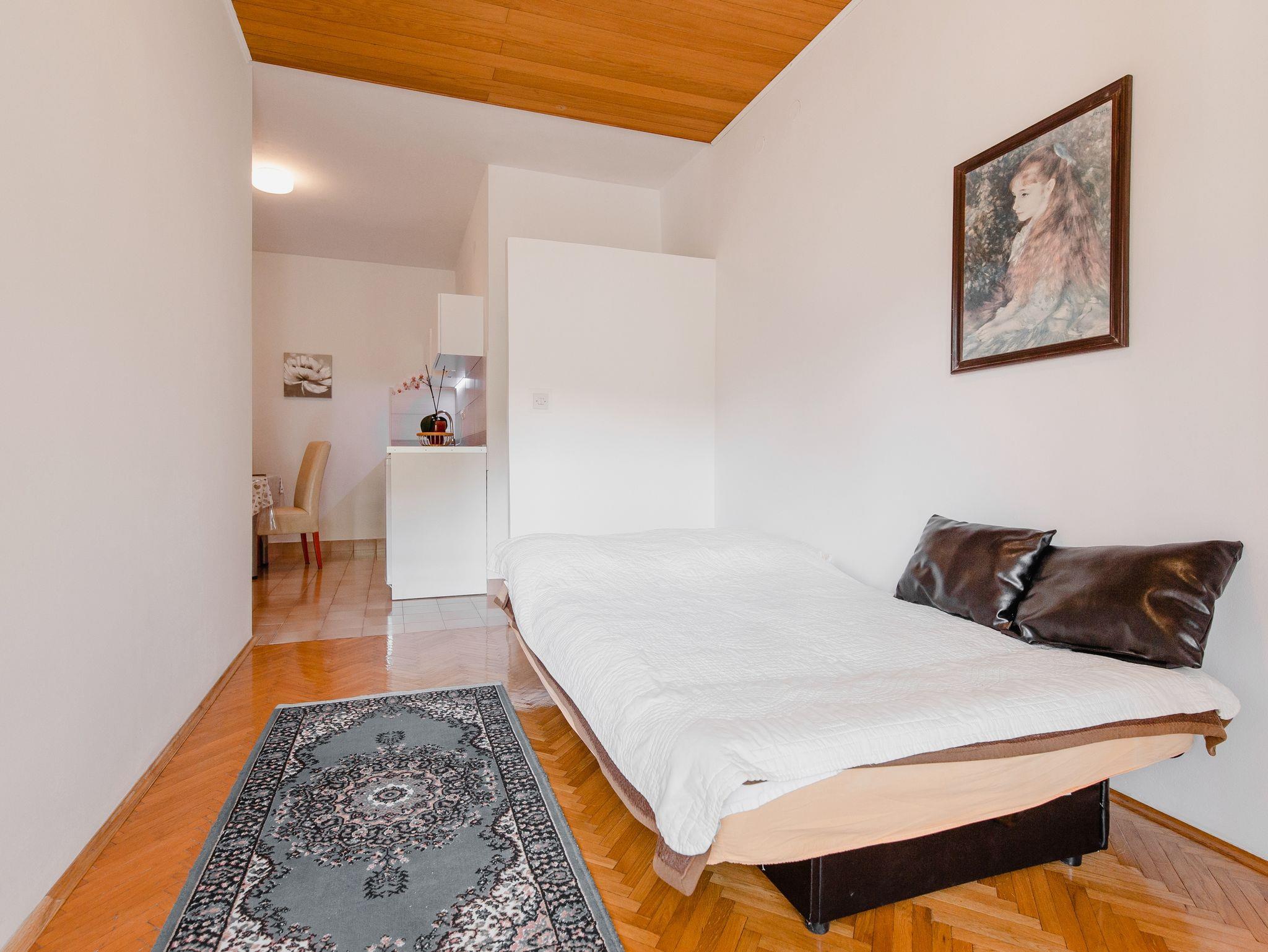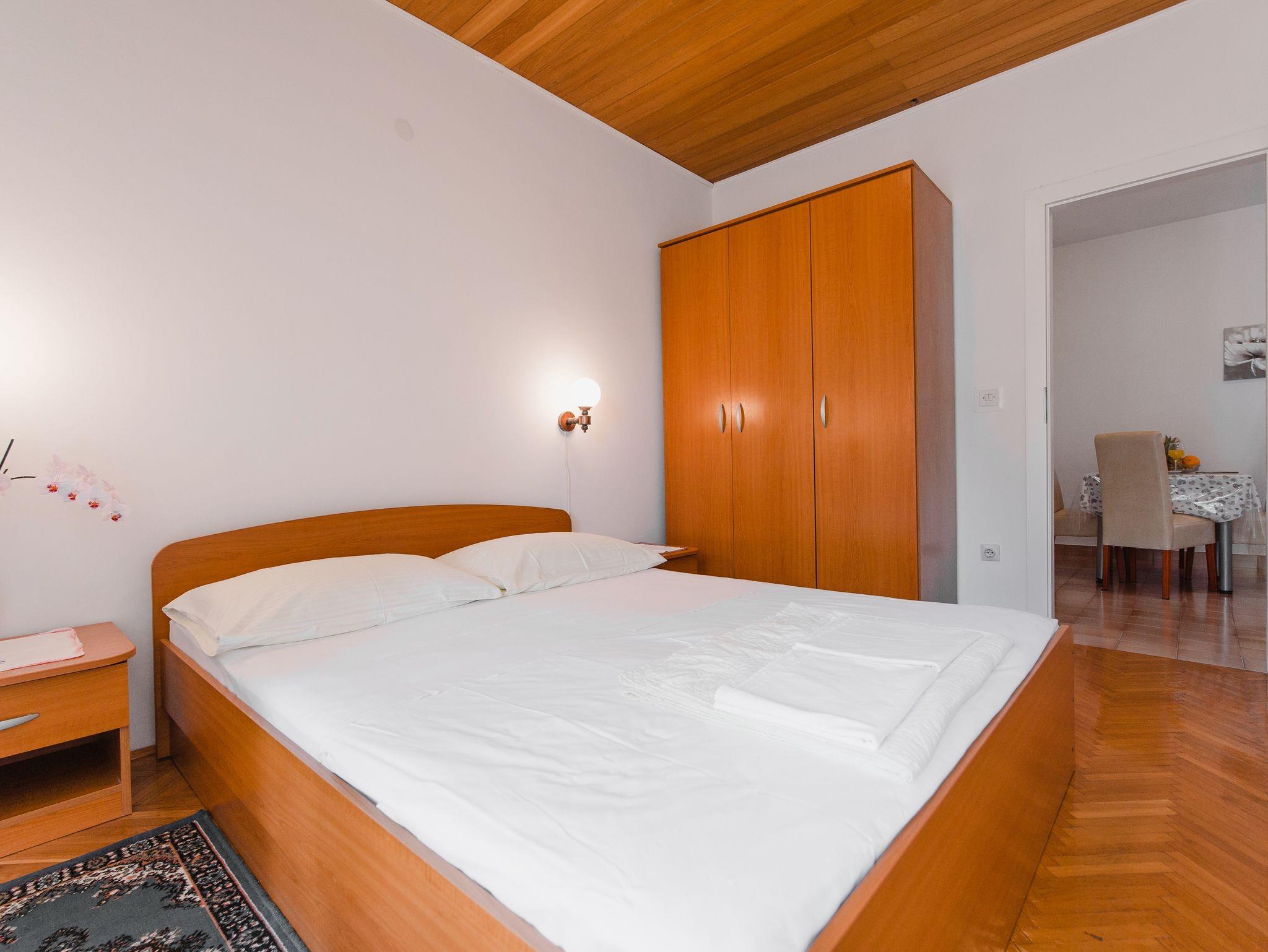 Ferienwohnung bietet Platz für 4 Gäste. Die Betten sind in Schlafzimmern, die es 1 gibt, und in Wohnzimmer, innerhalb einer Gesamtfläche von 32m2, angeordnet. Die Gäste haben eine eigene Terrasse zur Verfügung, auf der sie in warmen Sommernächten genießen können. Es ist erlaubt, Speisen auf dem Gemeinschafts-Grill vorzubereiten. IM PREIS INBEGRIFFEN: Kurtaxe, Endreinigung, Klimatisierung, Parkplatz, Internet, Kinderbett, Bügeleisen, Bügelbrett, Föhn. VERBINDLICHE ZUSÄTZLICHE KOSTEN: Aufzahlung für Kurzaufenthalte (prozentualer Zuschlag pro Nächtigungsanzahl: 30% - 1, 20% - 2, 10% - 3). UNVERBINDLICHE ZUSÄTZLICHE KOSTEN: Boot (50,00 € pro Nacht), Bootsanlegeplatz (20,00 € pro Nacht), Fahrrad (20,00 € täglich (pro Stück)). Die Verfügbarkeit zusätzlicher Dienstleistungen in Ihrem reservierten Termin und die Preise derselben (falls nicht aufgeführt) müssen im Voraus überprüft werden. Zusätzliche Dienstleistungen die in der Zahlungsaufforderung nicht aufgeführt sind werden direkt beim Vermieter bezahlt, angenommen der Gast nutzt auch diese. Ermäßigung auf den Grundpreis: Gratistag 14=13 (bei einem Aufenthalt von 14 Tagen oder mehr erhalten Sie einen Gratistag für den Aufenthalt bis 31.12.26).