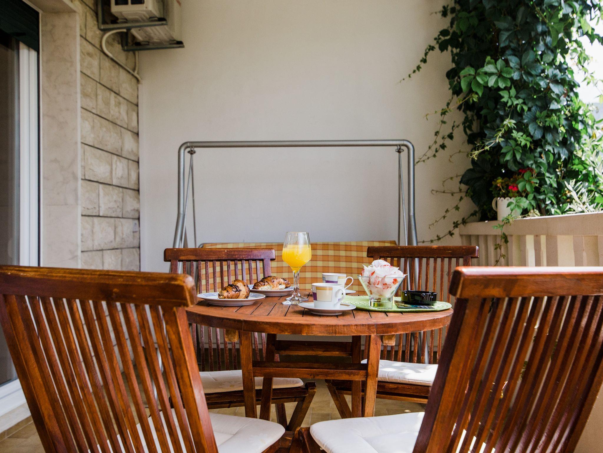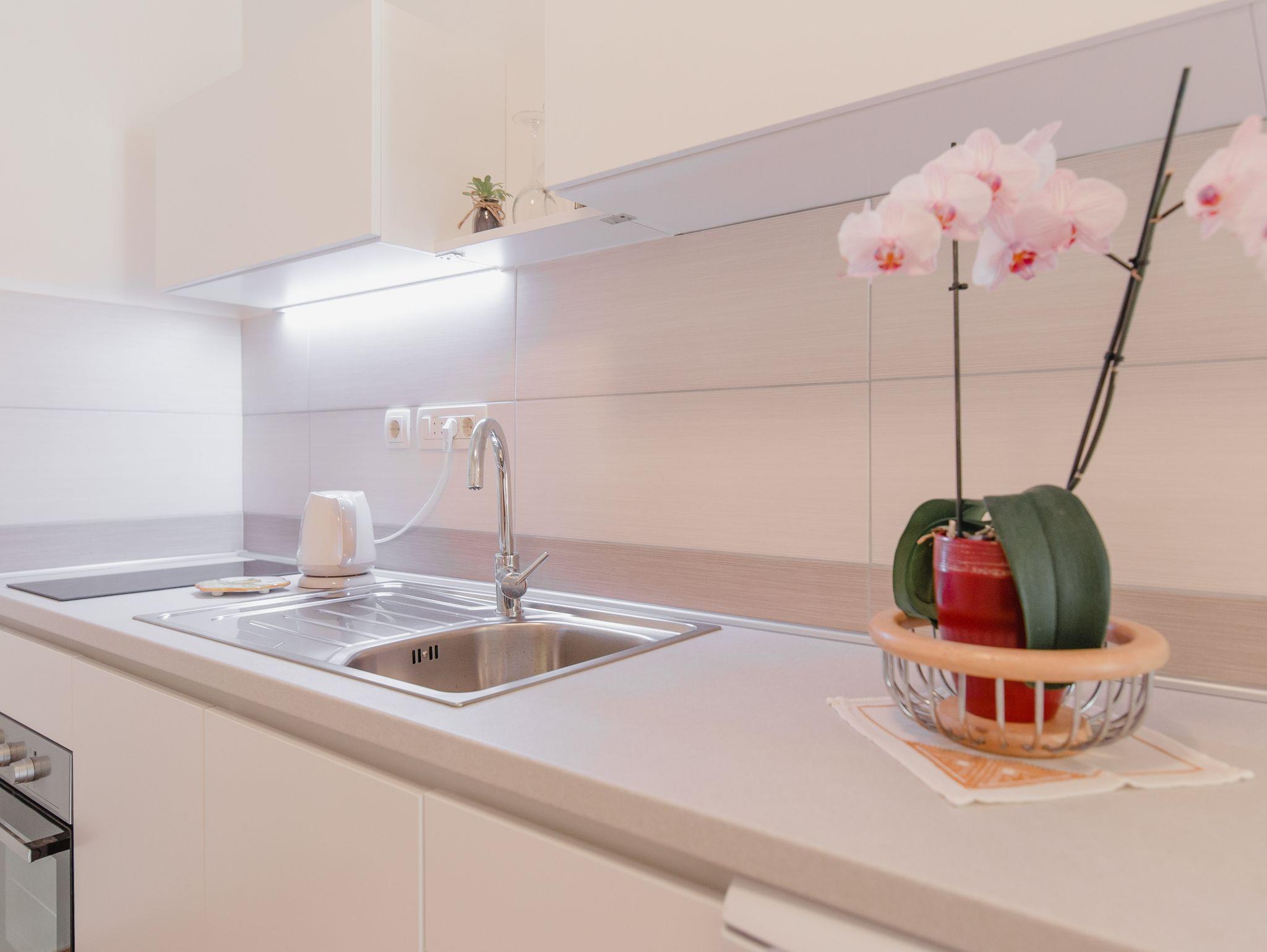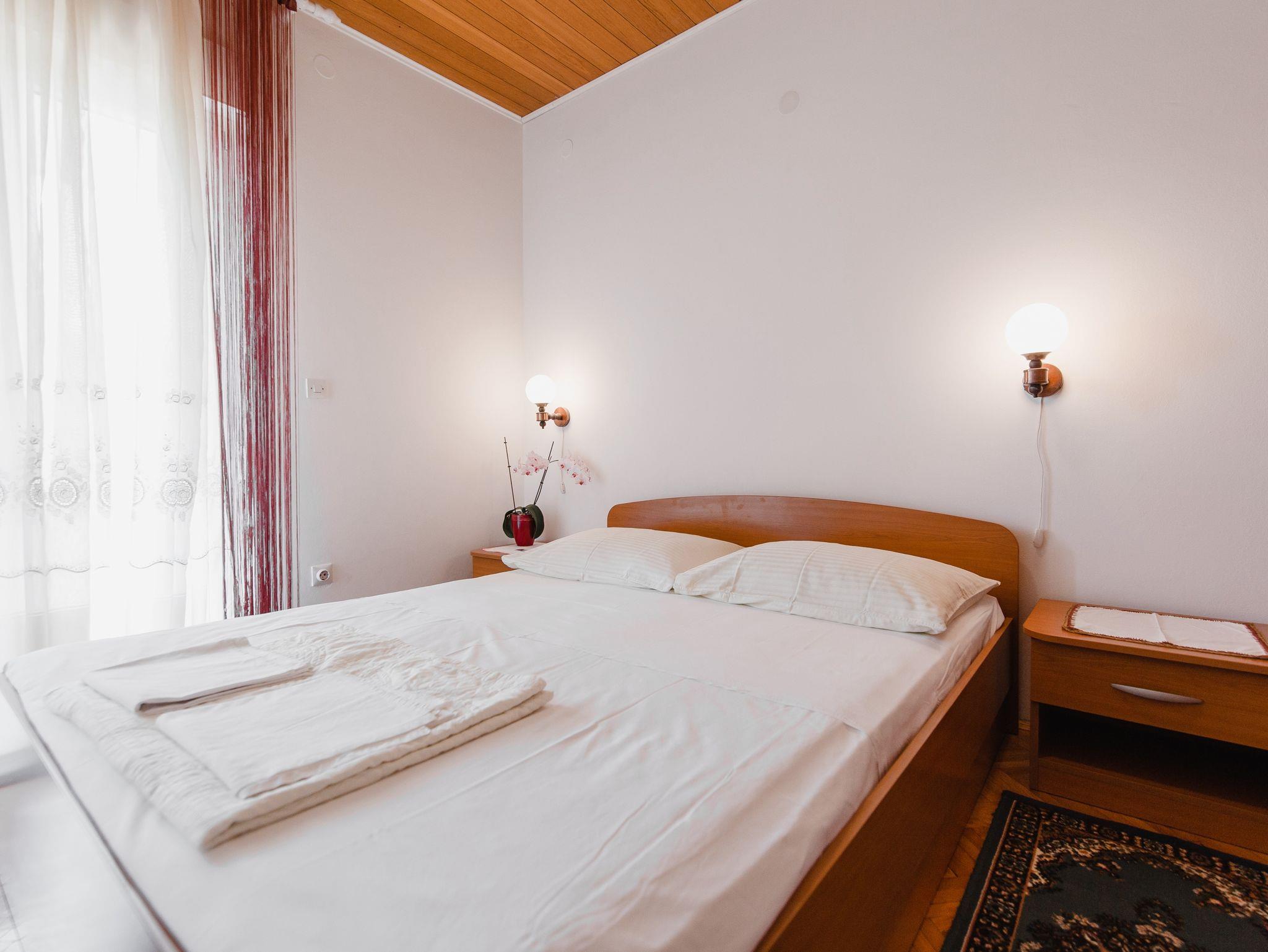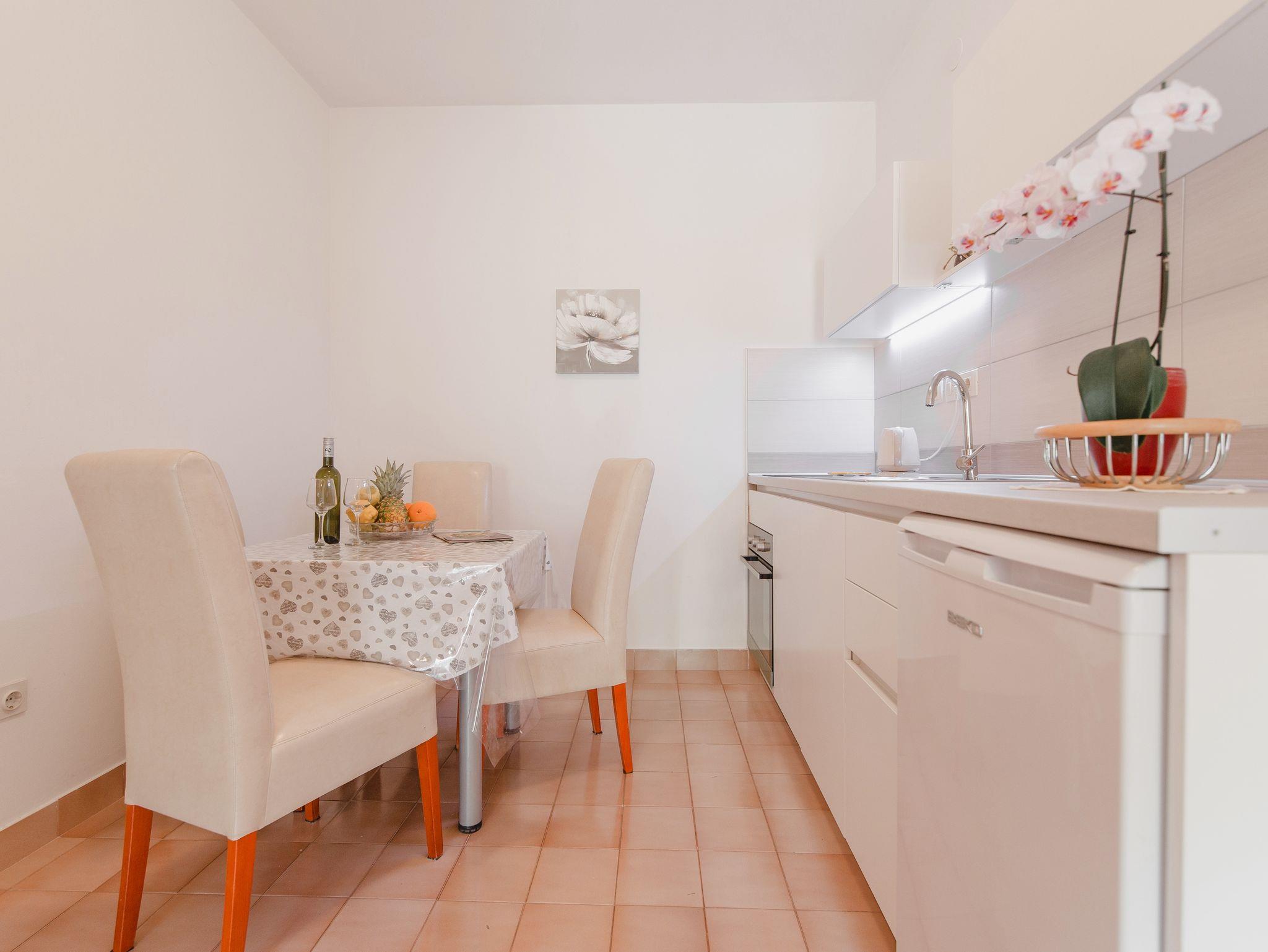 Ferienwohnung bietet Platz für 4 Gäste. Die Betten sind in Schlafzimmern, die es 1 gibt, und in Wohnzimmer, innerhalb einer Gesamtfläche von 32m2, angeordnet. Die Gäste haben eine eigene Terrasse zur Verfügung, auf der sie in warmen Sommernächten genießen können. Es ist erlaubt, Speisen auf dem Gemeinschafts-Grill vorzubereiten. IM PREIS INBEGRIFFEN: Kurtaxe, Endreinigung, Klimatisierung, Parkplatz, Internet, Kinderbett, Bügeleisen, Bügelbrett, Föhn. VERBINDLICHE ZUSÄTZLICHE KOSTEN: Aufzahlung für Kurzaufenthalte (prozentualer Zuschlag pro Nächtigungsanzahl: 30% - 1, 20% - 2, 10% - 3). UNVERBINDLICHE ZUSÄTZLICHE KOSTEN: Boot (50,00 € pro Nacht), Bootsanlegeplatz (20,00 € pro Nacht), Fahrrad (20,00 € täglich (pro Stück)). Die Verfügbarkeit zusätzlicher Dienstleistungen in Ihrem reservierten Termin und die Preise derselben (falls nicht aufgeführt) müssen im Voraus überprüft werden. Zusätzliche Dienstleistungen die in der Zahlungsaufforderung nicht aufgeführt sind werden direkt beim Vermieter bezahlt, angenommen der Gast nutzt auch diese. Ermäßigung auf den Grundpreis: Gratistag 14=13 (bei einem Aufenthalt von 14 Tagen oder mehr erhalten Sie einen Gratistag für den Aufenthalt bis 31.12.26).