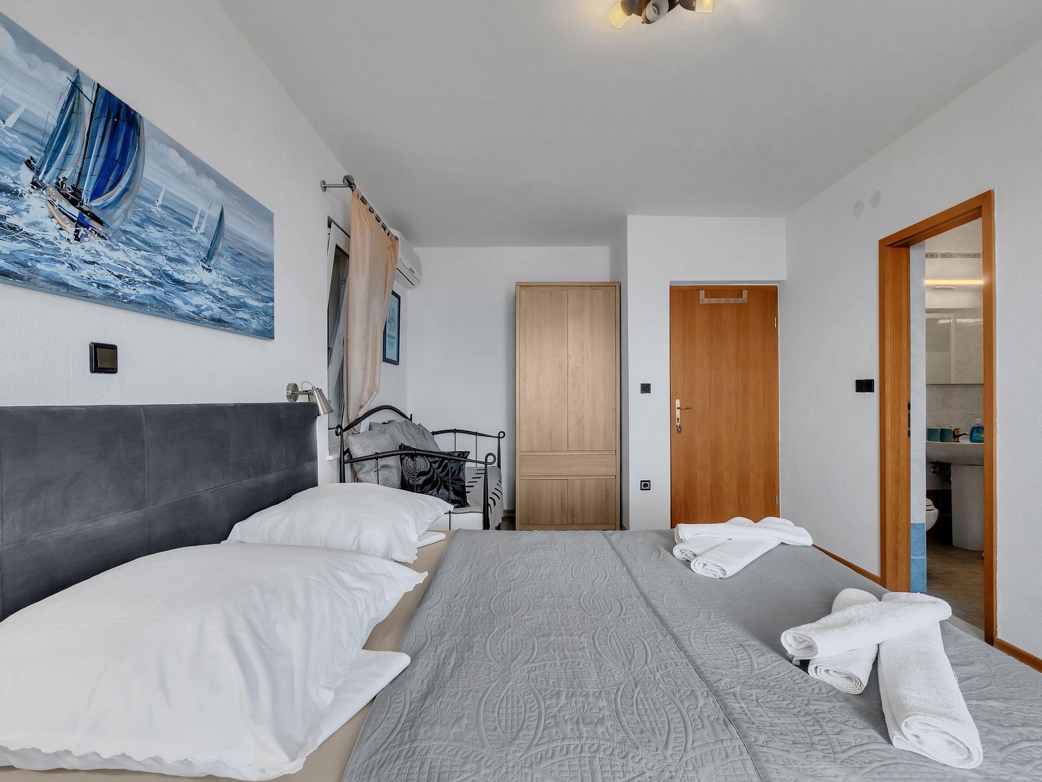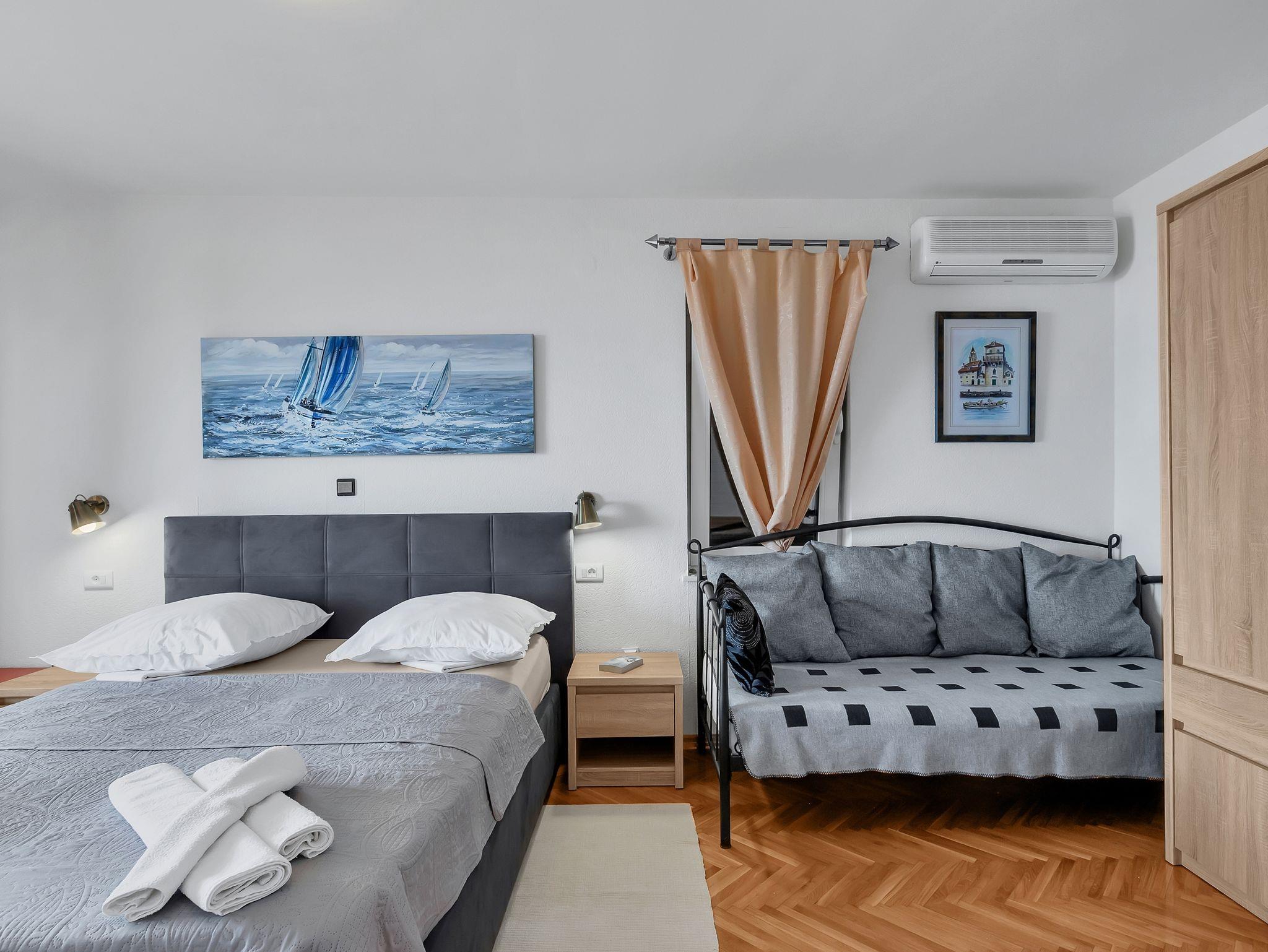 Zimmer bietet Platz für 3 Gäste. Die Betten sind in Schlafzimmern, die es 1 gibt, innerhalb einer Gesamtfläche von 20m2, angeordnet. Die Gäste haben einen eigenen Balkon zur Verfügung, auf der sie in warmen Sommernächten genießen können. Das Zimmer bietet Meerblick. In der Unterkunftseinheit besteht die Möglichkeit des Mitbringens von Haustieren gegen Aufpreis. Die reservierte Unterkunftseinheit ist ein Zimmer mit eigenem Badezimmer ohne die Möglichkeit der Nutzung einer Küche. IM PREIS INBEGRIFFEN: Kurtaxe, Endreinigung, Klimatisierung, Parkplatz, Internet, Bügeleisen, Bügelbrett, Föhn. VERBINDLICHE ZUSÄTZLICHE KOSTEN: Aufzahlung für Kurzaufenthalte (prozentualer Zuschlag pro Nächtigungsanzahl: 30% - 1, 20% - 2, 10% - 3). UNVERBINDLICHE ZUSÄTZLICHE KOSTEN: Haustiere (10,00 € pro Nacht). Die Verfügbarkeit zusätzlicher Dienstleistungen in Ihrem reservierten Termin und die Preise derselben (falls nicht aufgeführt) müssen im Voraus überprüft werden. Zusätzliche Dienstleistungen die in der Zahlungsaufforderung nicht aufgeführt sind werden direkt beim Vermieter bezahlt, angenommen der Gast nutzt auch diese. Ermäßigung auf den Grundpreis: Gratistag 14=13 (bei einem Aufenthalt von 14 Tagen oder mehr erhalten Sie einen Gratistag für den Aufenthalt bis 31.12.26).