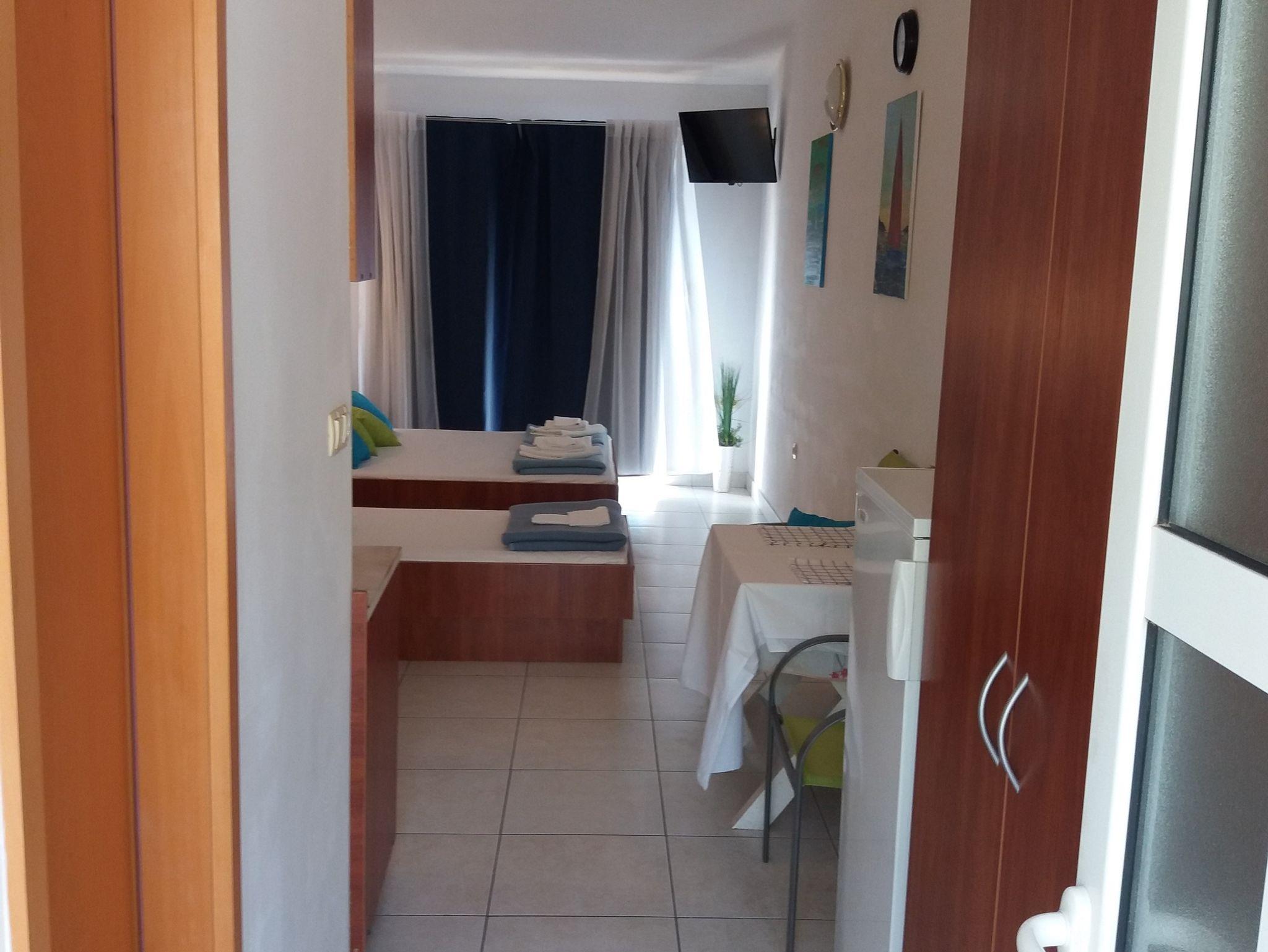 Studio bietet Platz für 3 Gäste. Die Betten sind in Schlafzimmern, die es 1 gibt, innerhalb einer Gesamtfläche von 23m2, angeordnet. Die Gäste haben einen eigenen Balkon zur Verfügung, auf der sie in warmen Sommernächten genießen können. Das Studio-Apartment bietet Meerblick. Es ist erlaubt, Speisen auf dem Gemeinschafts-Grill vorzubereiten. IM PREIS INBEGRIFFEN: Kurtaxe, Endreinigung, Klimatisierung, Parkplatz, Internet, Bügelbrett, Föhn. VERBINDLICHE ZUSÄTZLICHE KOSTEN: Aufzahlung für Kurzaufenthalte (prozentualer Zuschlag pro Nächtigungsanzahl: 30% - 1, 20% - 2, 10% - 3). UNVERBINDLICHE ZUSÄTZLICHE KOSTEN: Zusatzbett (10,00 € pro Nacht). Die Verfügbarkeit zusätzlicher Dienstleistungen in Ihrem reservierten Termin und die Preise derselben (falls nicht aufgeführt) müssen im Voraus überprüft werden. Zusätzliche Dienstleistungen die in der Zahlungsaufforderung nicht aufgeführt sind werden direkt beim Vermieter bezahlt, angenommen der Gast nutzt auch diese. Ermäßigung auf den Grundpreis: Gratistag 14=13 (bei einem Aufenthalt von 14 Tagen oder mehr erhalten Sie einen Gratistag für den Aufenthalt bis 31.12.26).