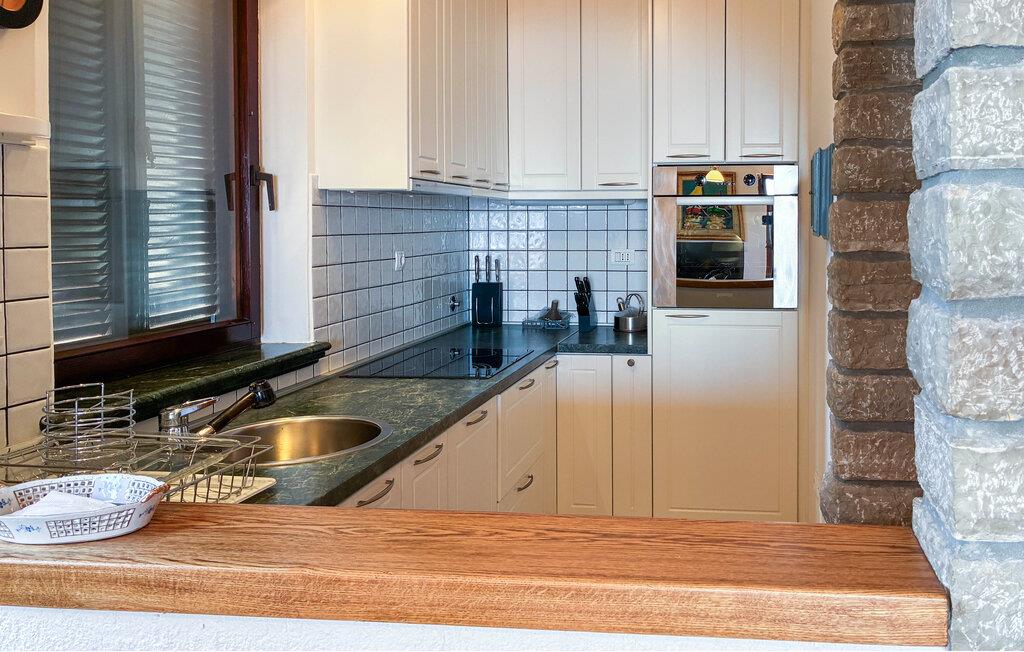 Den smagfulde bolig tilbyder en smuk ramme til at undslippe hverdagens travlhed og samle nye indtryk langs Kvarnerbugten. Den indbydende opholdsstue har varme træelementer og middelhavsdetaljer. Læn jer tilbage i den komfortable sofa og nyd den behagelige atmosfære. Brug fjernsynet til hyggelige aftener og tilbered nemt jeres feriemåltider i det veludstyrede køkken.