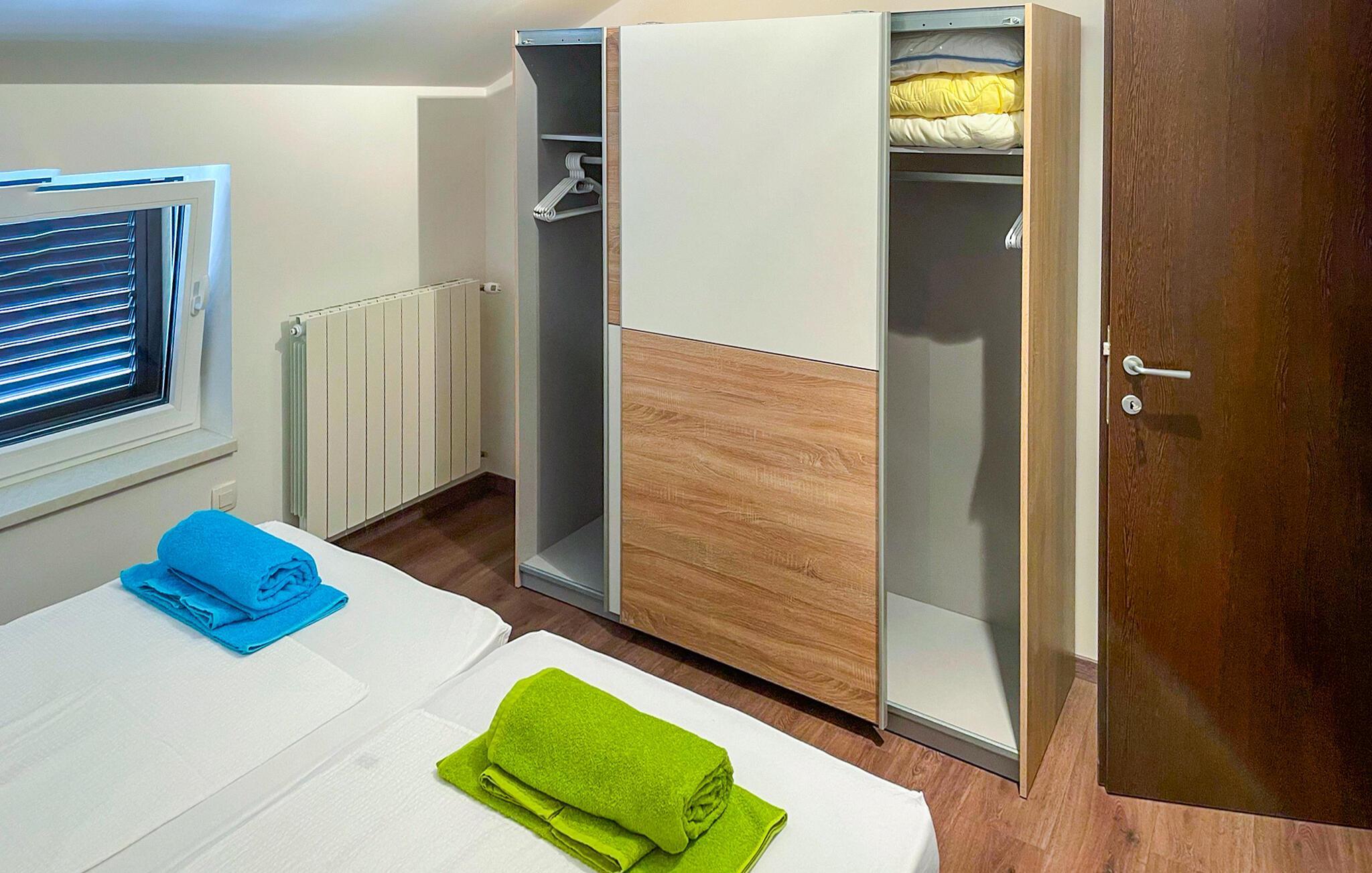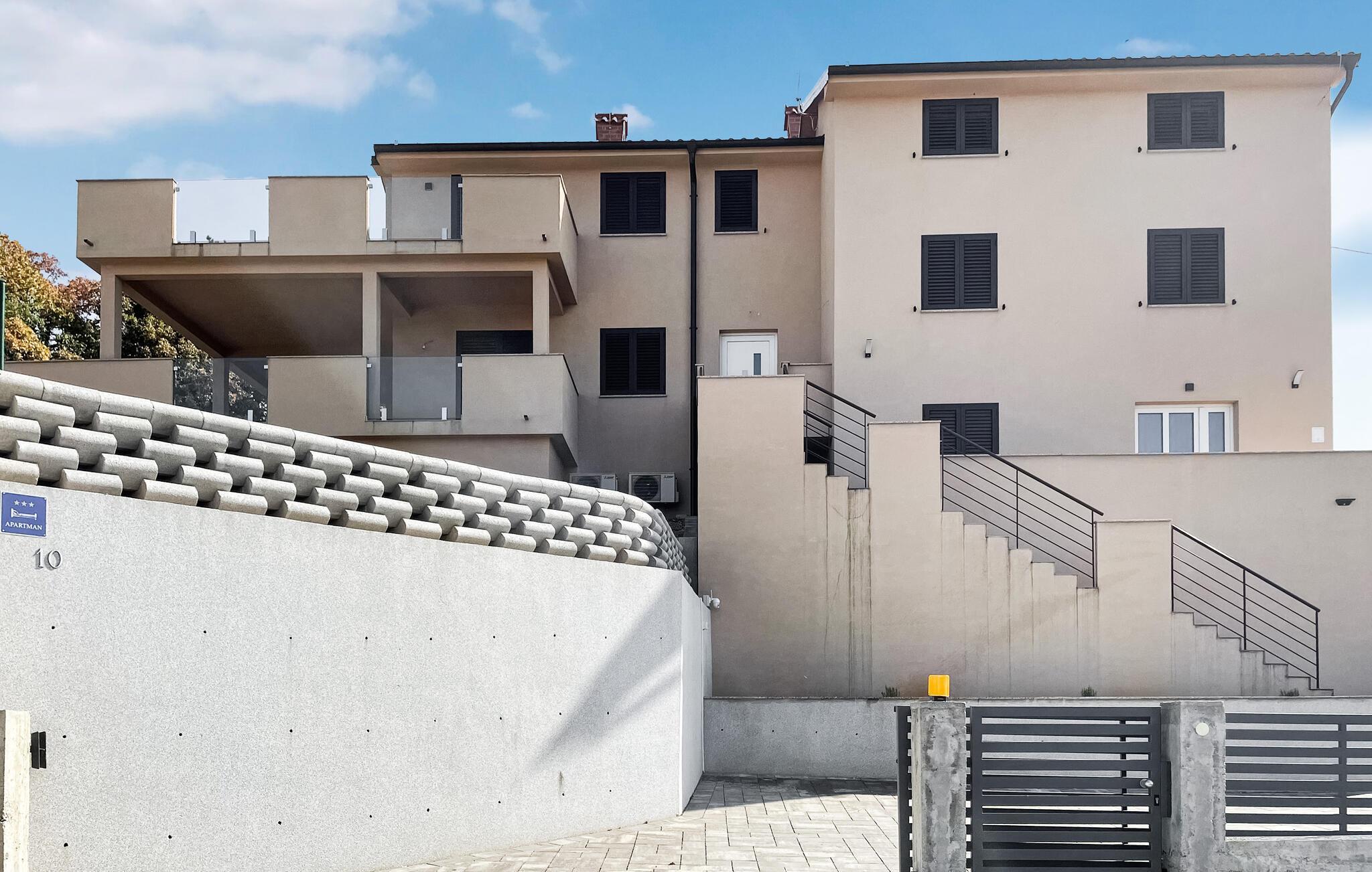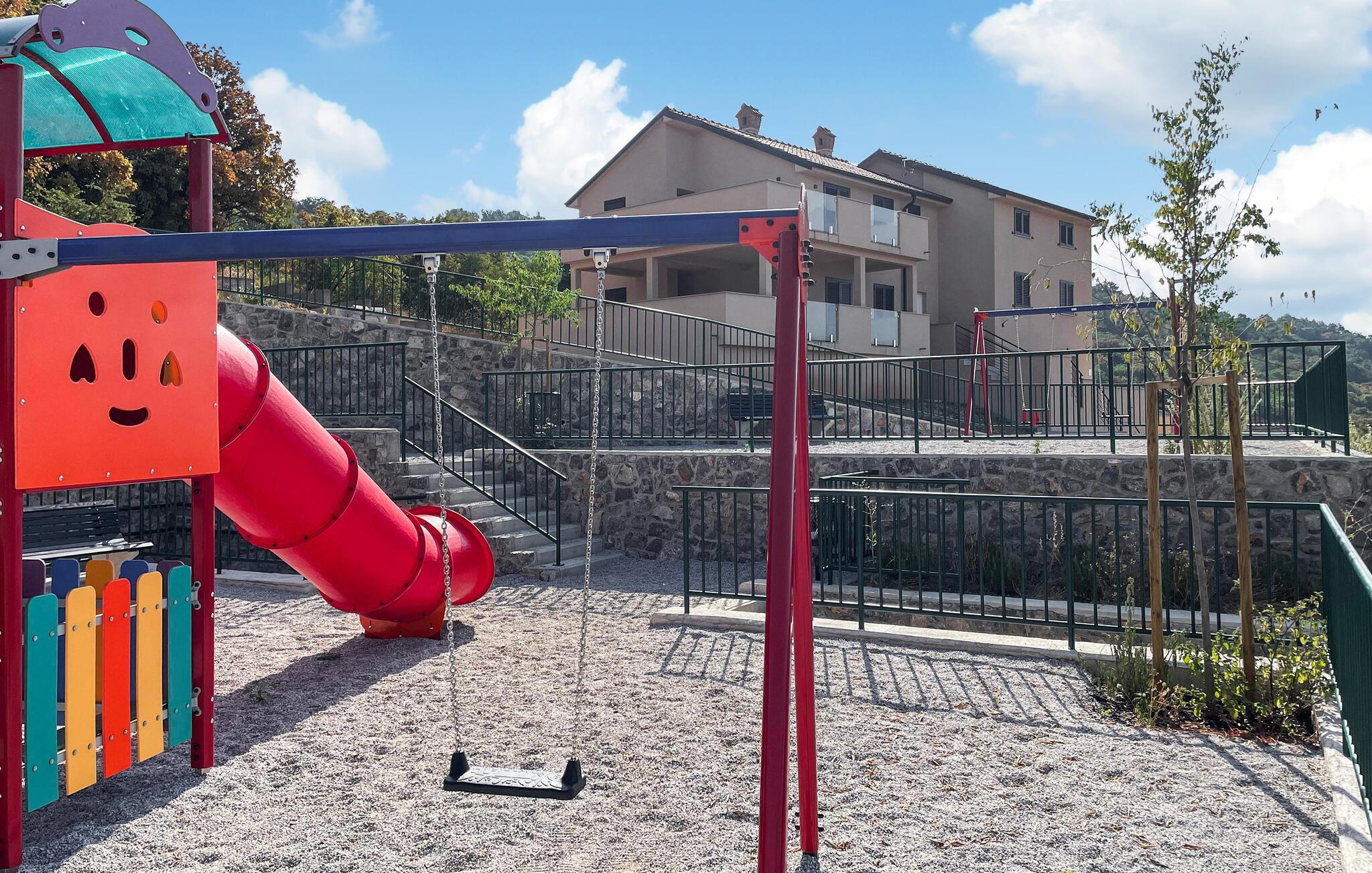 Lige ved siden af lejligheden er der en legeplads, som er ideel for familier med børn. Lad jeres børn have det sjovt på gyngerne og rutsjebanerne, mens I nyder den fredelige udsigt over det grønne landskab. Besøg den nærliggende by Opatija med sine smukke parker og promenader, eller tag en dagstur til Rijeka, hvor kultur og historie venter på jer.
