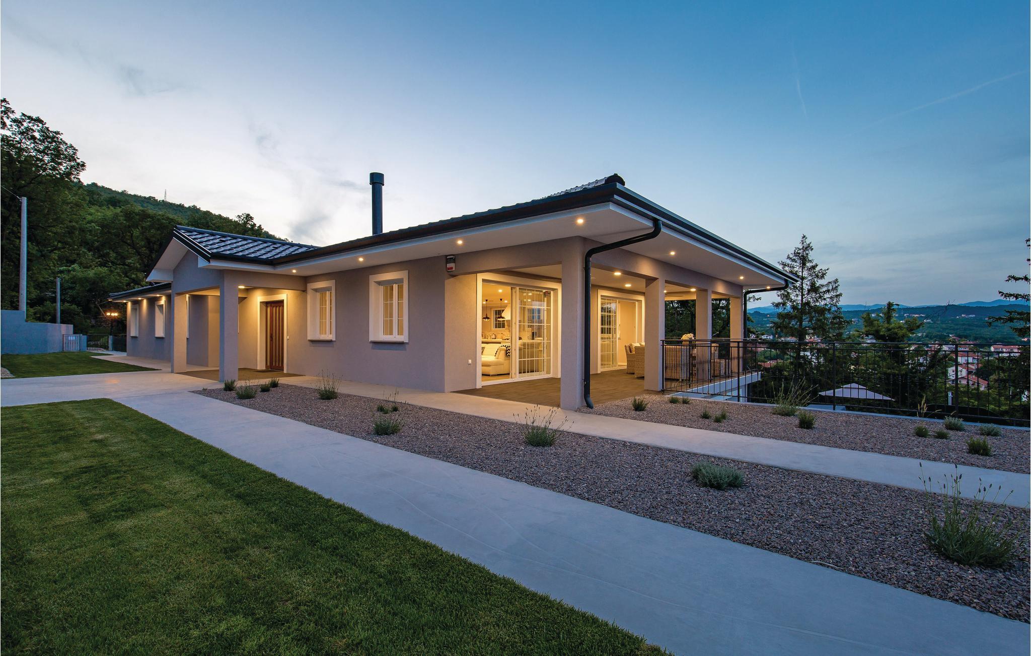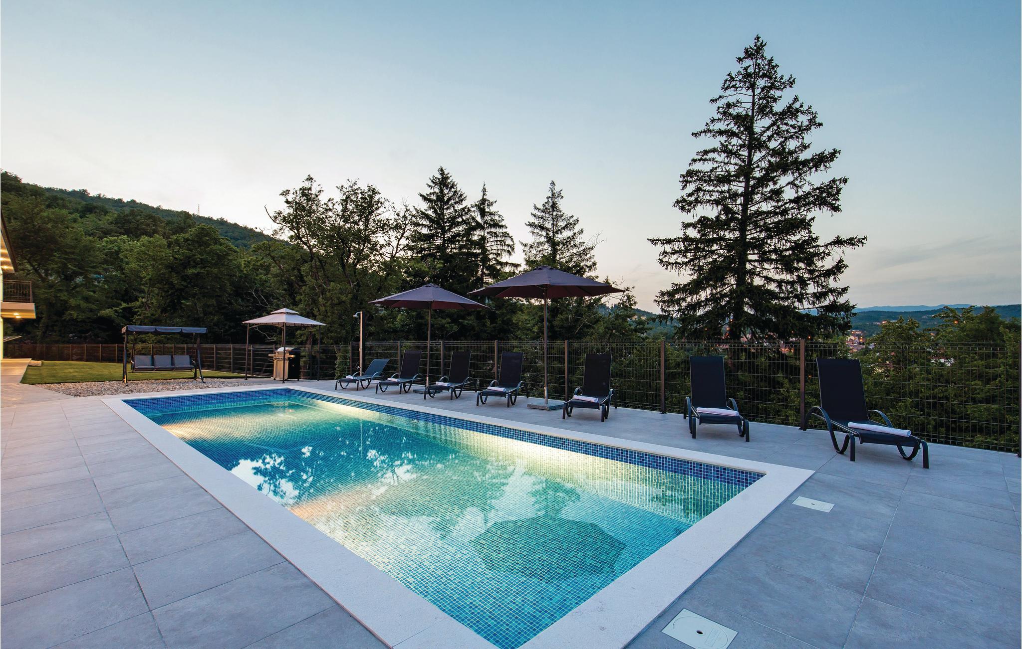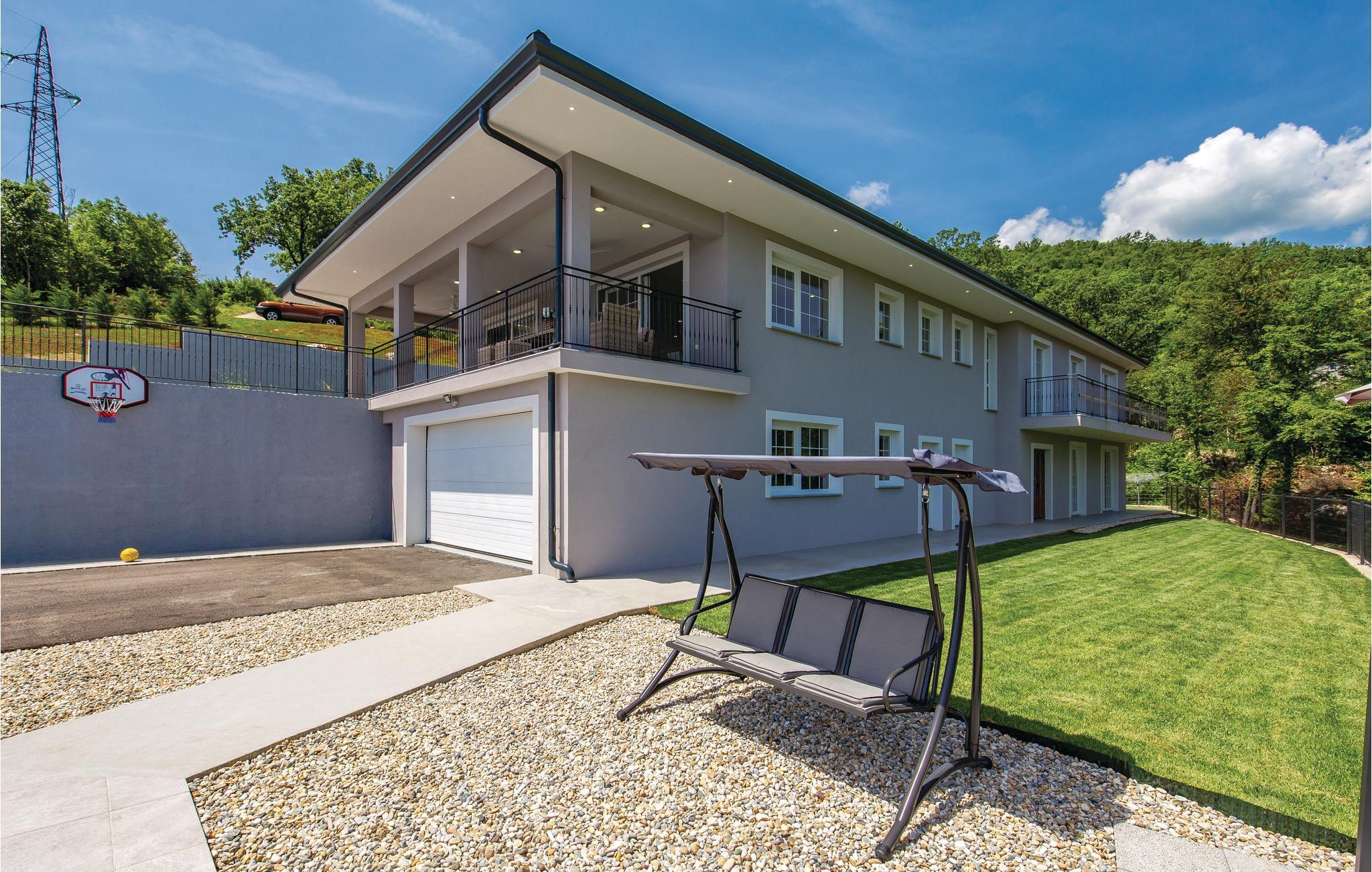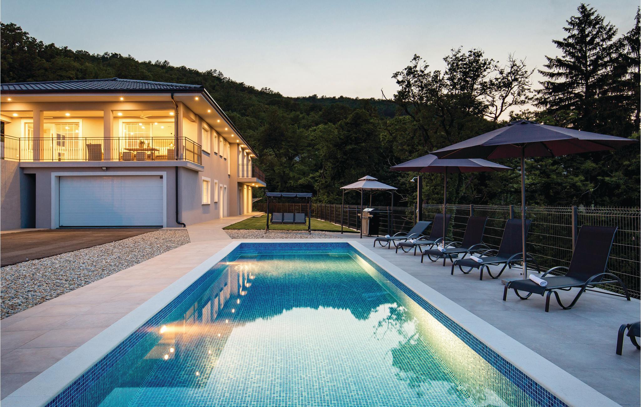 Dette fantastiske feriehus ligger ved foden af bjerget Ucka og over den smukke kystby Opatija. Det ligger i udkanten af en skov, langt væk fra byens støj, i Matulji, hvor I kan slappe af og genvinde kræfterne. Det stilfulde feriehus ligger på en 3000 m² stor og indhegnet grund. Husets store vinduer, der lukker lyset ind og giver en fornemmelse af at være tæt på naturen. Udendørs er der privat pool, liggestole og grill til nem og lækker madlavning. Huset er fordelt på to etager. I stueetagen er der stue med billard, soveværelse, badeværelse og stue, mens spisekøkken, fire soveværelser, to badeværelser og et separat bryggers med vaskemaskine mv. ligger ovenpå. Aktive feriegæster kan udforske området på cykel- og vandrestier. Det tager kun få minutters kørsel at komme til Opatija, med mange restauranter, barer og strande. Den ca. 12 km lange promenade inviterer til gåture. Parkering i garagen.