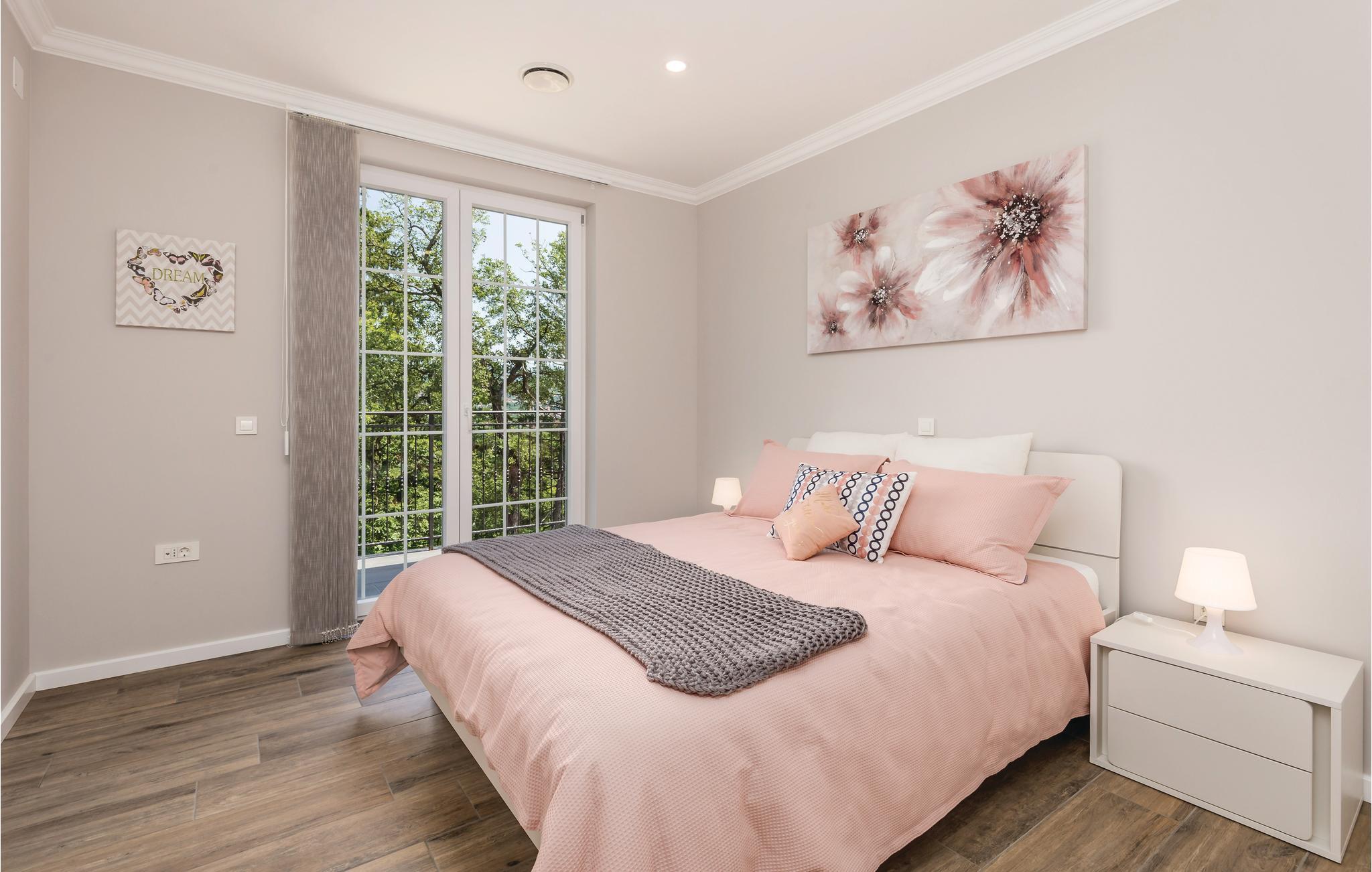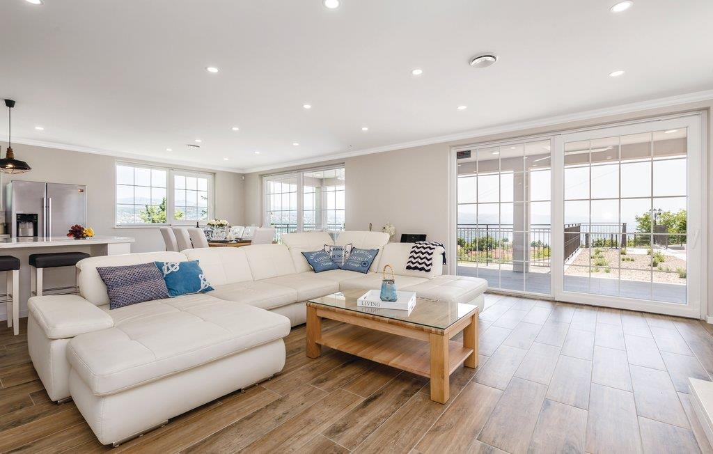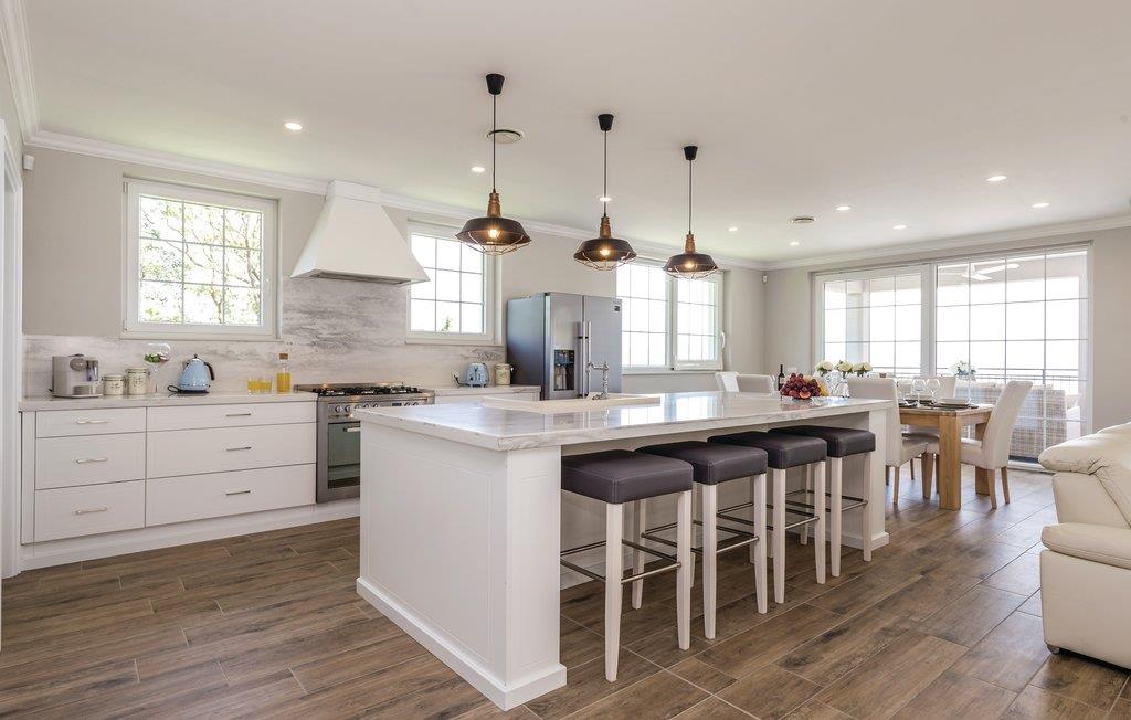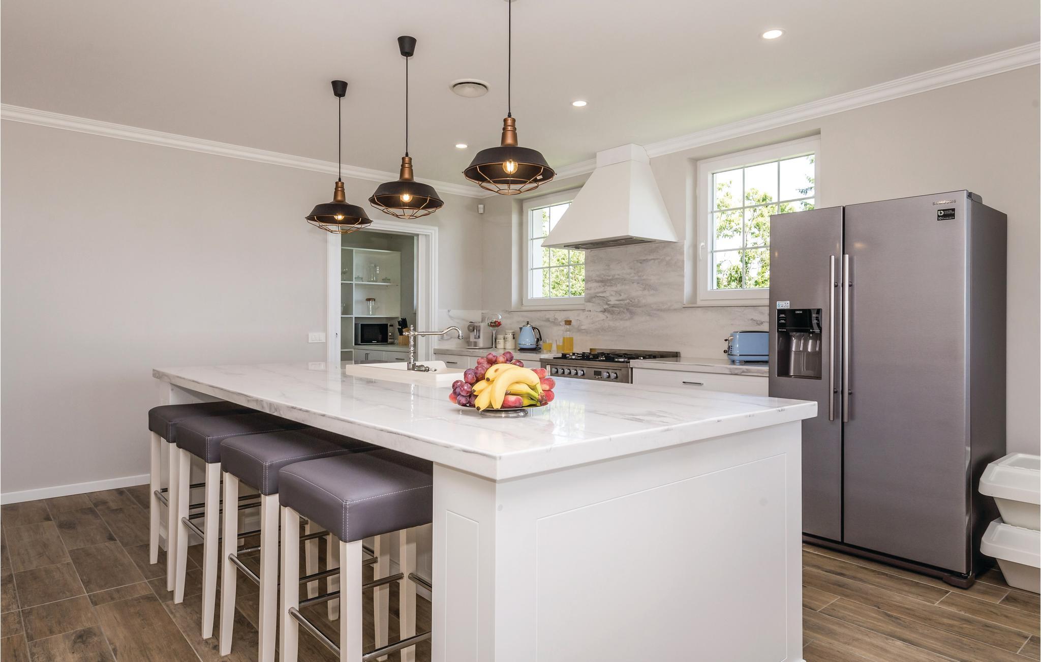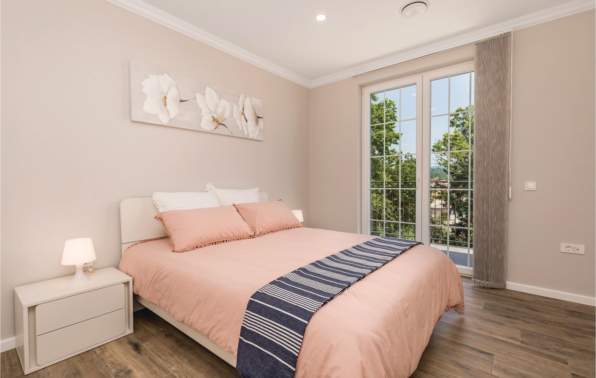 Dette fantastiske feriehus ligger ved foden af bjerget Ucka og over den smukke kystby Opatija. Det ligger i udkanten af en skov, langt væk fra byens støj, i Matulji, hvor I kan slappe af og genvinde kræfterne. Det stilfulde feriehus ligger på en 3000 m² stor og indhegnet grund. Husets store vinduer, der lukker lyset ind og giver en fornemmelse af at være tæt på naturen. Udendørs er der privat pool, liggestole og grill til nem og lækker madlavning. Huset er fordelt på to etager. I stueetagen er der stue med billard, soveværelse, badeværelse og stue, mens spisekøkken, fire soveværelser, to badeværelser og et separat bryggers med vaskemaskine mv. ligger ovenpå. Aktive feriegæster kan udforske området på cykel- og vandrestier. Det tager kun få minutters kørsel at komme til Opatija, med mange restauranter, barer og strande. Den ca. 12 km lange promenade inviterer til gåture. Parkering i garagen.