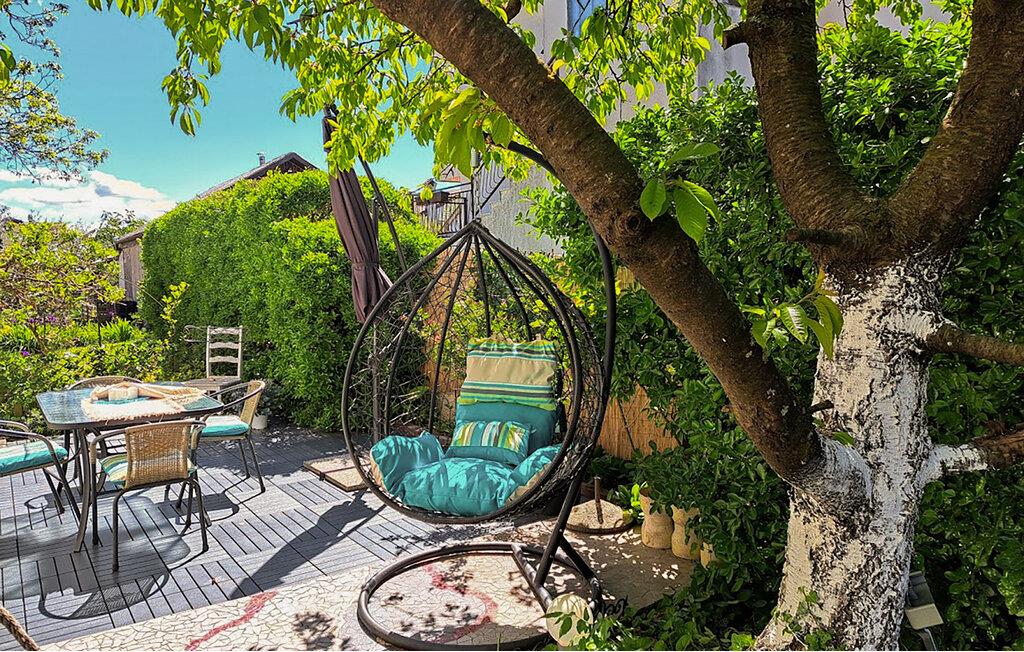 Gå ud på den idylliske terrasse. Slap af i den hængende kurvestol under træet, eller sæt jer på en af ??de farverige havestole. Omgivet af blomster, trædekorationer og gamle vintønder finder I en særlig atmosfære af fred og tryghed. Nyd solen eller læs en bog i skyggen af ??den grønne hæk.