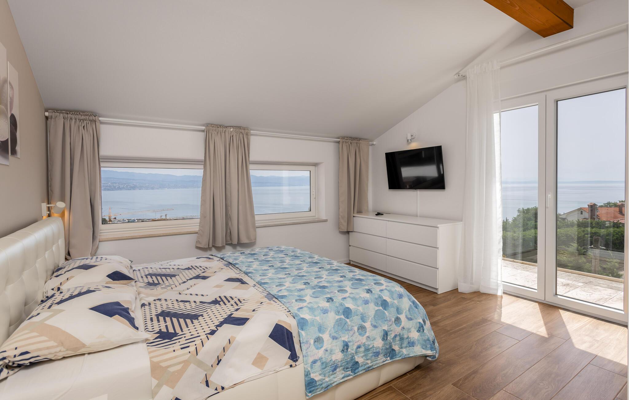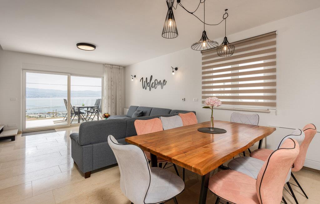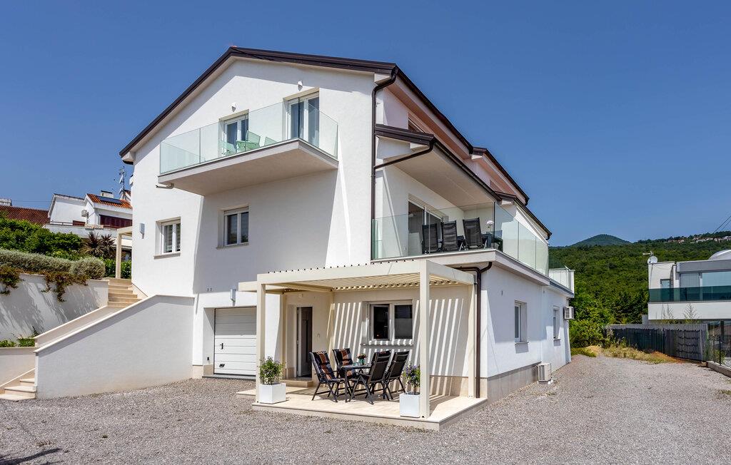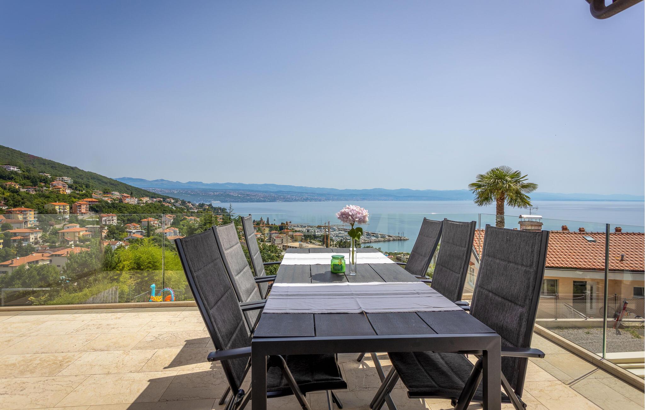 Der er lagt op til en ferie med masser af komfort og en vidunderlig udsigt i denne skønne lejlighed, hvor I sammen med familien kan slappe helt af uden de store bekymringer. Huset er i to etager, og overalt emmer indretningen af kvalitet og smagfuldt interiør. Lad blot dagen starte ud med en lækker morgenmad på den overdækkede terrasse, hvor I får en smuk udsigt over det blå hav og hele Kvarnerbugten, Rijeka og øerne Krk og Cres.