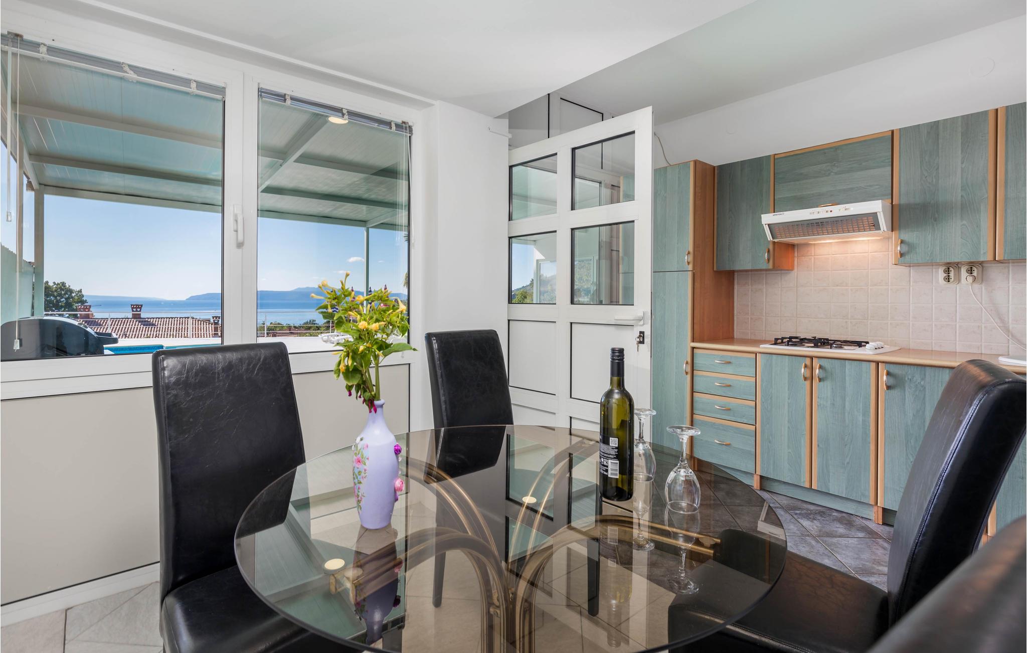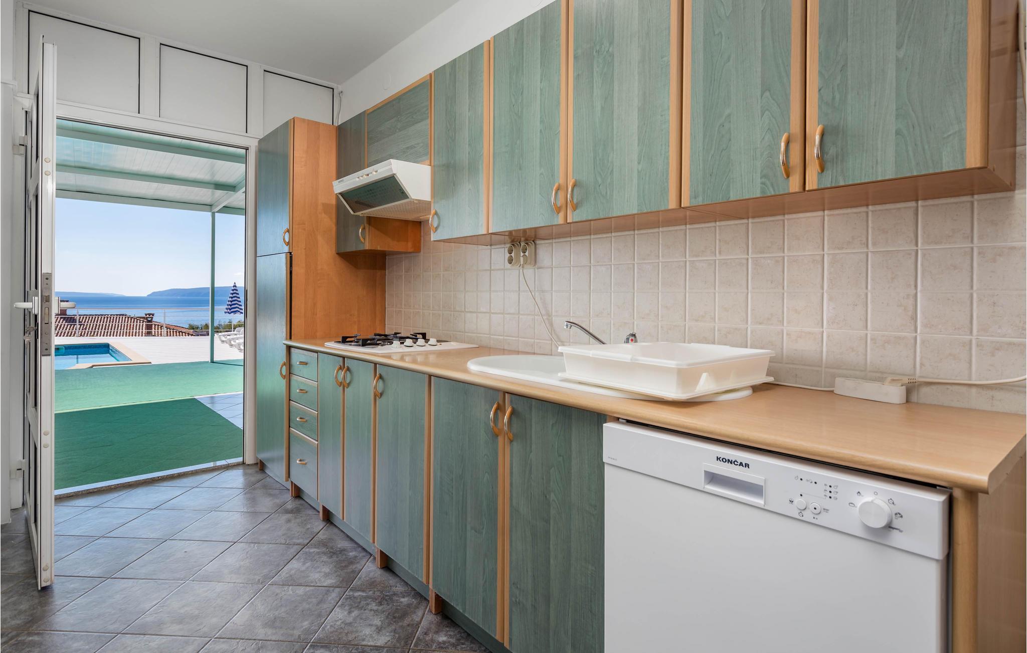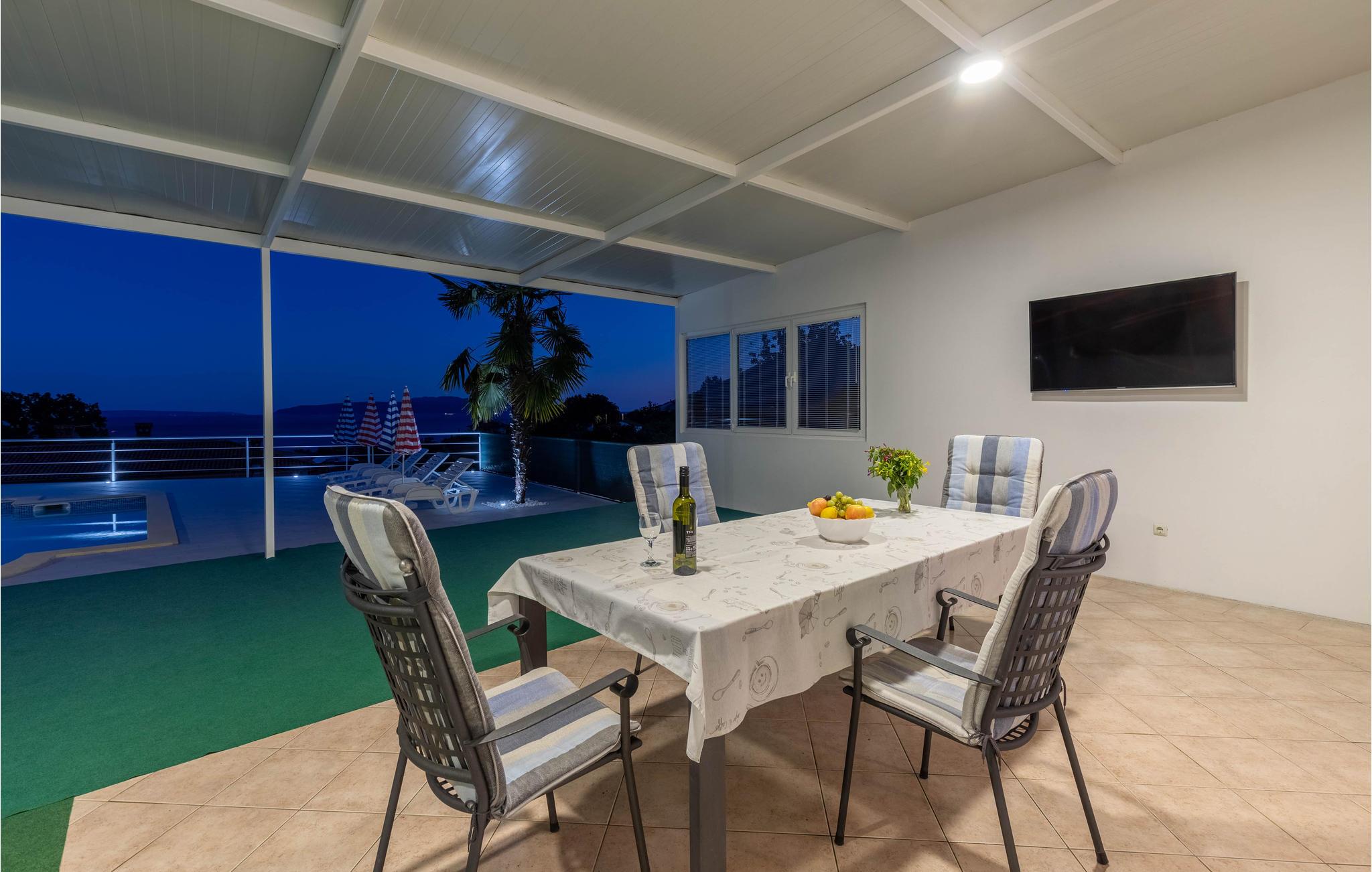 Det praktiske sommerhus tilbyder jer et skønt hjem under jeres ferie. Huset er ideelt til 2 par eller en lille familie med børn. Her kan I slappe af og bruge en masse tid udendørs. Grunden er indhegnet med stor overdækket terrasse og solterrasse ved poolen. Fra huset og fra den store terrasse kan I nyde en smuk panoramaudsigt over havet og øerne Cres og Krk. I vil bruge det meste af jeres tid på at nyde naturen i swimmingpoolen under solen.