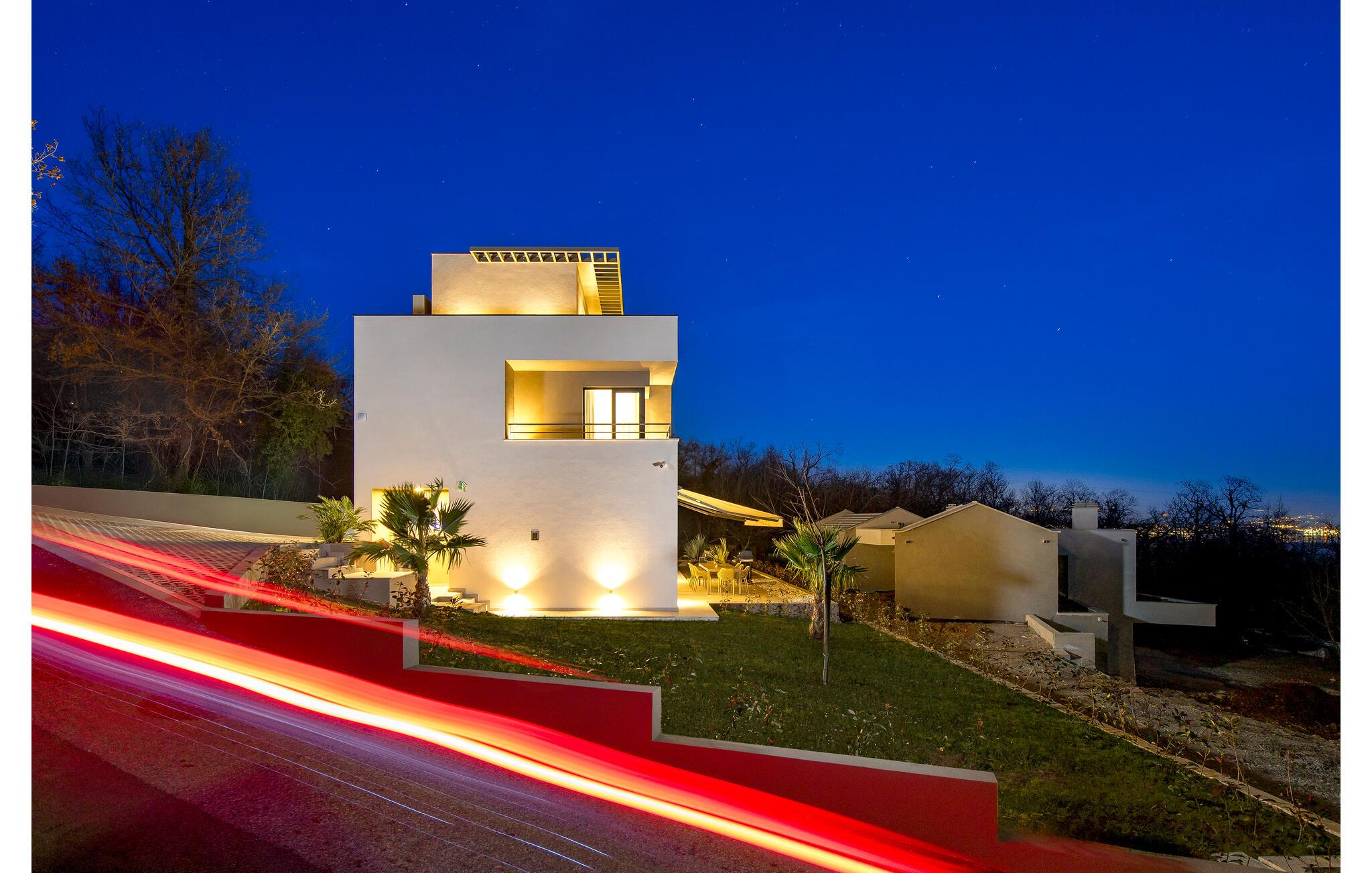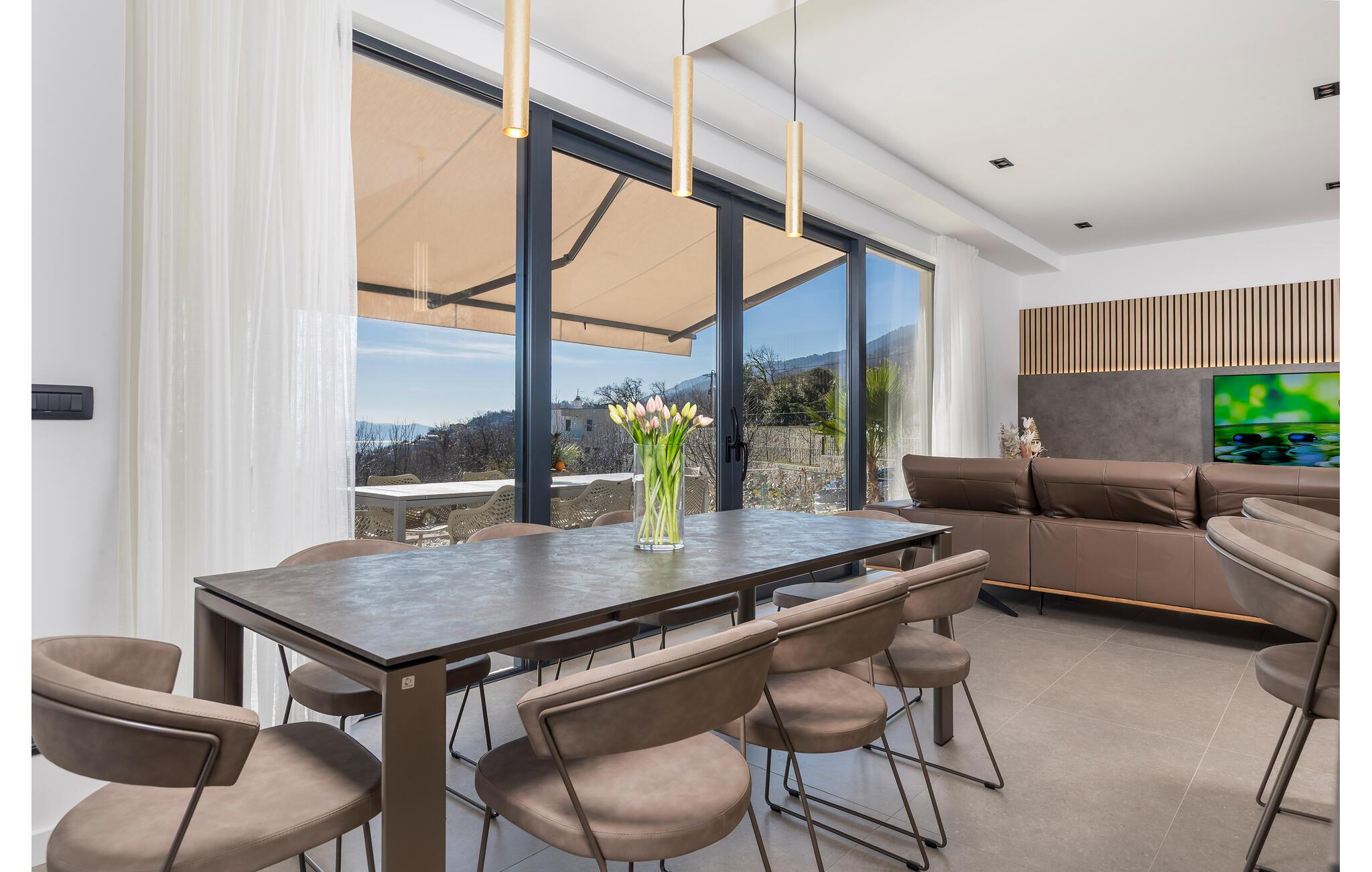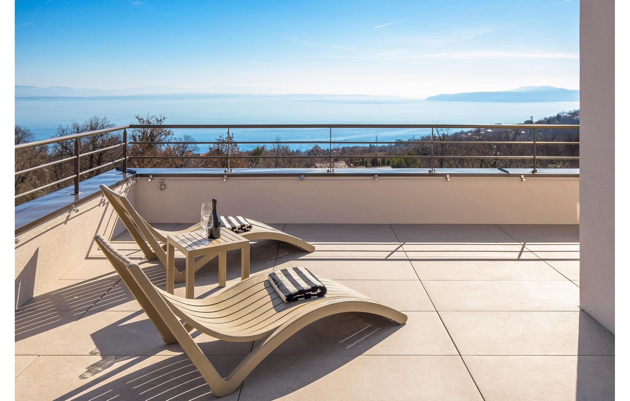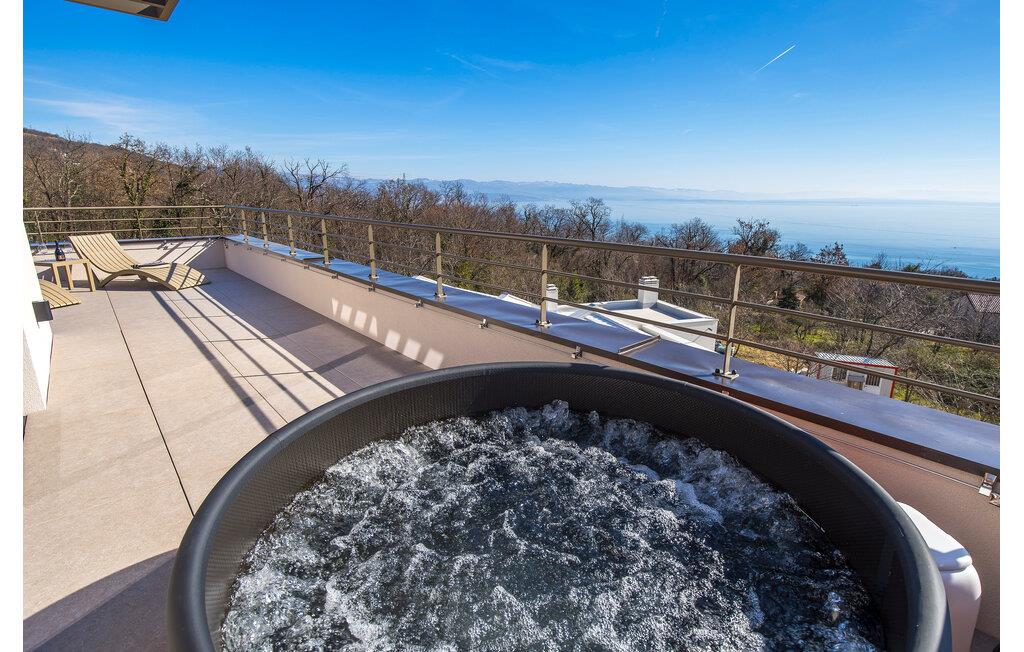 I en sublim beliggenhed på bakkerne over den berømte Opatija kan I nyde en sensationel udsigt over Kvarner-bugten og øerne Krk og Cres fra denne eksklusive bolig. Det højkvalitets og smagfulde interiør flyder ind med lys gennem gulv til loft vinduer og skaber en elegant, indbydende atmosfære. Nyd hyggelige aftener ved det rummelige spisebord eller slap af på den komfortable sofa med en film. Forkæl jer selv med at slappe af i saunaen eller træne i fitnessrummet.