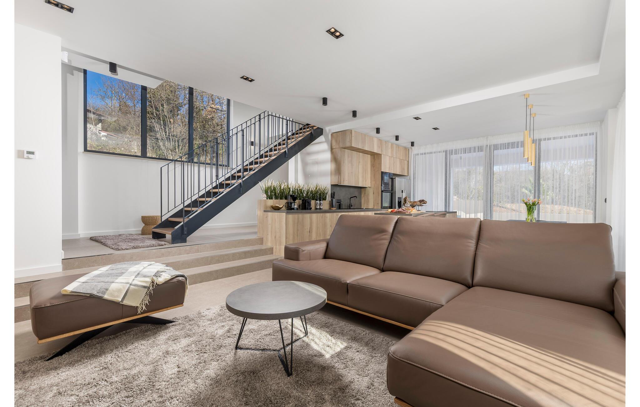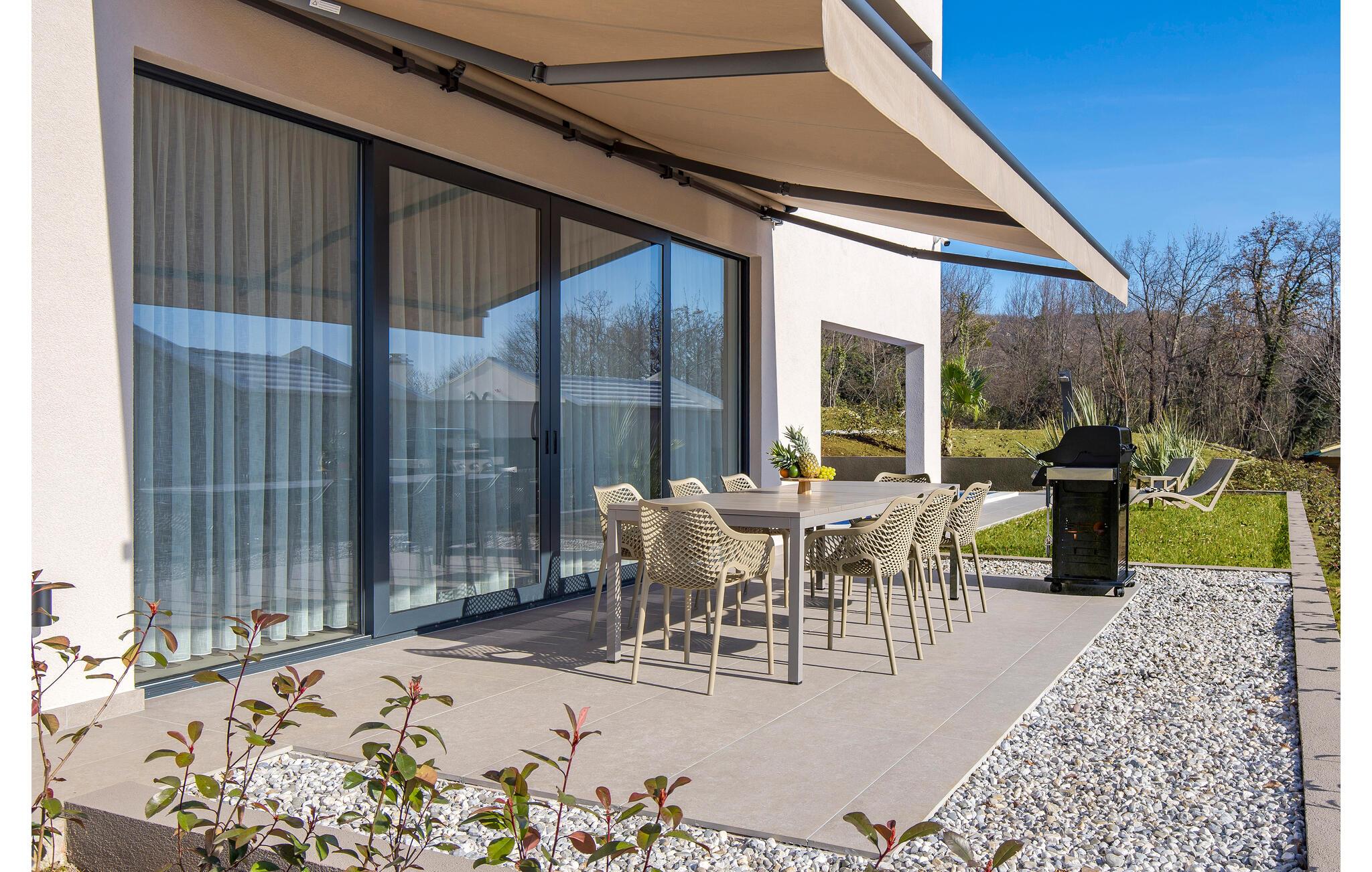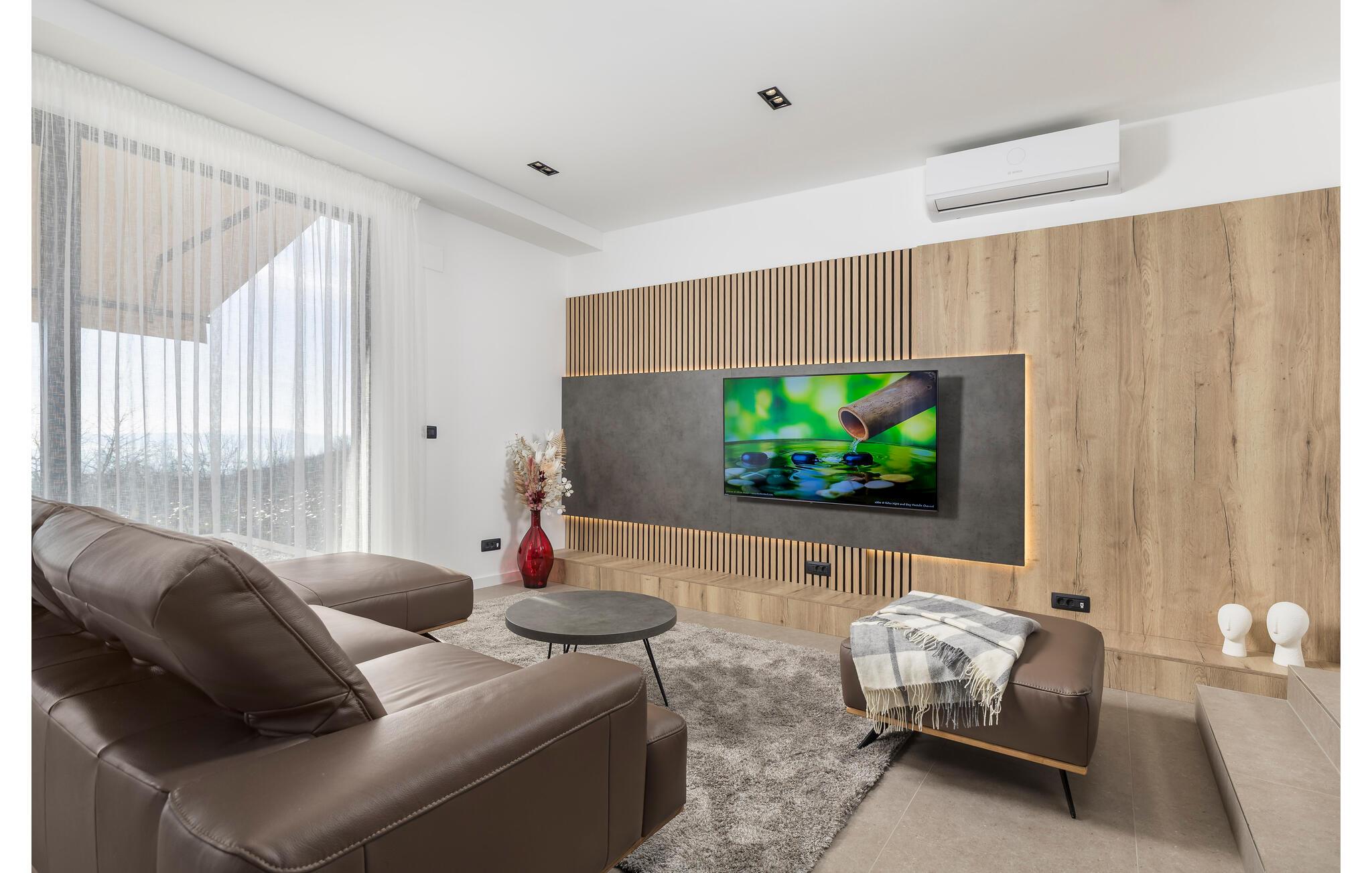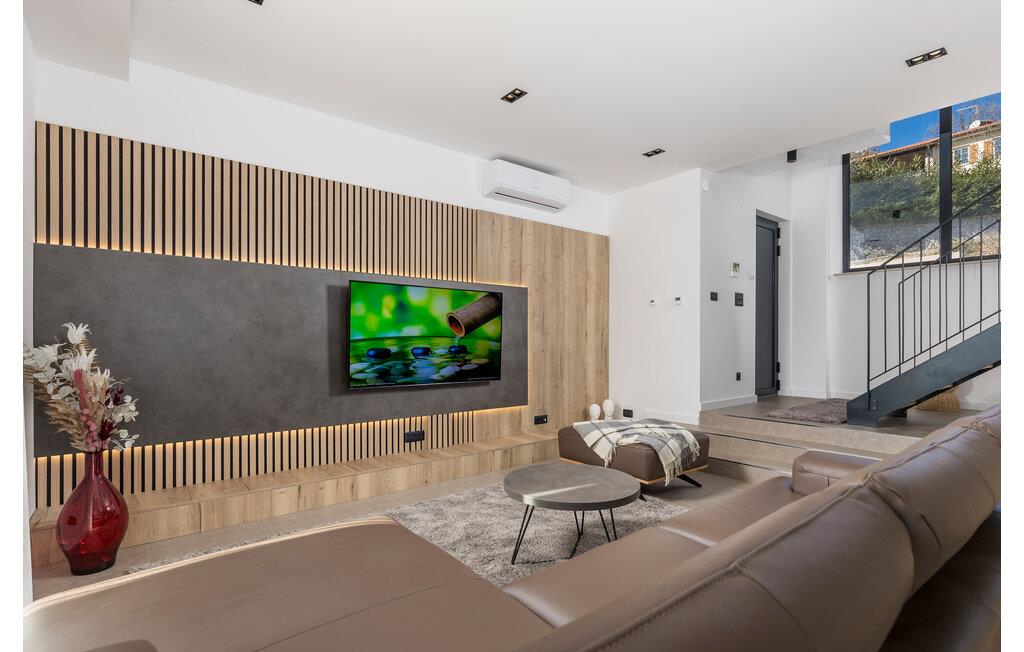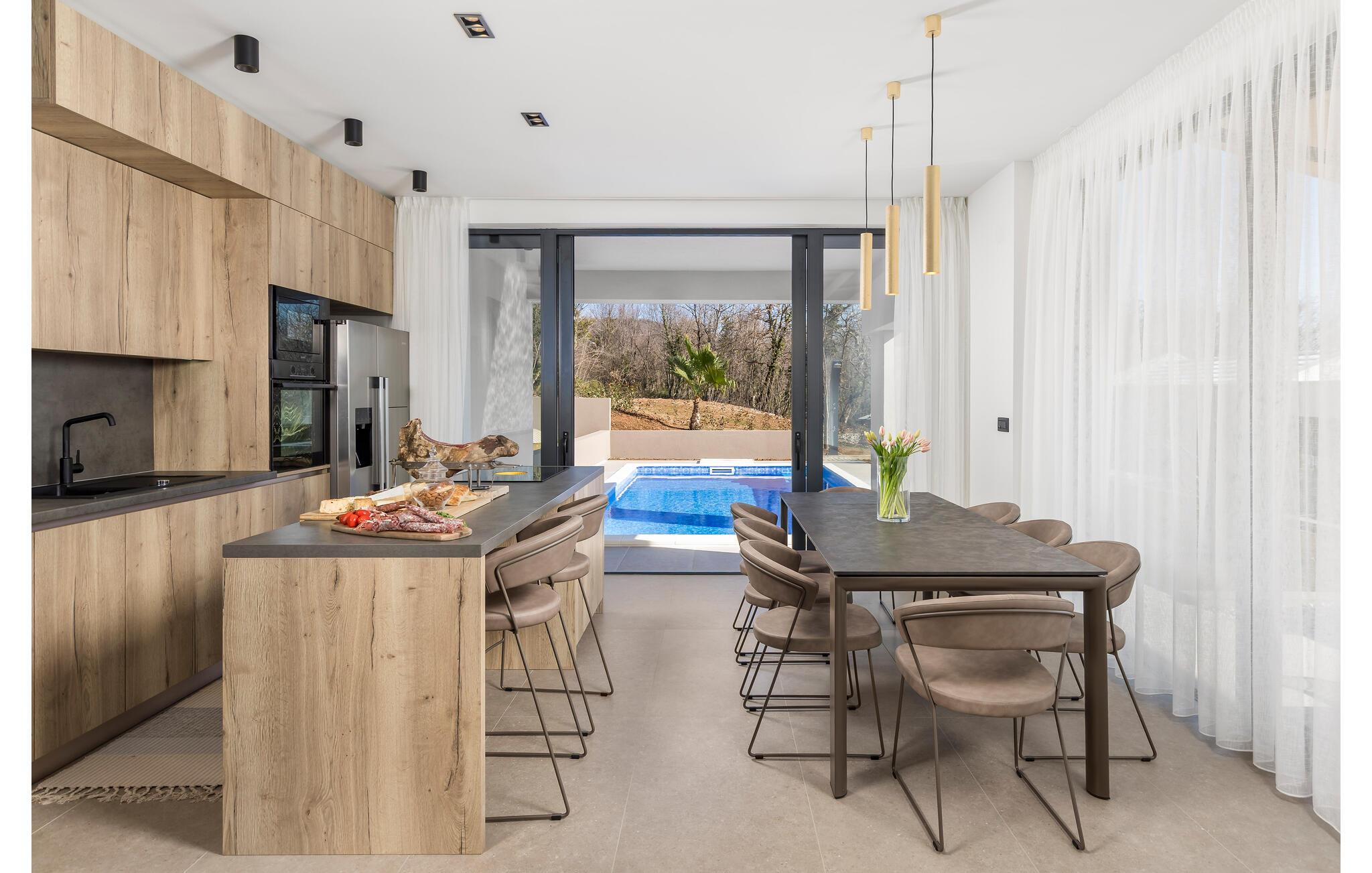 I en sublim beliggenhed på bakkerne over den berømte Opatija kan I nyde en sensationel udsigt over Kvarner-bugten og øerne Krk og Cres fra denne eksklusive bolig. Det højkvalitets og smagfulde interiør flyder ind med lys gennem gulv til loft vinduer og skaber en elegant, indbydende atmosfære. Nyd hyggelige aftener ved det rummelige spisebord eller slap af på den komfortable sofa med en film. Forkæl jer selv med at slappe af i saunaen eller træne i fitnessrummet.