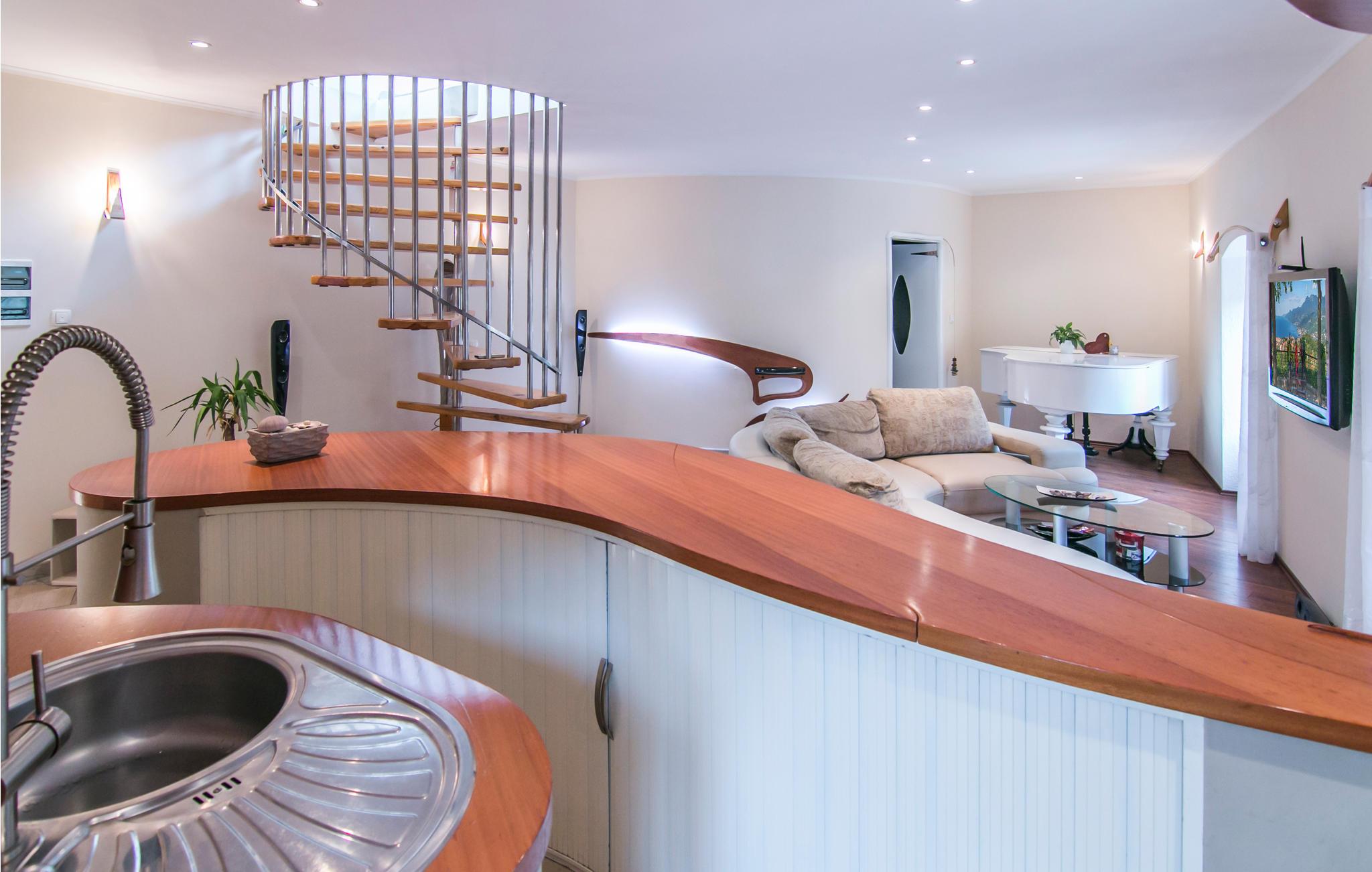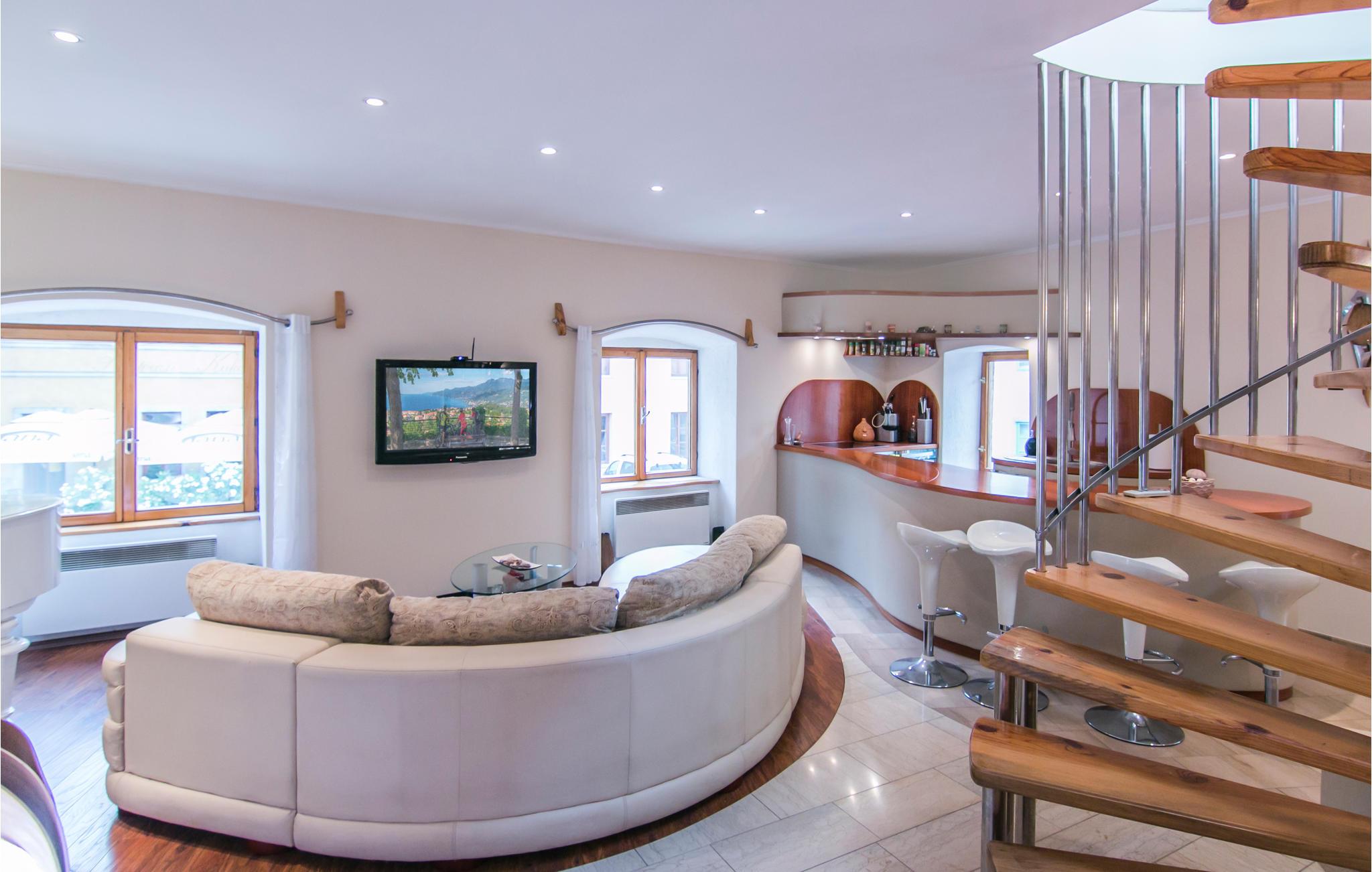 Denne rummelige lejlighed ligger i gågaden og imponerer med sin charme. Den består af et køkken og stue, badeværelse og en vindeltrappe, der fører til soveværelset. Ferielejlighedens blidt afrundede linjer og usædvanlige former er en fryd for øjnene.