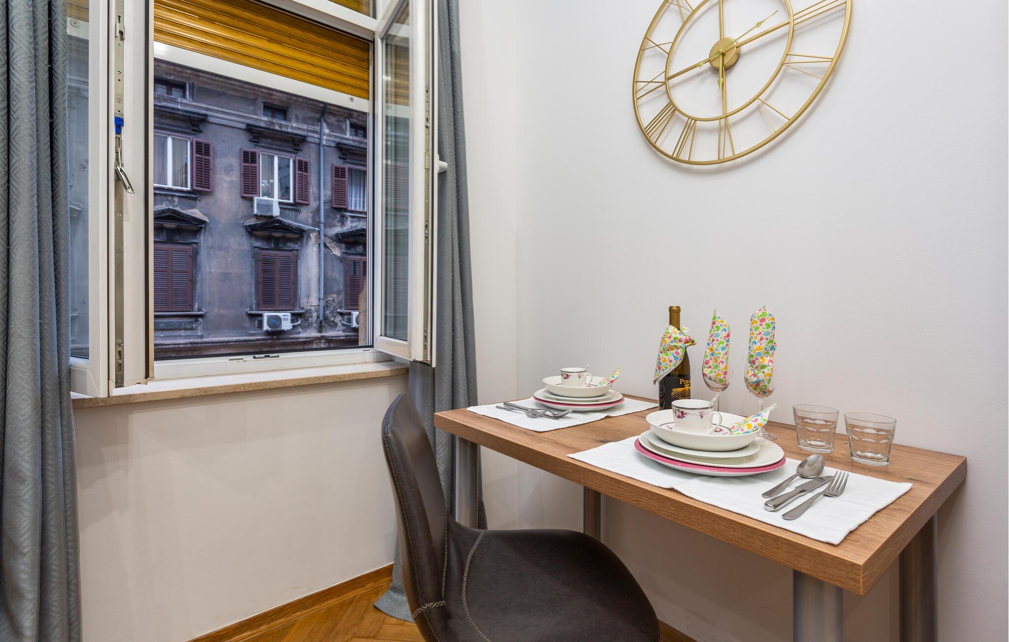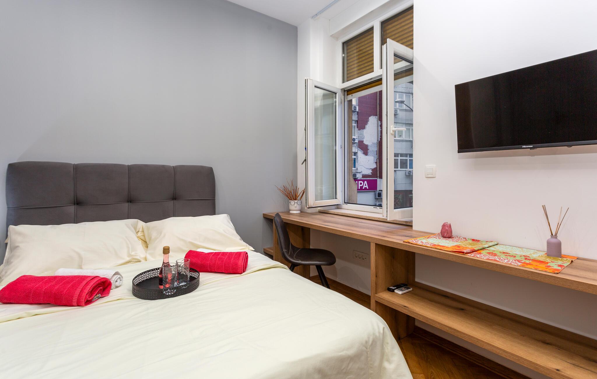 Denne smagfuldt indrettede etværelseslejlighed tilbyder jer et behageligt tilflugtssted, mens I udforsker den fortryllende havneby Rijeka. Begynd dagene med en solid morgenmad, tilberedt i det moderne tekøkken, og nyd jeres måltider i den charmerende spiseplads. Tilbring afslappende aftener med en god film og planlæg kommende udflugter med et glas vin.