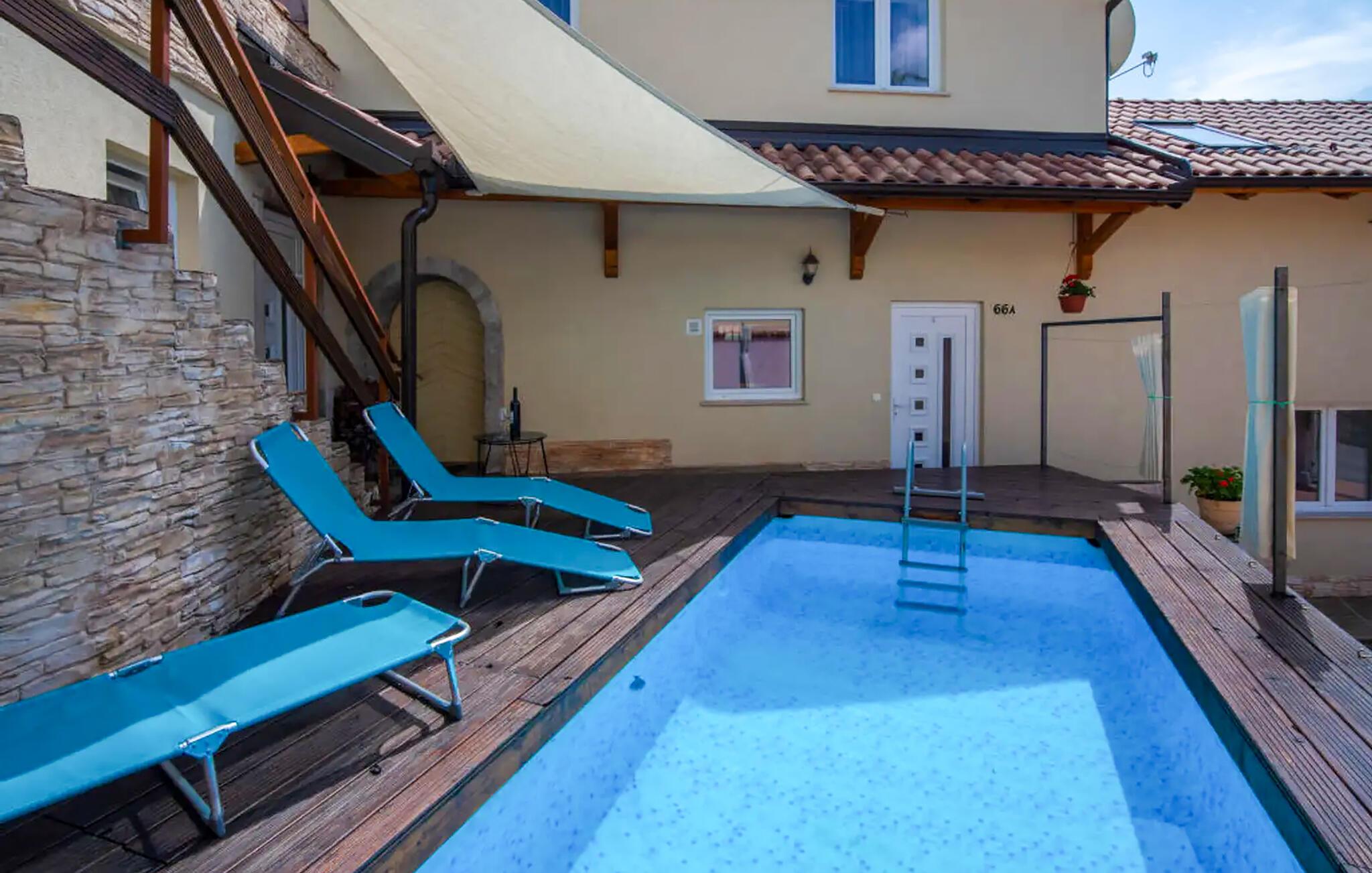 Lige uden for døren kan I snuppe en frisk dukkert i poolen, som I deler med andre gæster. Solbad på liggestolen, forkæl jer selv med en kølig drink og nyd den afslappede atmosfære.