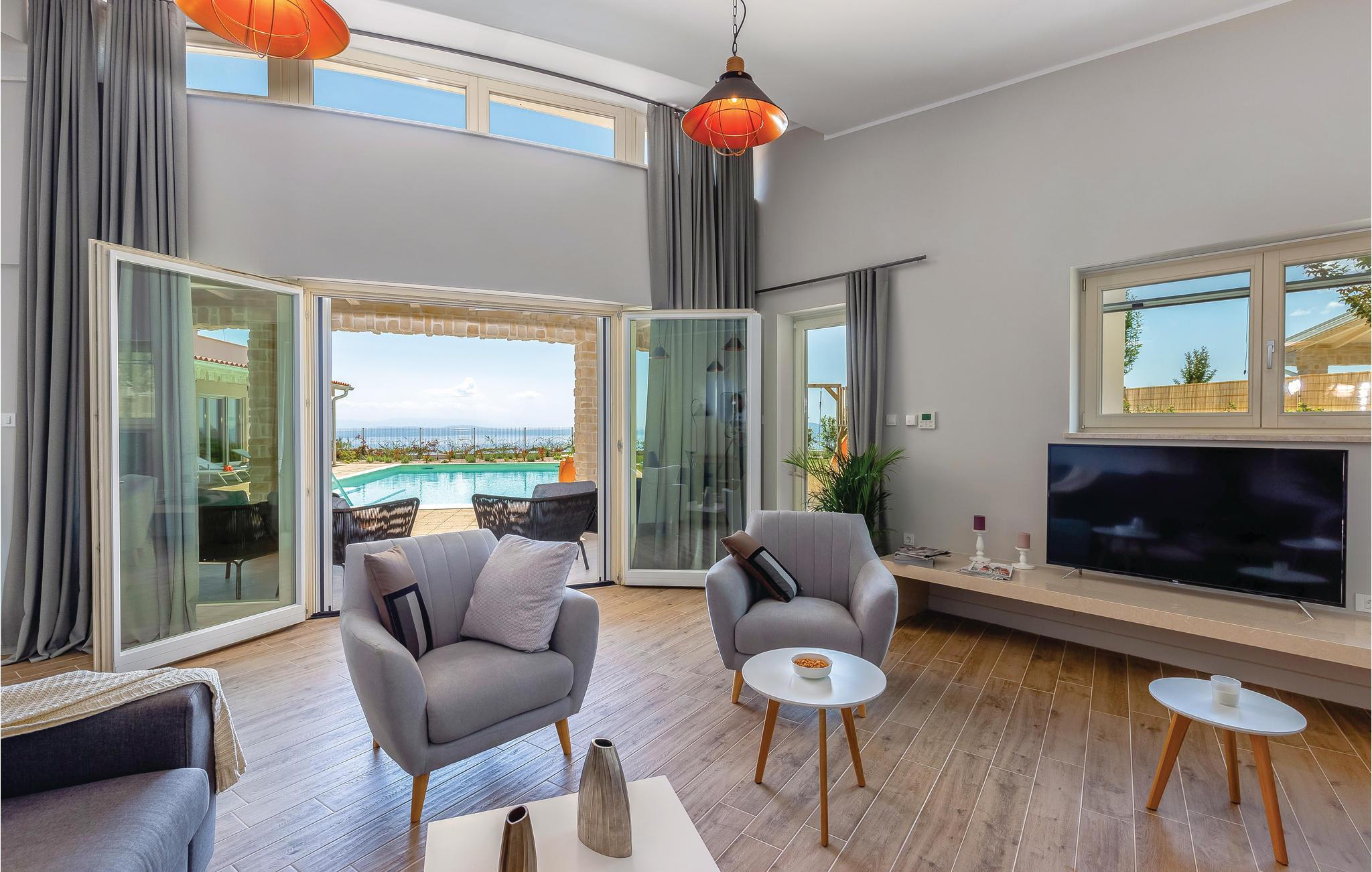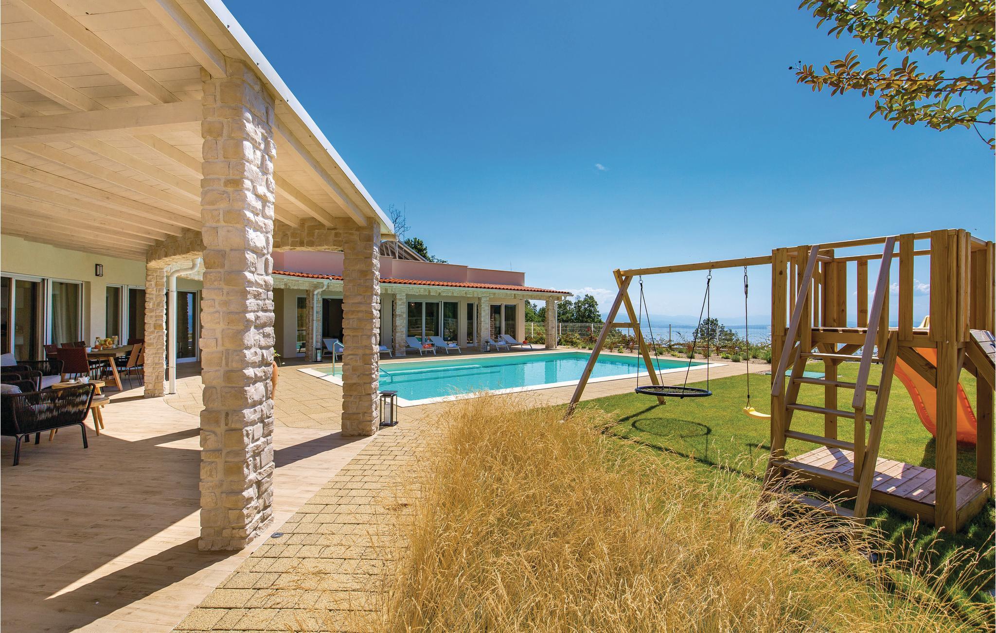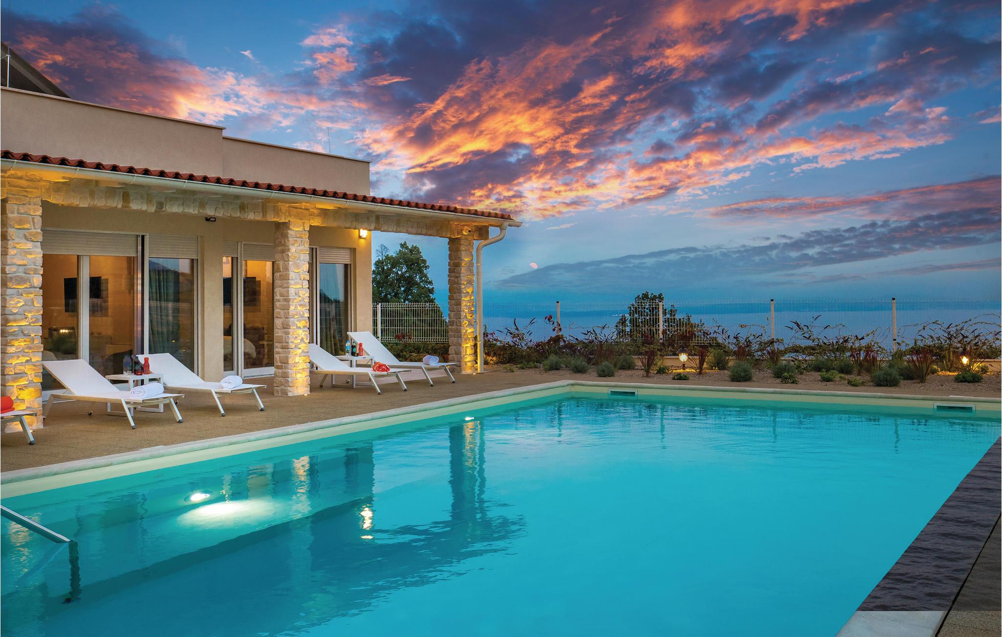 Denne skønne moderne villa med pool er ideel for familier med børn. Den ligger i en lille landsby Veprinac i et boligkompleks bestående af fem eksklusive villaer. Her er dejligt roligt og stedet ligger tilbagetrukket og med den gode komfort, har I rammerne for en rigtig god ferie. Hver villa har en stor pool for sig selv og som ligger på en stor og indhegnet grund med have. Herfra er der en dejlig udsigt til den smukke Kvarner bugt.