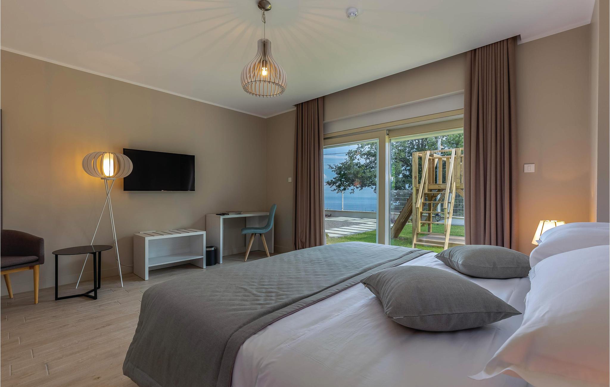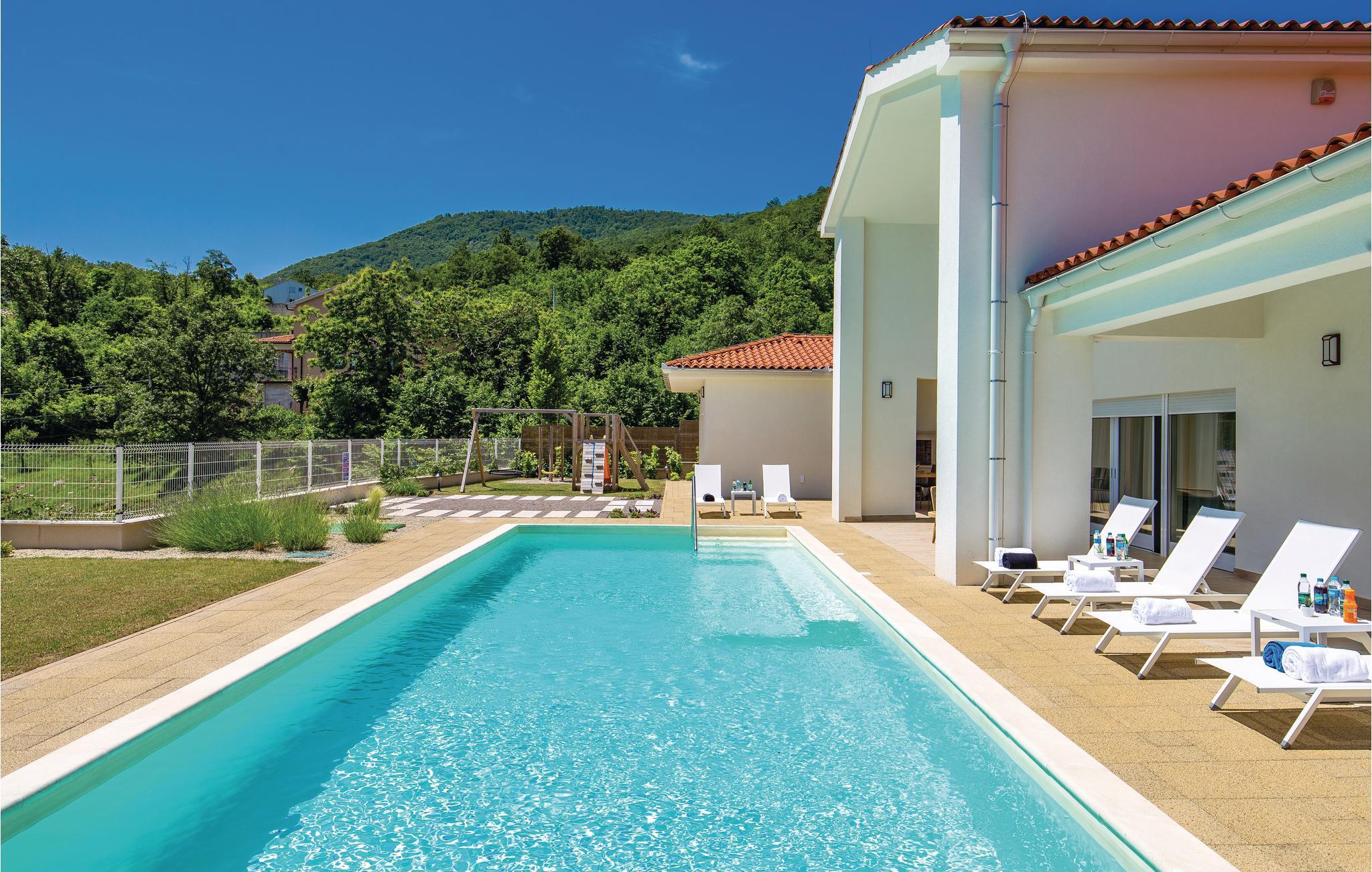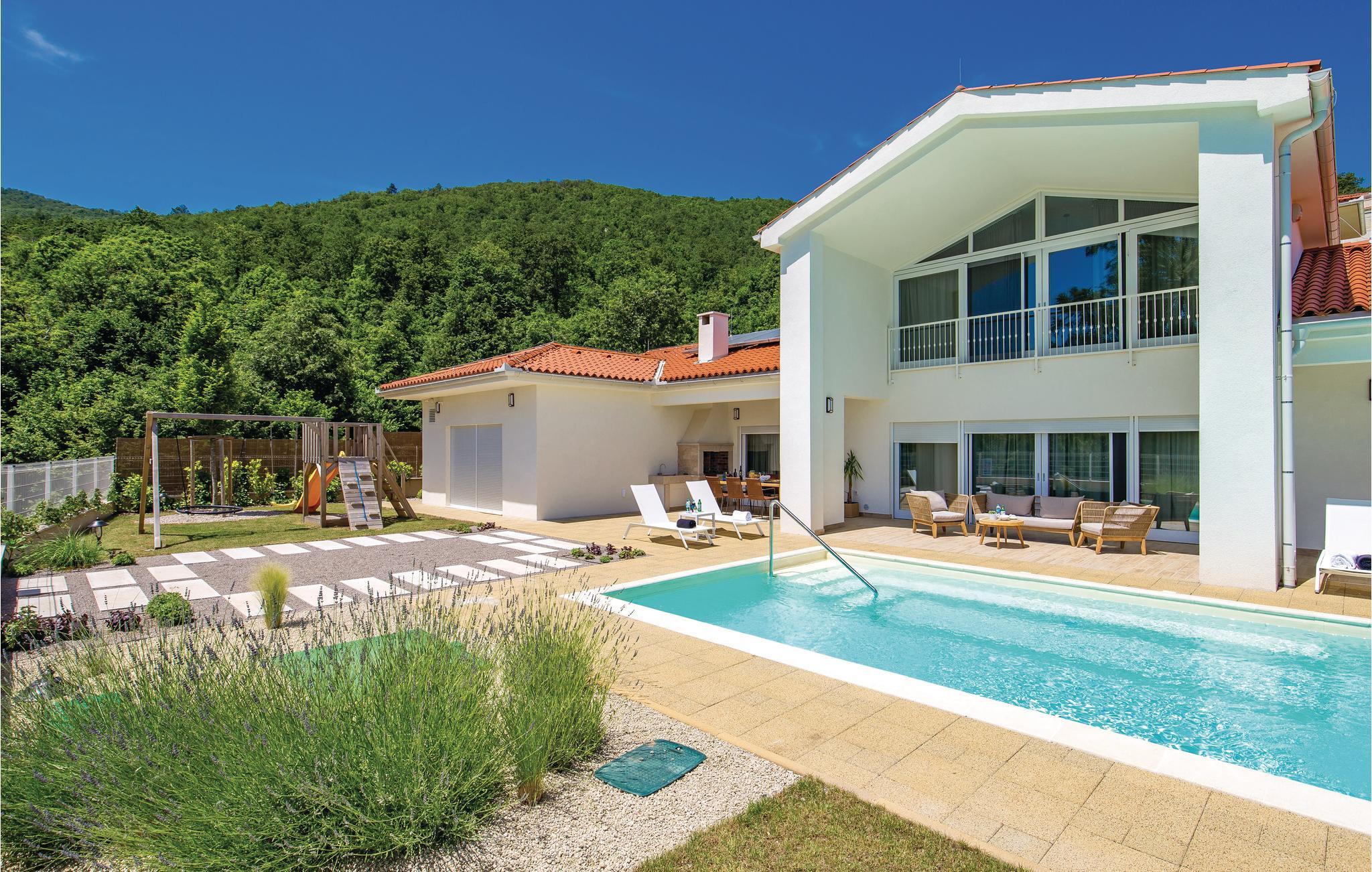 Indvendigt er huset udstyret med fitnessredskaber, miniwellness og vinkælder, og denne villa her ligeledes en garage til fire biler. Den indhegnede have er velegnet til børn som kan glæde sig til legeredskaber og en stor swimmingpool. Den store terrasse har udsigt til hele området og om natten en stjerneklar himmel. Gå ikke glip af at atge et smut til Opatija en aften hvor de mange gode restauranter vil fortrylle jer.