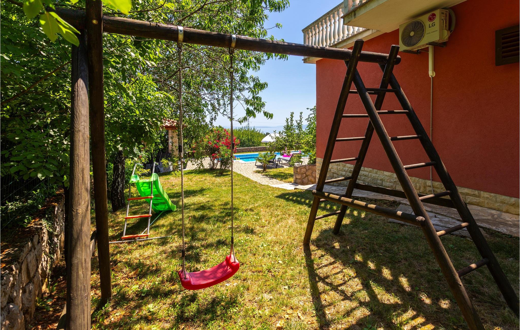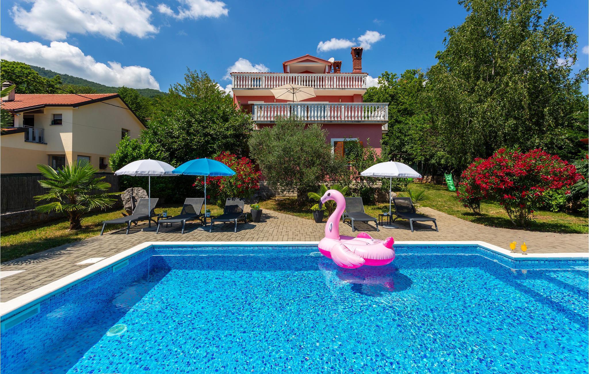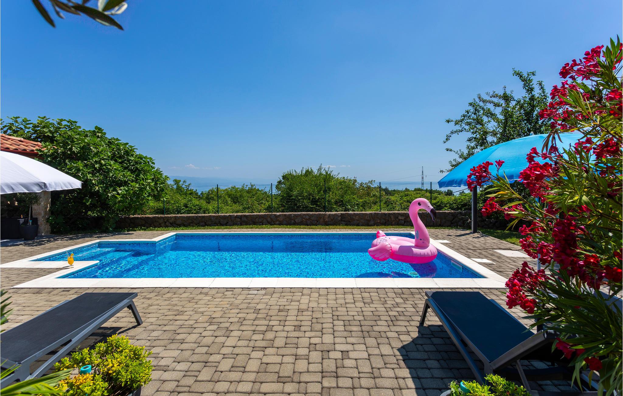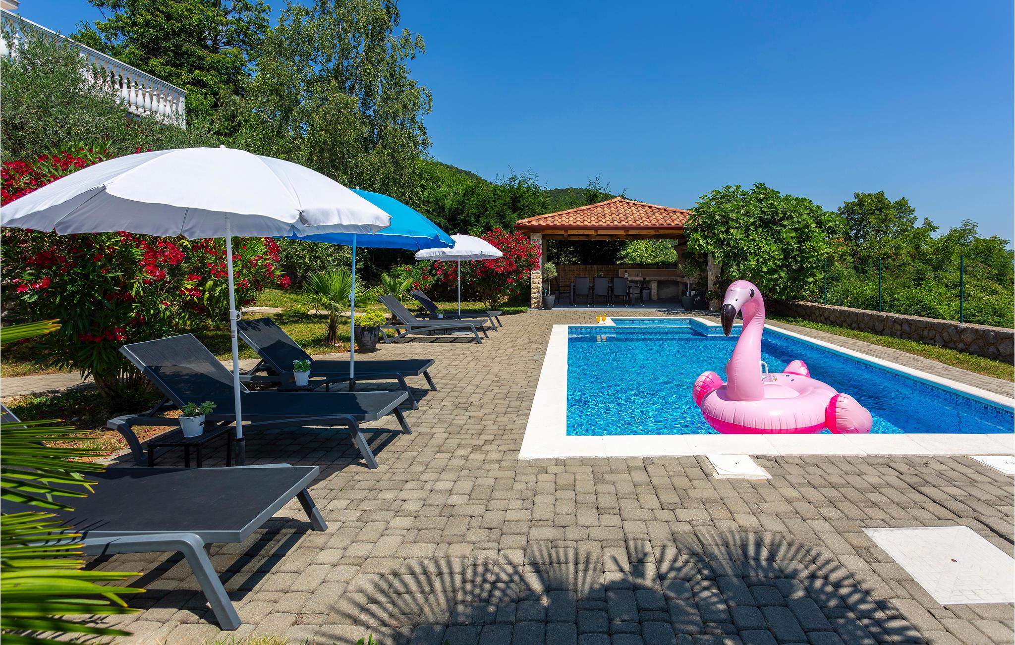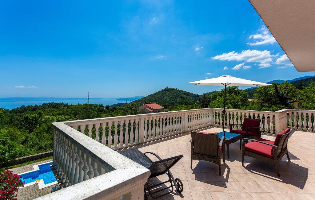 Dette feriehus ligger på Ucka-Bjergenes skråninger med en vidunderlig udsigt over Kvarn-Bugten. Huset har to etager med indendørs trapper. Den store terrasse er på øverste etage, med et legehjørne til børn, og passer til to familiers krav. Mest tid vil i tilbringe ved poolen og på den overdækkede terrasse i haven, hvor I kan lave lækker mad på grillen. Kun et par minutters kørsel væk ligger de kendte strande Moscenicka draga og Icici. Lær på en aftenspadseretur også den kendte ferieby Opatija og dens strandpromenade at kende, der strækker sig over flere kilometer gennem kystbyerne.