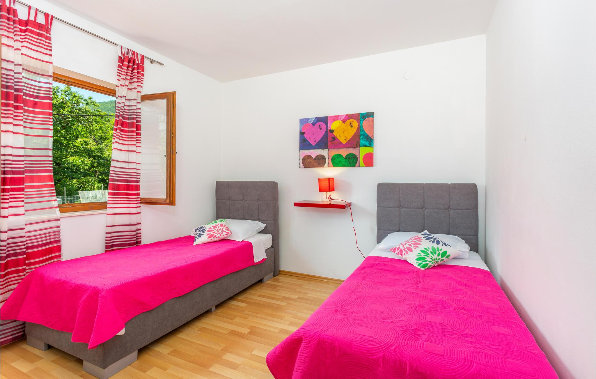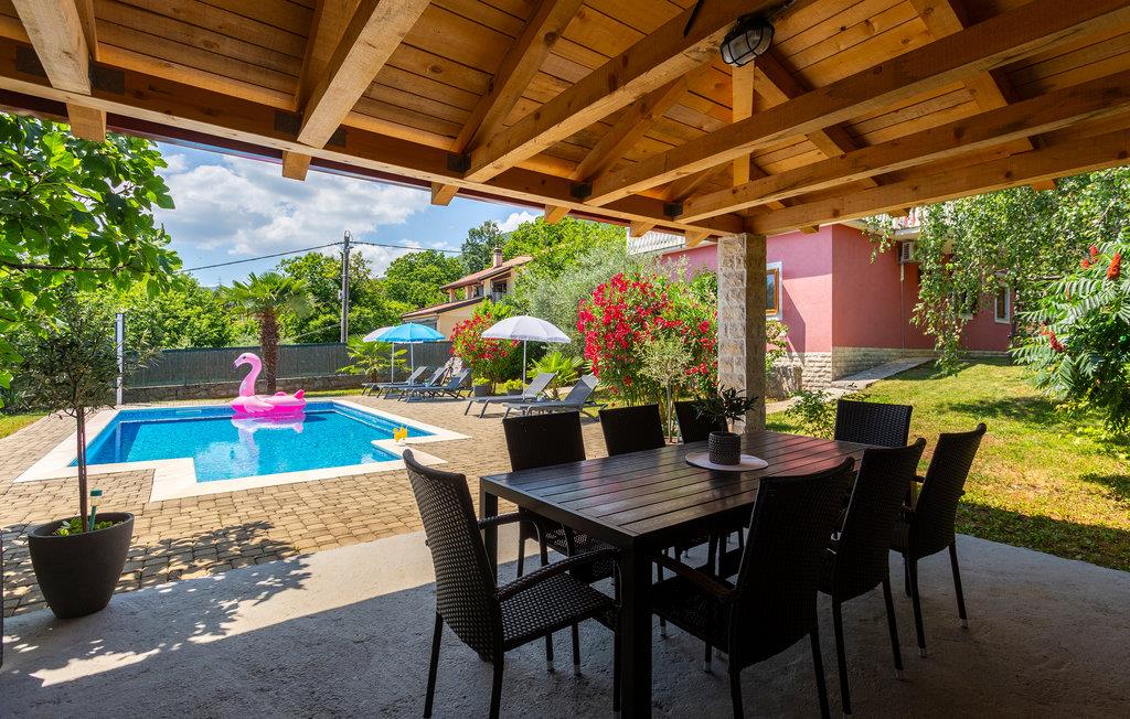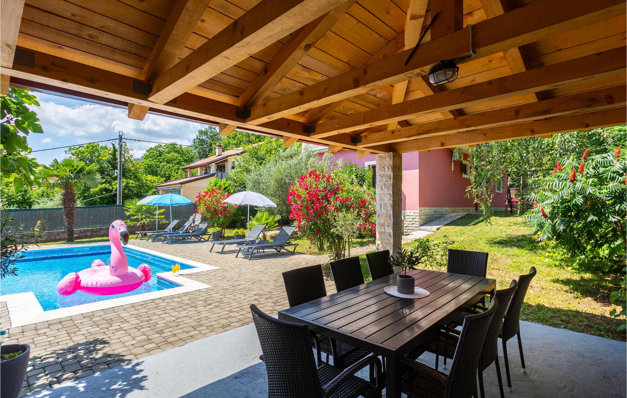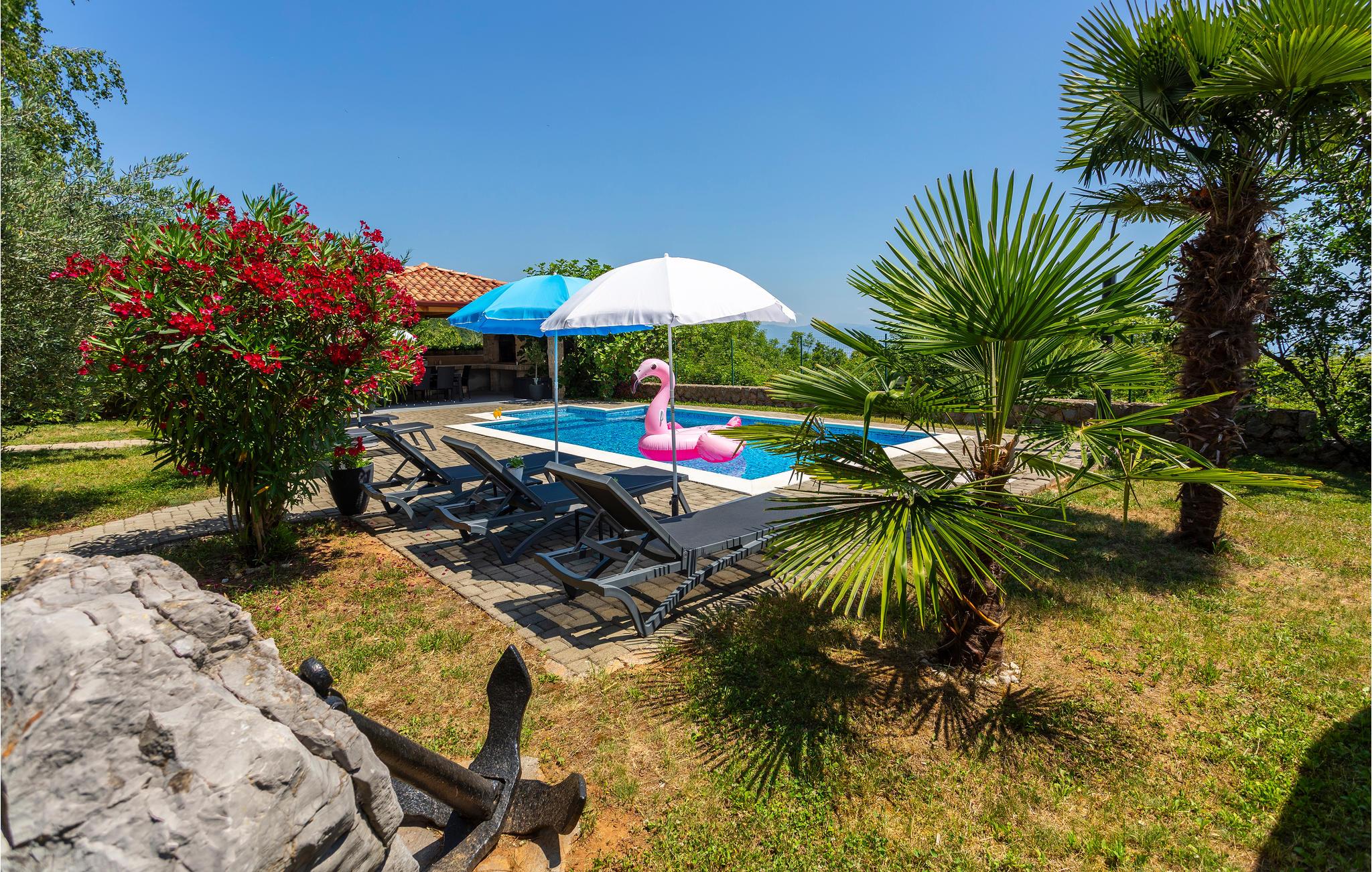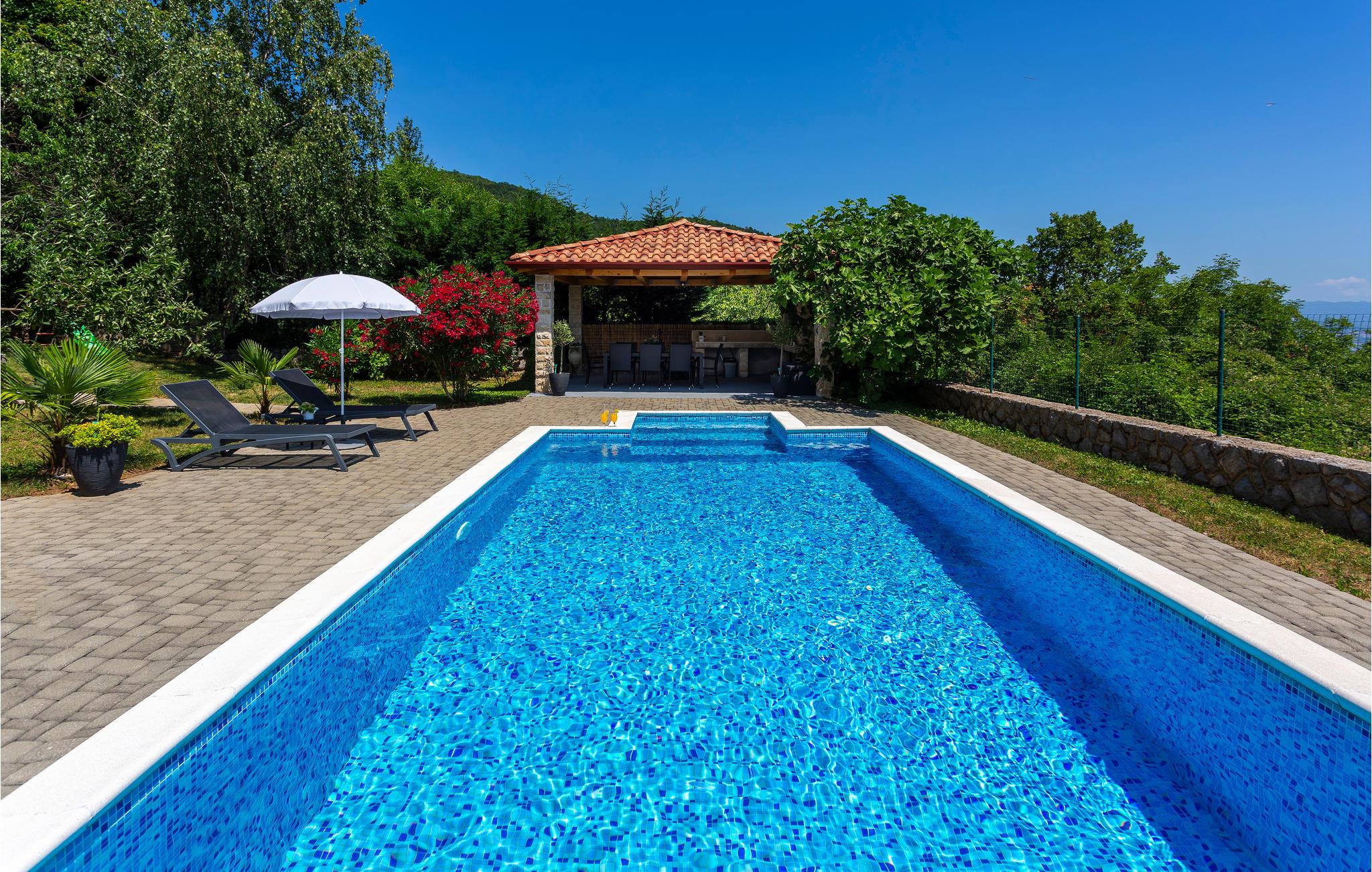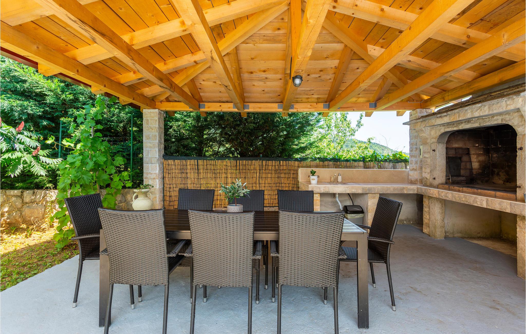 Dette feriehus ligger på Ucka-Bjergenes skråninger med en vidunderlig udsigt over Kvarn-Bugten. Huset har to etager med indendørs trapper. Den store terrasse er på øverste etage, med et legehjørne til børn, og passer til to familiers krav. Mest tid vil i tilbringe ved poolen og på den overdækkede terrasse i haven, hvor I kan lave lækker mad på grillen. Kun et par minutters kørsel væk ligger de kendte strande Moscenicka draga og Icici. Lær på en aftenspadseretur også den kendte ferieby Opatija og dens strandpromenade at kende, der strækker sig over flere kilometer gennem kystbyerne.