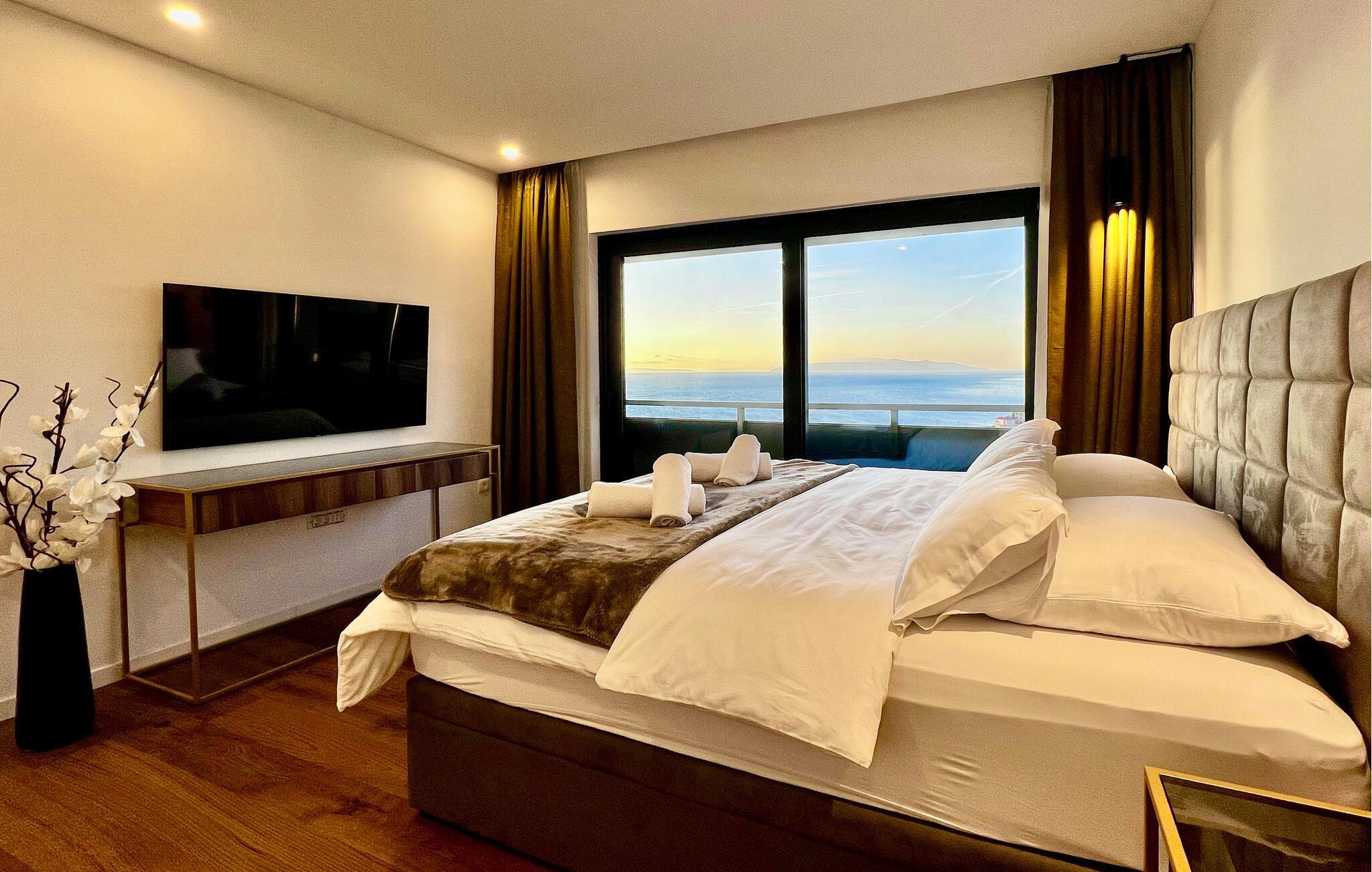 Denne exceptionelle luksusejendom forkæler jer med et stilfuldt interiør af høj kvalitet og en fantastisk panoramaudsigt over havet. Fremtryll kulinariske højdepunkter i det moderne køkken, og nyd måltiderne i den åbne opholdsstue, hvor store vinduer giver masser af naturligt lys. Om aftenen fremhæves de smagfulde møbler af varmt lys – lad brændeovnen sørge for ekstra hygge, mens I slapper af i sofaen.