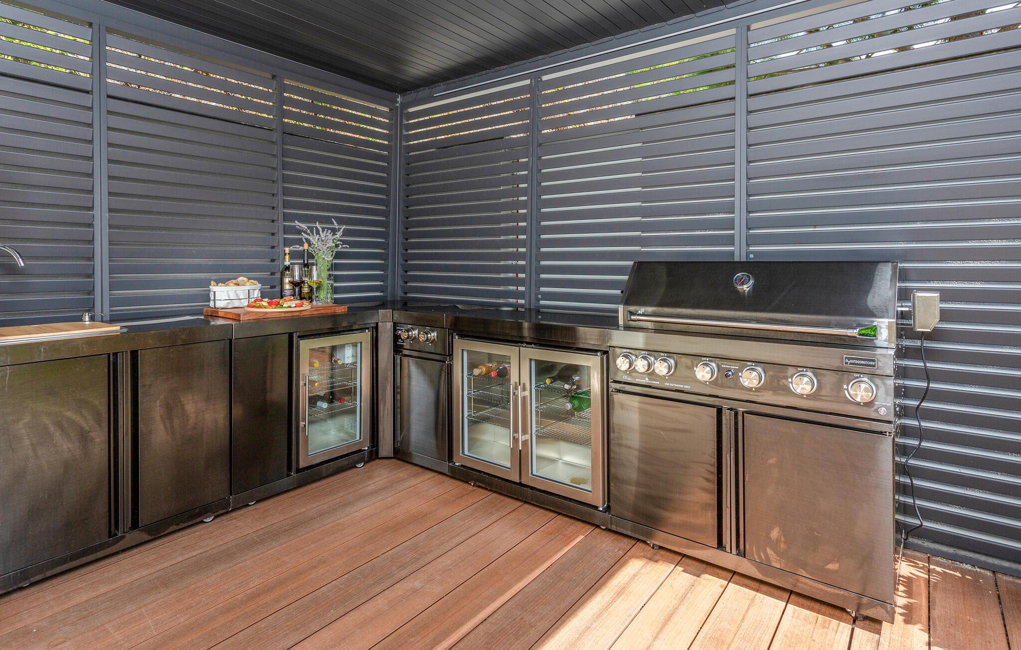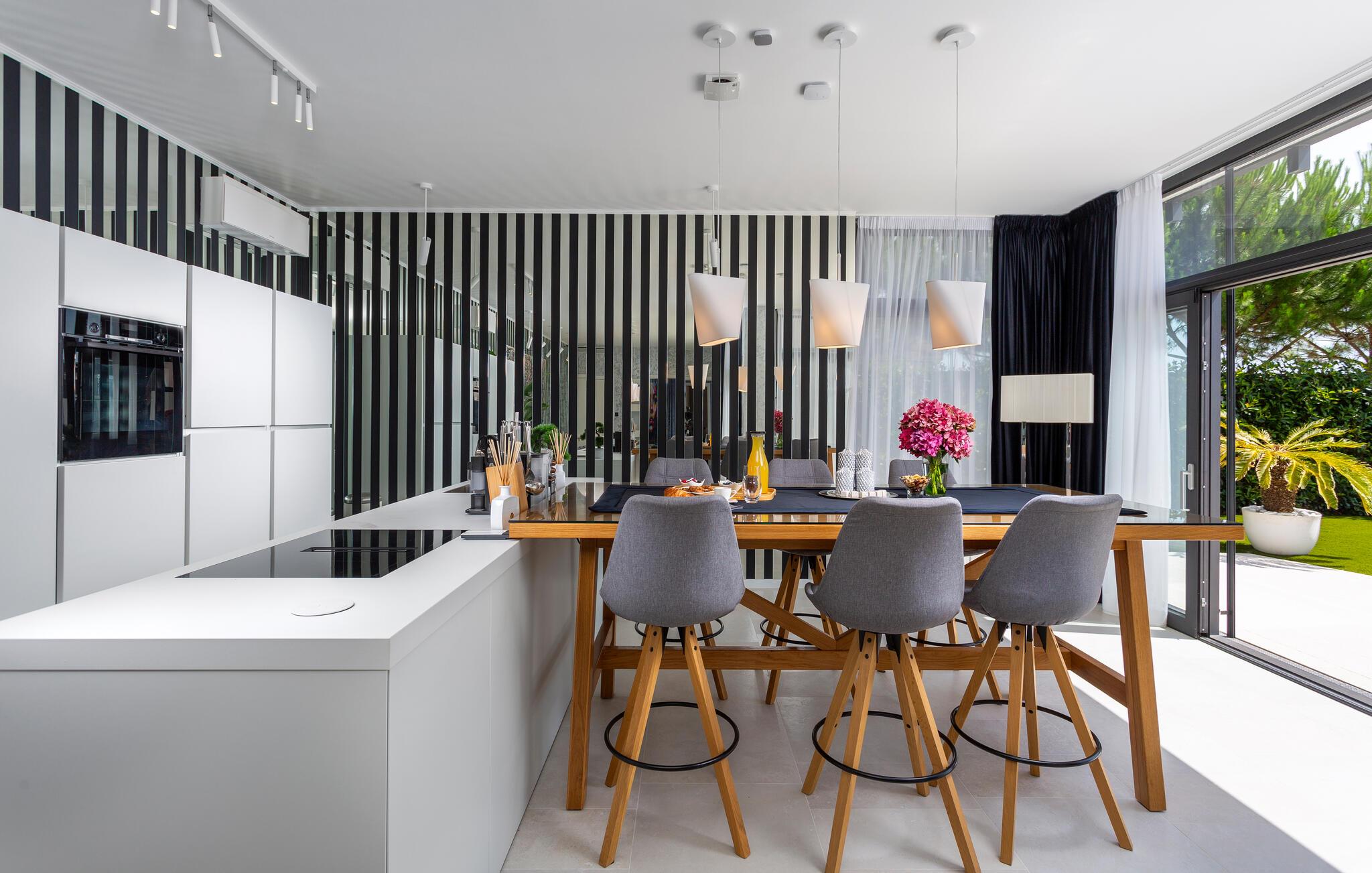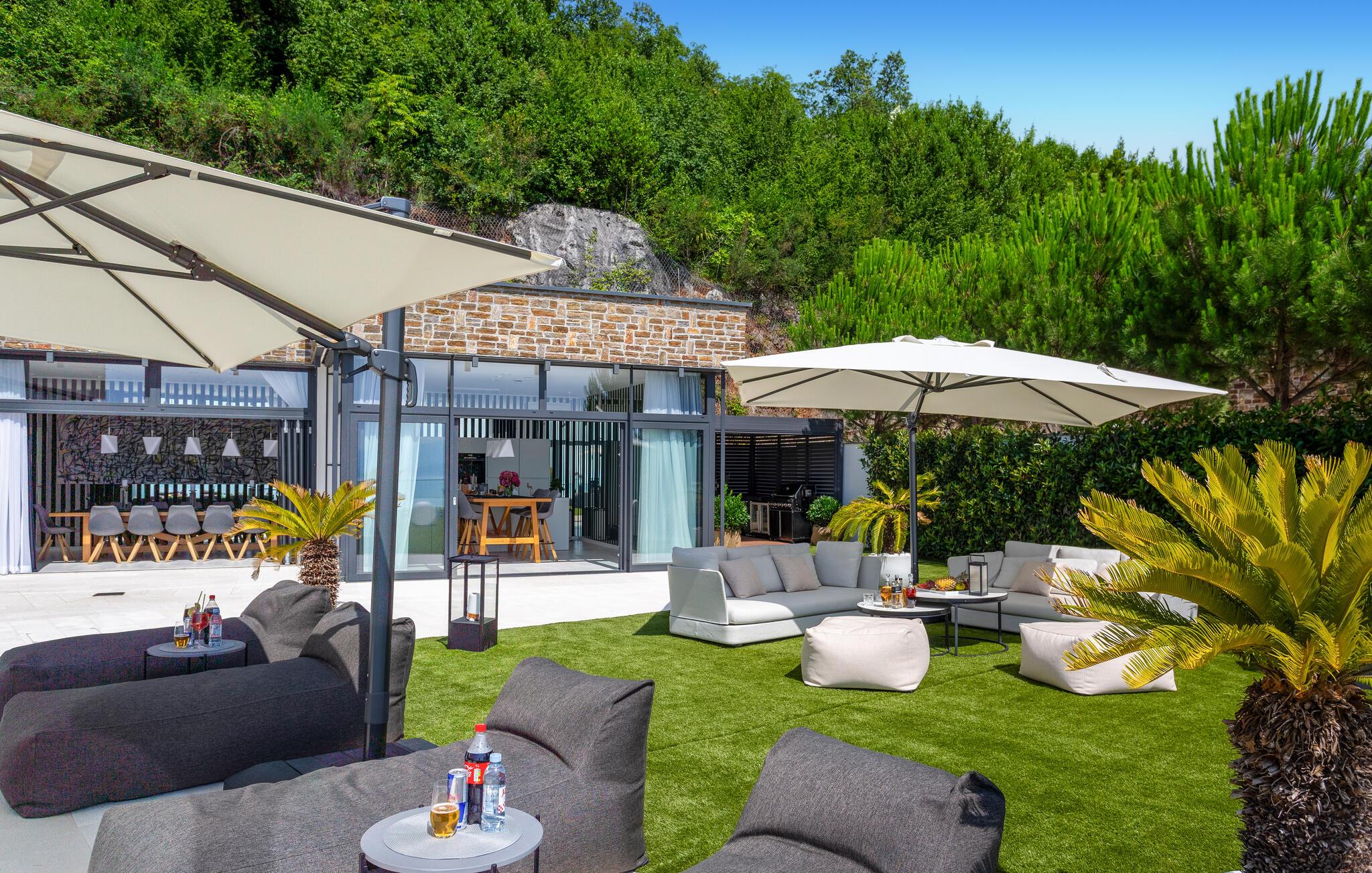 Udeområdet er tilsvarende ekstravagant med flere forskellige terrasser, hvor I kan finde sol, skygge og læ efter behov. Begynd dagen med en friskbrygget morgenkaffe i det fri, lad jer bage igennem i solen og dyp jer i poolen lige så tit, I lyster. Ud på eftermiddagen kan I fyre op i grillen og tilberede nogle saftige bøffer under aftensolen, inden I lader en smuk sommeraften gå på hæld under stjernerne i det udendørs spabad.