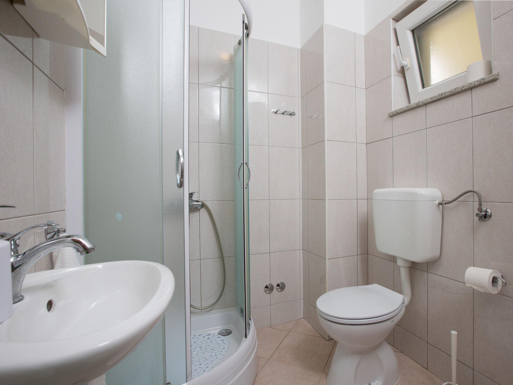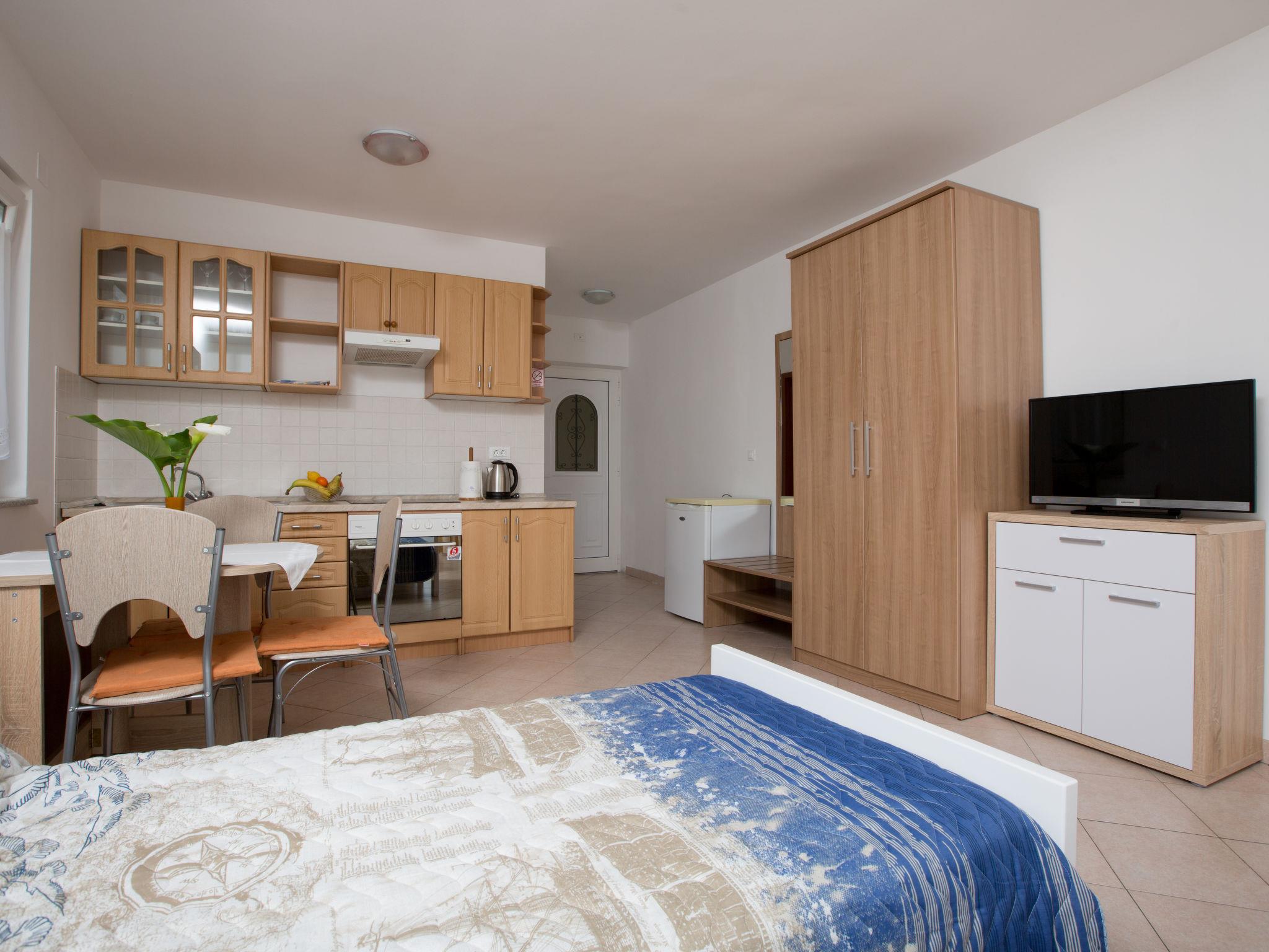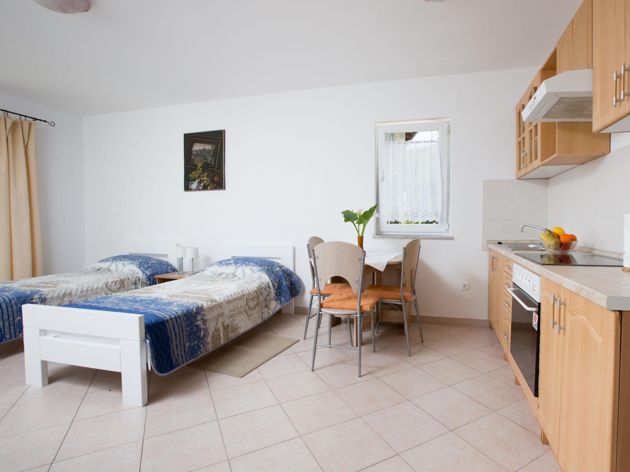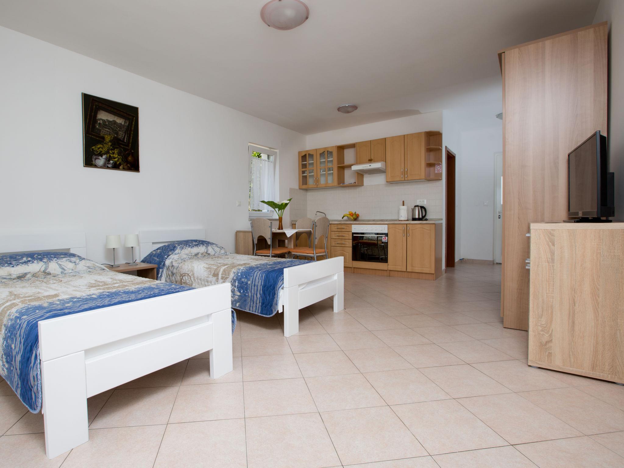 1-room apartment 30 m2 on 1st floor. Studio with 2 beds (90 cm, length 200 cm), satellite TV and air conditioning. Exit to the balcony. Open kitchen (oven, 4 ceramic glass hob hotplates, toaster, kettle, electric coffee machine). Shower/WC. Forced-air heating. Balcony 14 m2. Balcony furniture. View of the sea. Facilities: washing machine, hair dryer. Internet (WiFi, free). Please note: non-smoking house. Private entrance.