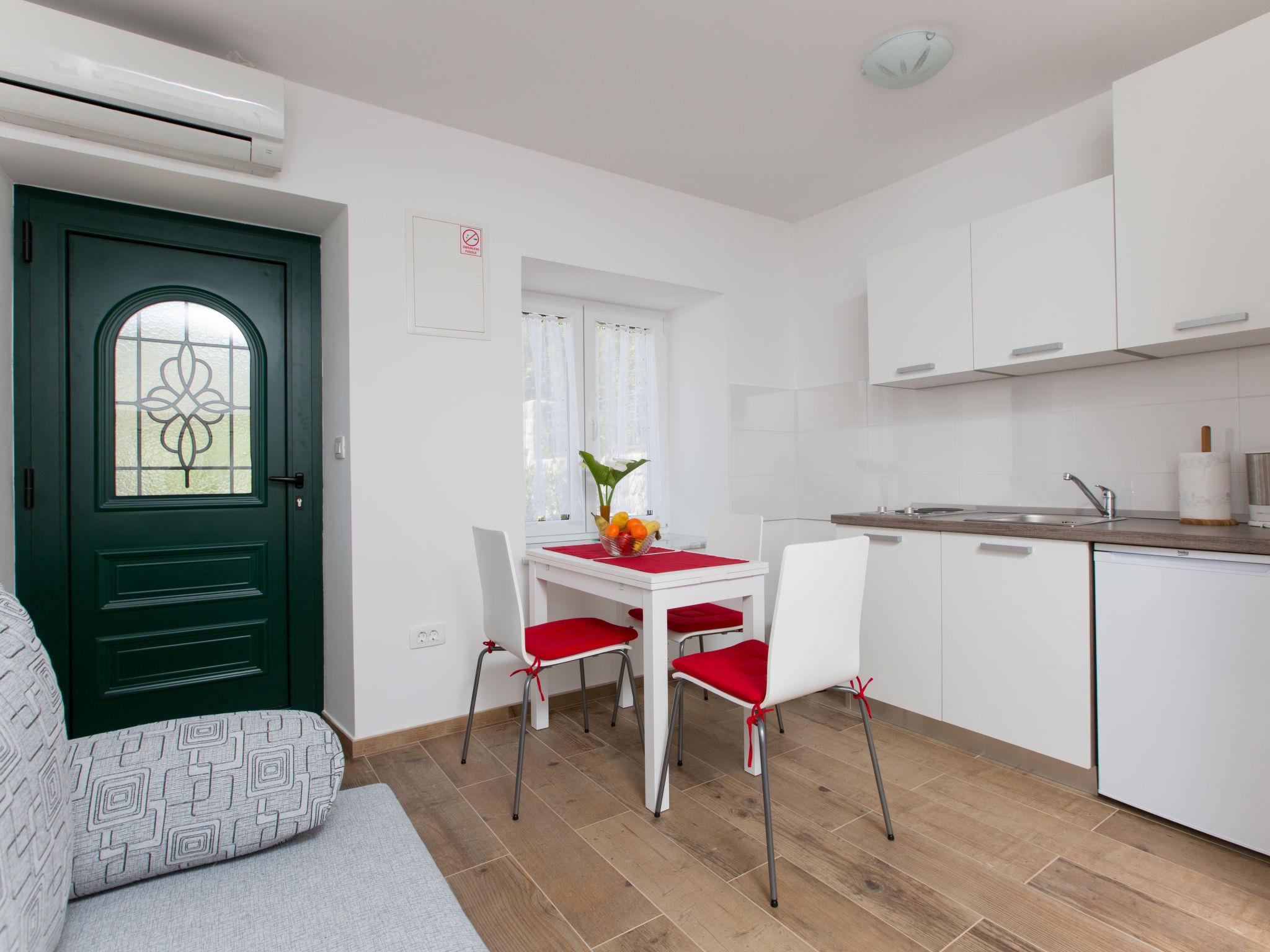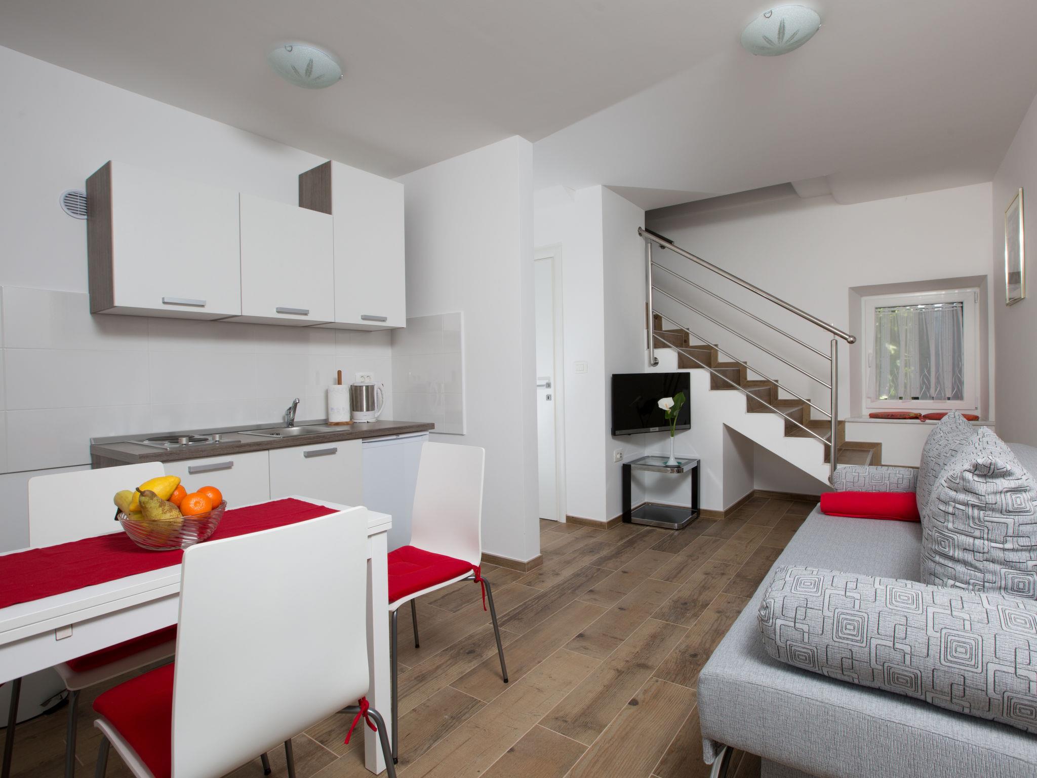 2-room apartment 38 m2 on 2 levels on 1st floor. Living/dining room with 1 sofabed (100 cm, length 200 cm), satellite TV and air conditioning. Exit to the terrace. Open kitchen (2 hot plates, toaster, kettle, microwave, electric coffee machine). Shower/WC. Forced-air heating. Upper floor: 1 room with 1 double bed (2 x 80 cm, length 200 cm), air conditioning. Exit to the balcony. Balcony 5 m2, terrace 10 m2. Terrace furniture, balcony furniture. View of the sea. Facilities: washing machine, hair dryer. Internet (WiFi, free). Please note: non-smoking house. Private entrance.