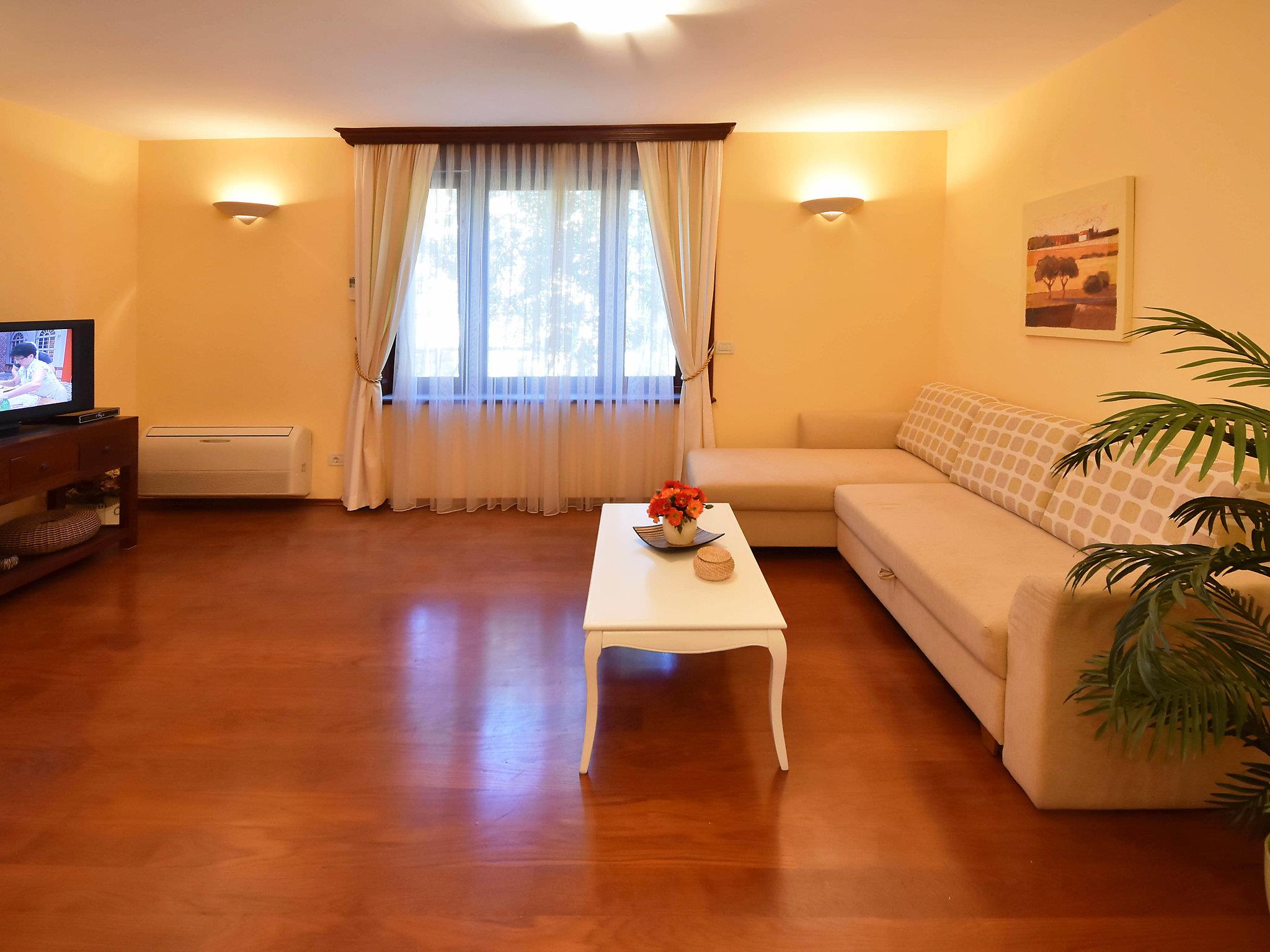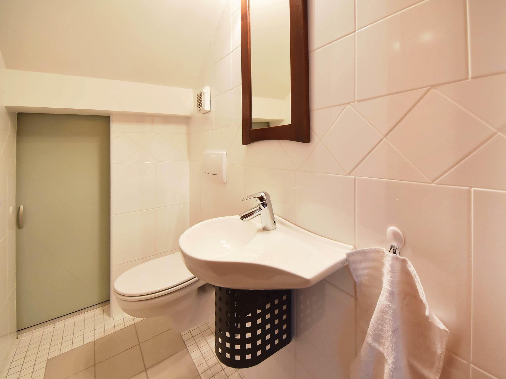2-room apartment 60 m2 on 2 levels on 1st floor. Living/dining room 28 m2 with satellite TV (flat screen), air conditioning. Open kitchen (oven, dishwasher, 2 ceramic glass hob hotplates, microwave, freezer, electric coffee machine). Upper floor: 1 large room 24 m2 with 1 french bed (160 cm, length 200 cm), shower/WC and air conditioning. No heating option. Facilities: washing machine. Internet (WiFi, free).