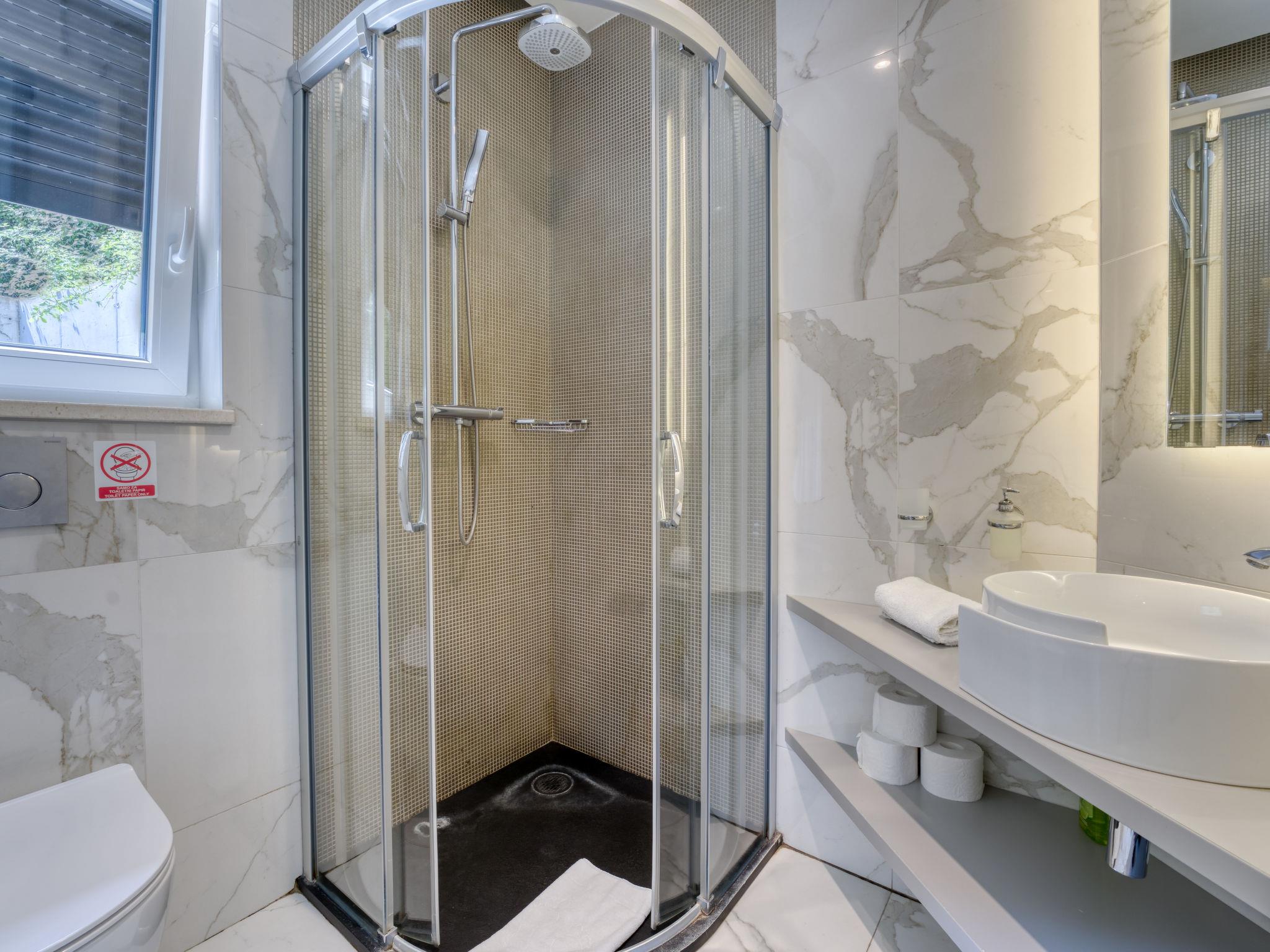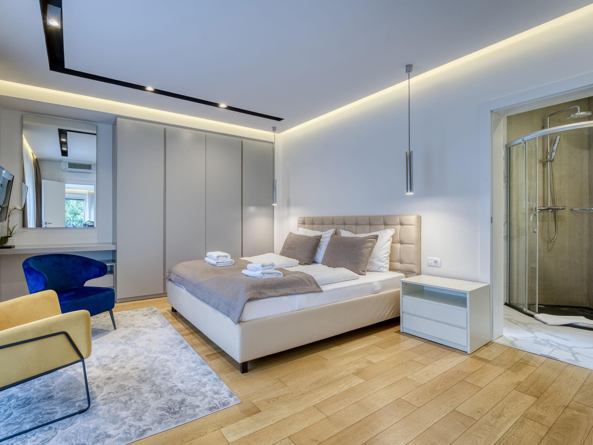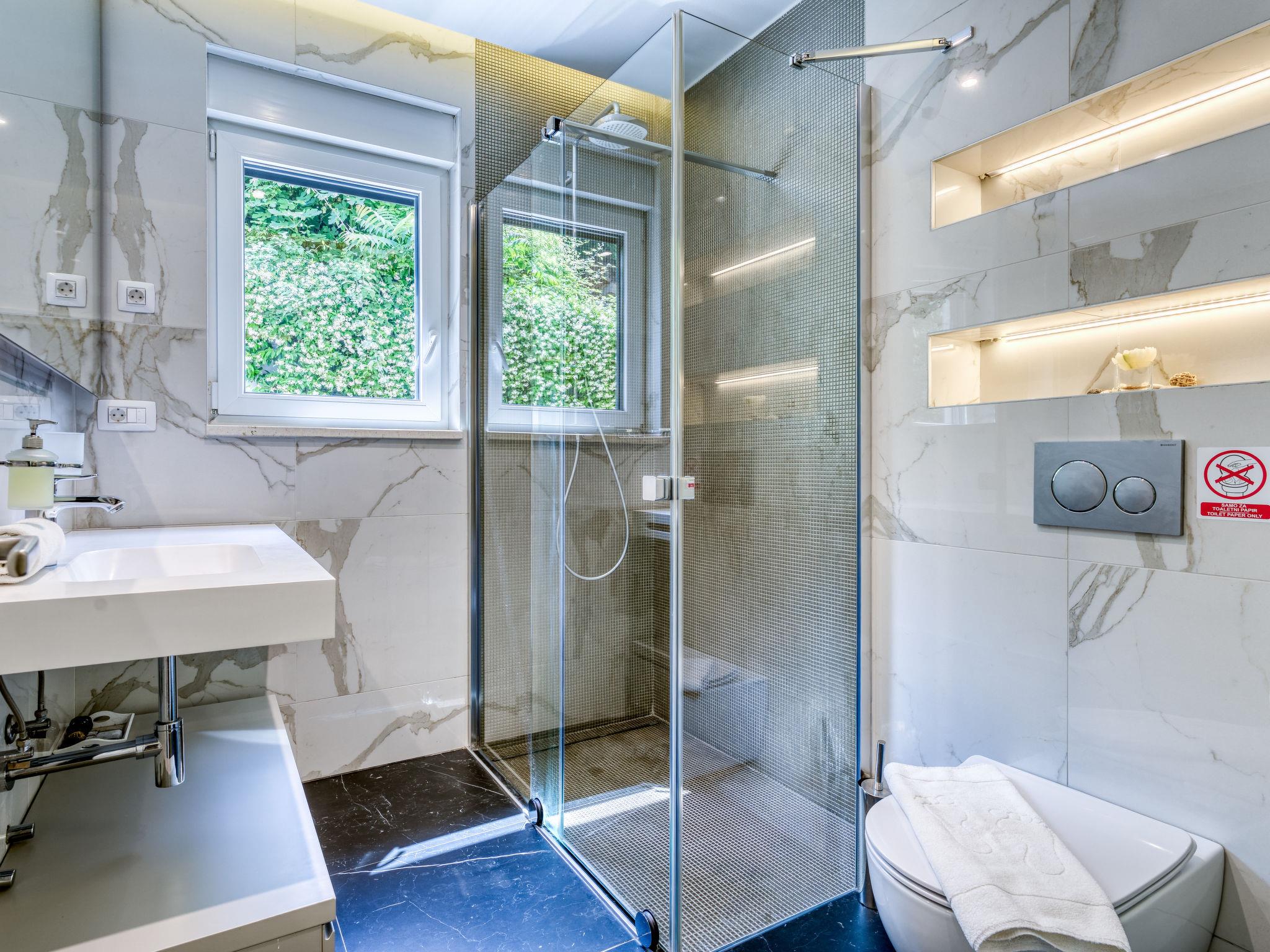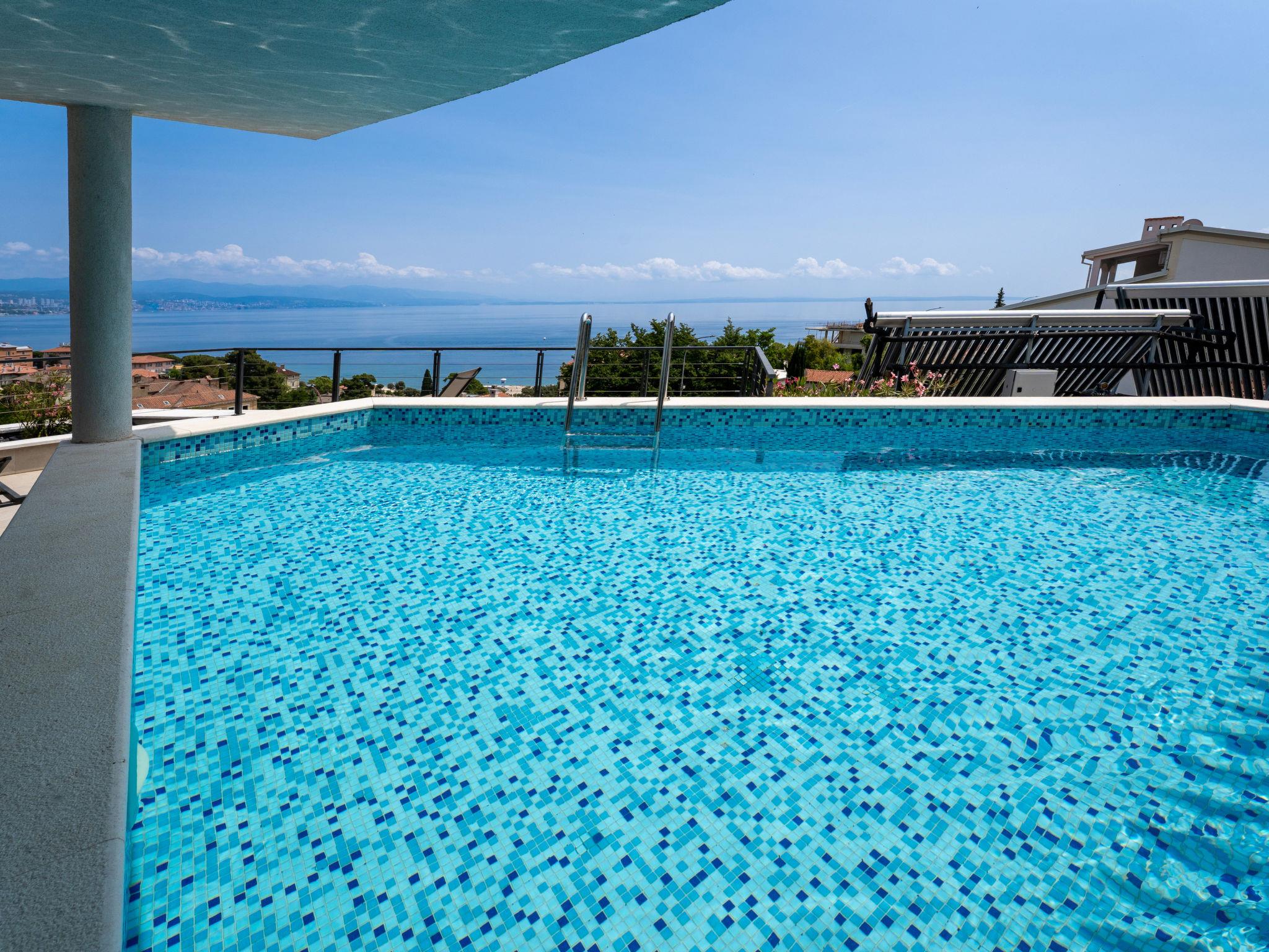 Modern, cosy apartment house "Villa Ziza". 250 m from the centre of Opatija, 600 m from the sea, 600 m from the beach, located by a road. For shared use: property 900 m2 with plants, swimming pool (above ground) heated (5 x 5 m, depth 85 cm, seasonal availability: 01.Jan. - 31.Dec.). Unconventional pool shape. Outdoor shower. In the house: internet access, roof terrace. E-charging station. Supermarket, shopping centre 650 m, restaurant, café, bus stop 500 m, concrete beach 600 m. Walking paths from the house 100 m. Groups of teenagers on request only. The swimming pool is situated on the roof terrace (50 m2, garden furniture).