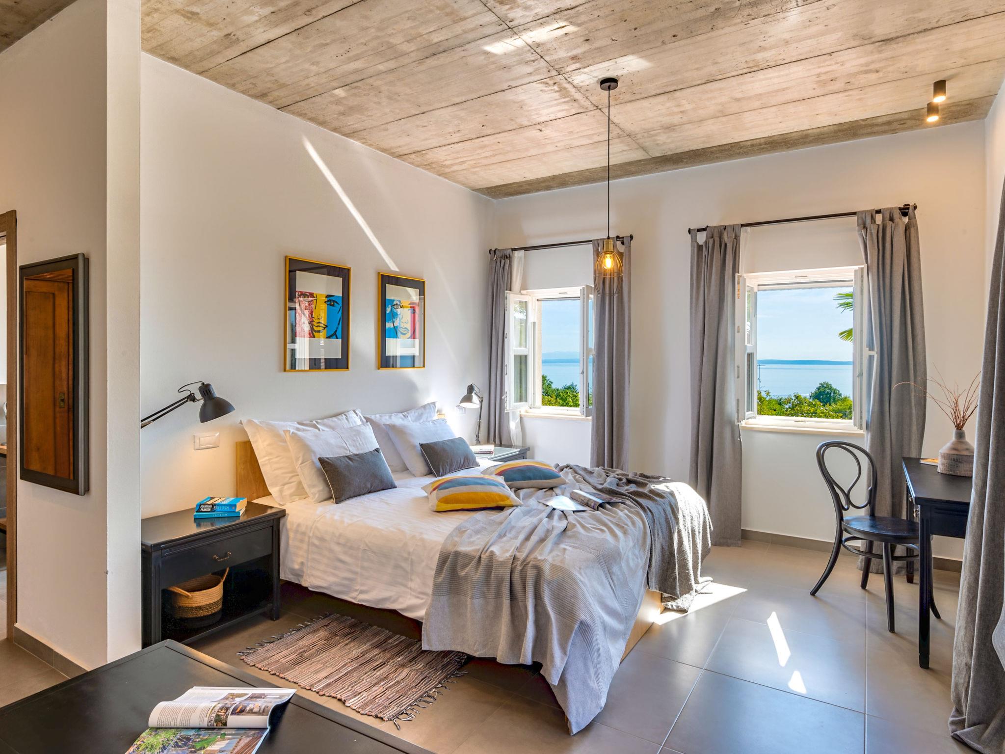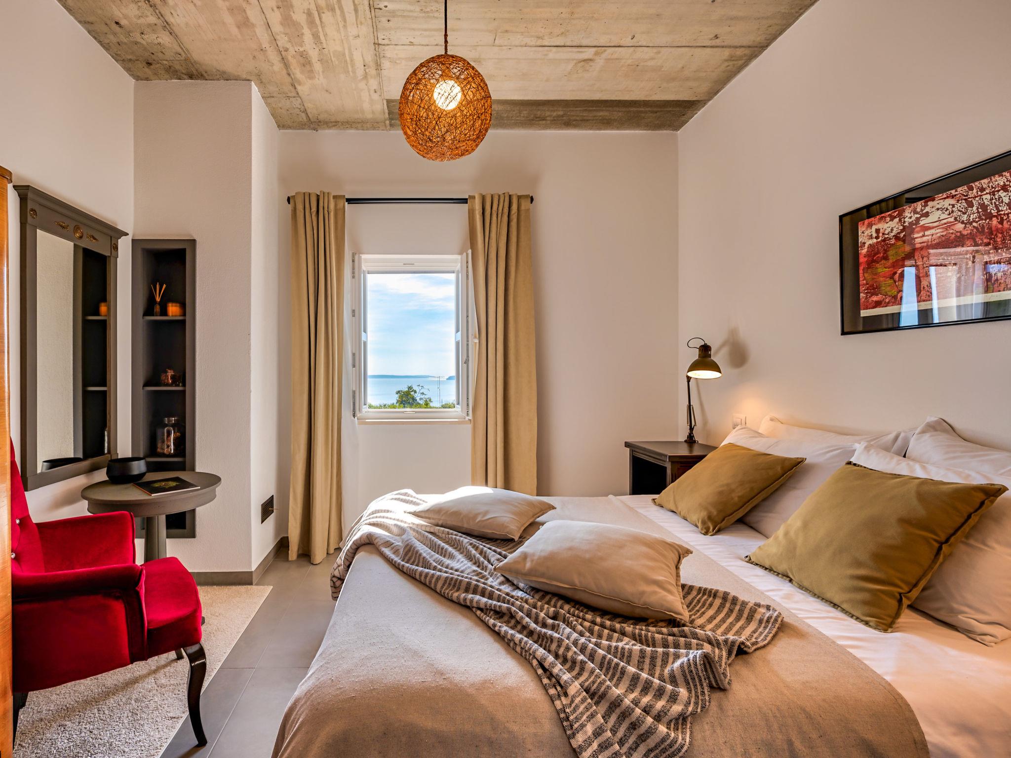 5-room villa 260 m2 on 2 levels. Living/dining room with open-hearth fireplace and cable TV (flat screen), air conditioning. Exit to the terrace, to the swimming pool. 1 room with 1 french bed (160 cm, length 200 cm), shower/WC. Exit to the terrace. Open kitchen (oven, dishwasher, 4 ceramic glass hob hotplates, toaster, kettle, freezer, electric coffee machine). Exit to the terrace. Upper floor: 2 rooms, each room with 1 french bed (160 cm, length 200 cm), shower/WC and air conditioning. 1 room with 1 french bed (180 cm, length 200 cm), bath/bidet/WC and air conditioning. Exit to the terrace. Floor heating, forced-air heating. Terrace 50 m2, roofed, 25 m2, roofed. Terrace furniture, balcony furniture, deck chairs (8). Beautiful view of the sea. Facilities: safe, iron, baby cot, hair dryer. Internet (WiFi, free). Parking (5 cars). Please note: non-smoking house. Maximum 1 small pet/ dog allowed.