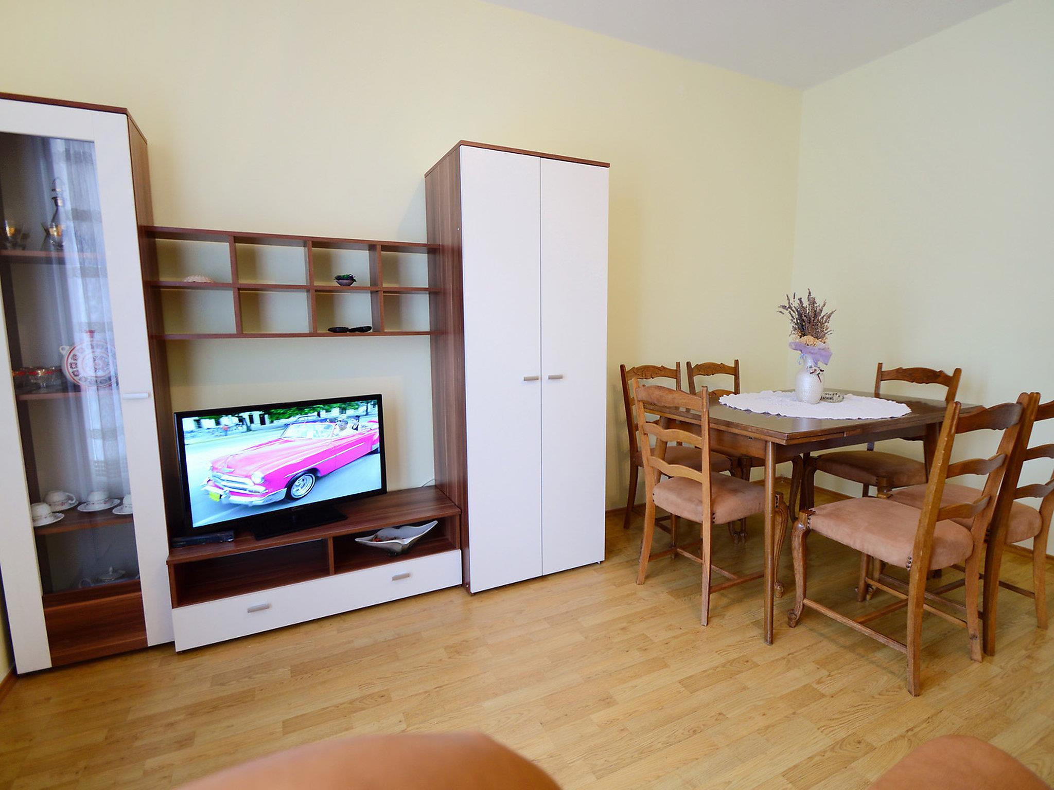 3-room apartment 80 m2, on the ground floor, south facing position. Living/dining room with satellite TV (flat screen), air conditioning. Exit to the terrace. 1 room 16 m2 with 1 double bed (2 x 90 cm, length 190 cm). Exit to the terrace. 1 room 16 m2 with 1 bed (90 cm, length 190 cm), 1 double bed (2 x 90 cm, length 190 cm). Exit to the terrace. Kitchen (4 hot plates, oven, freezer, electric coffee machine). Shower/WC, sep. WC. Heating (extra), air-conditioning (extra). Large terrace 50 m2. Facilities: Internet (WiFi, free). Please note: private entrance.