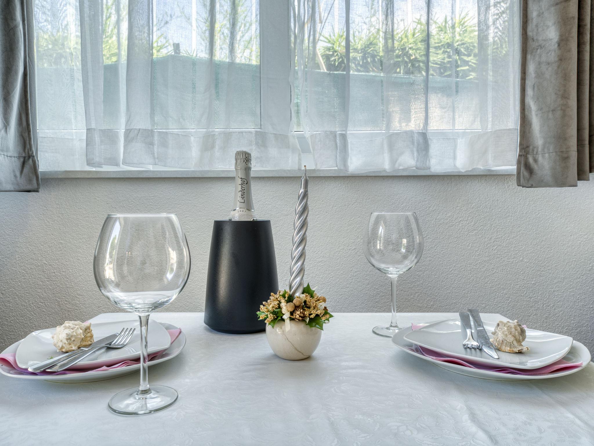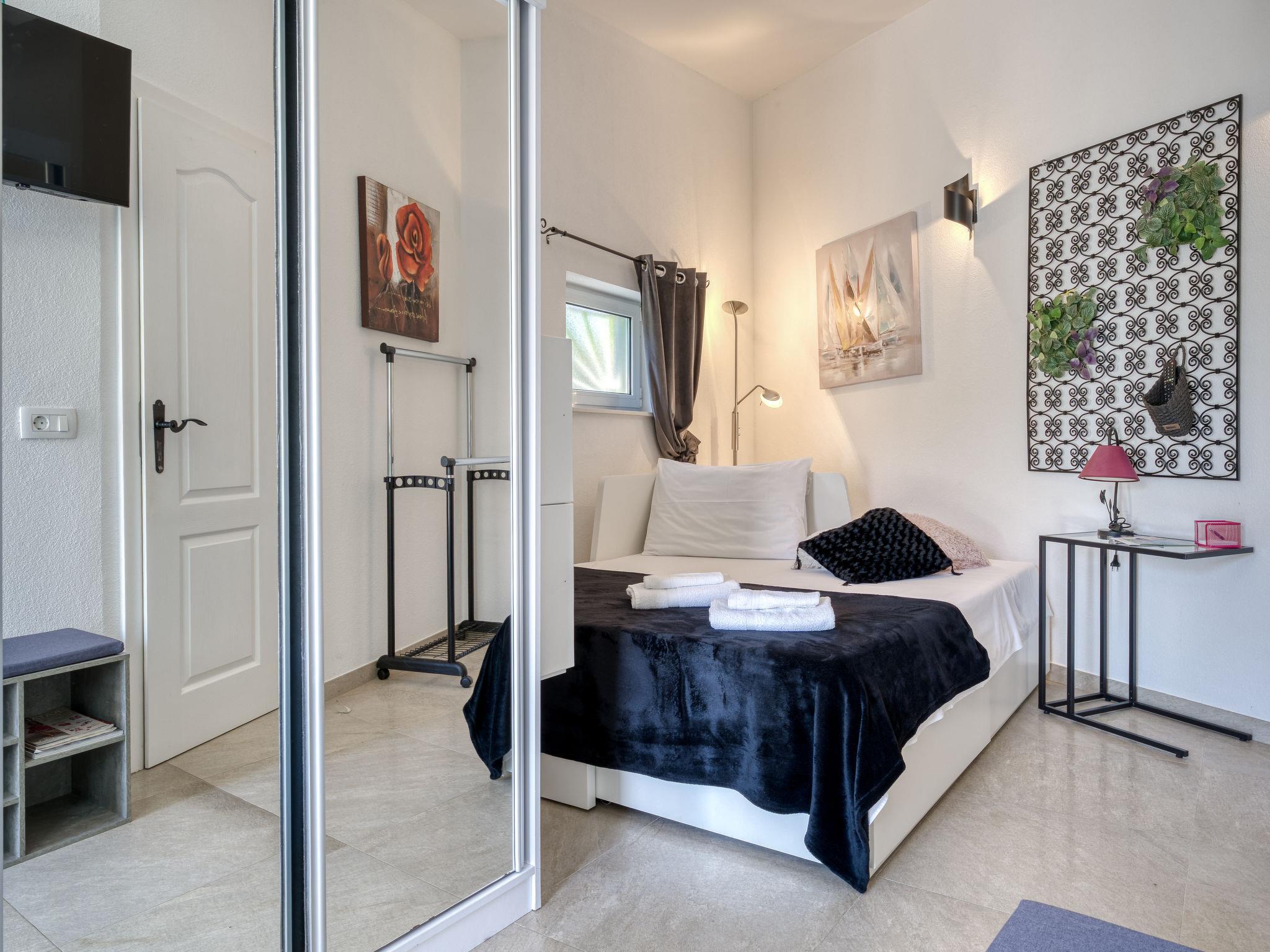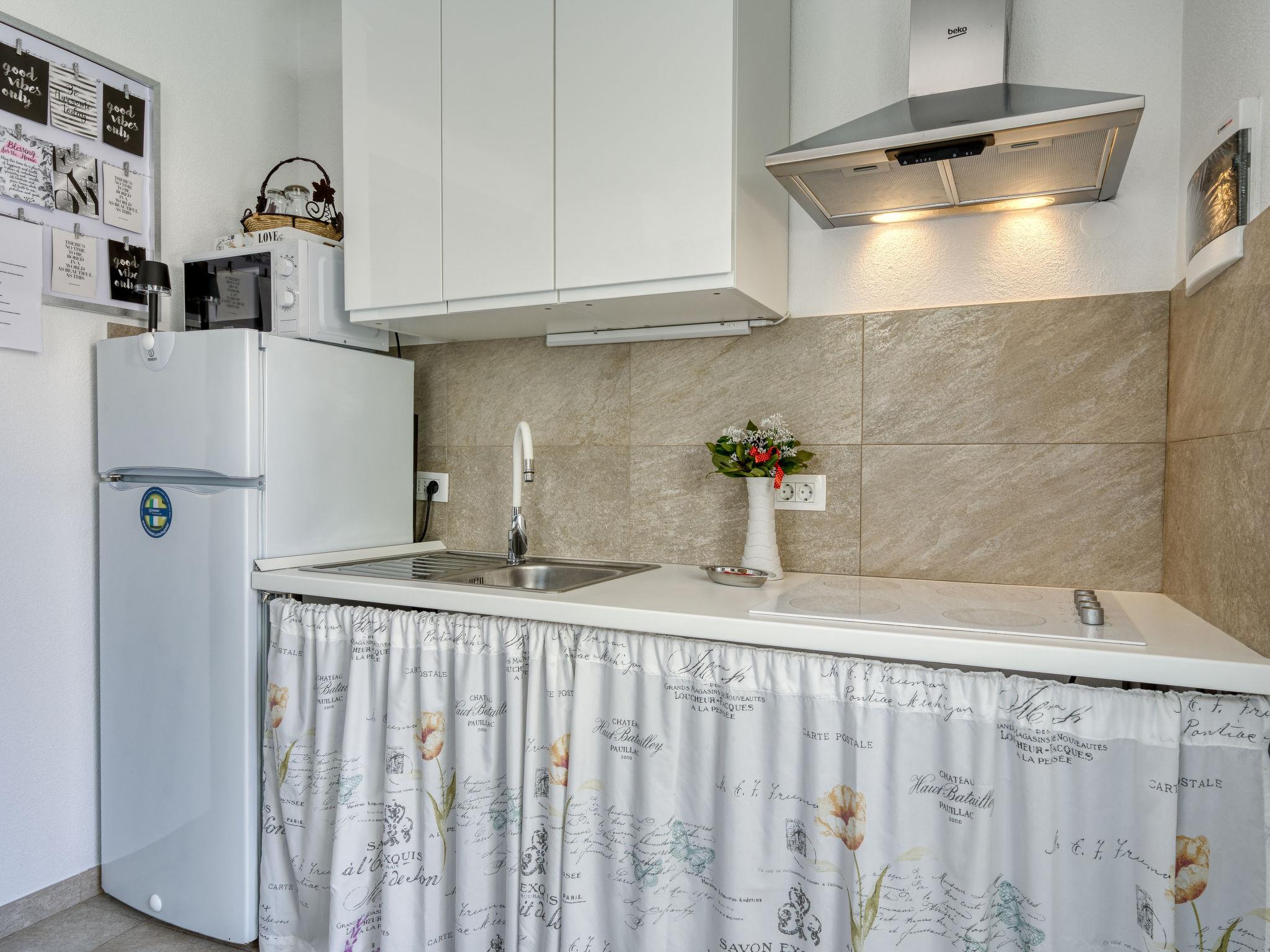 "Villa Nika Studio", 1-room bungalow 20 m2, south facing position. Studio with 1 pull-out bed (2 x 90 cm, length 200 cm), satellite TV and air conditioning. Exit to the terrace. Open kitchen (4 ceramic glass hob hotplates, kettle, microwave, freezer, electric coffee machine). Shower/WC. Terrace 8 m2. Terrace furniture. Facilities: washing machine. Internet (WiFi, free). Please note: non-smoking house.