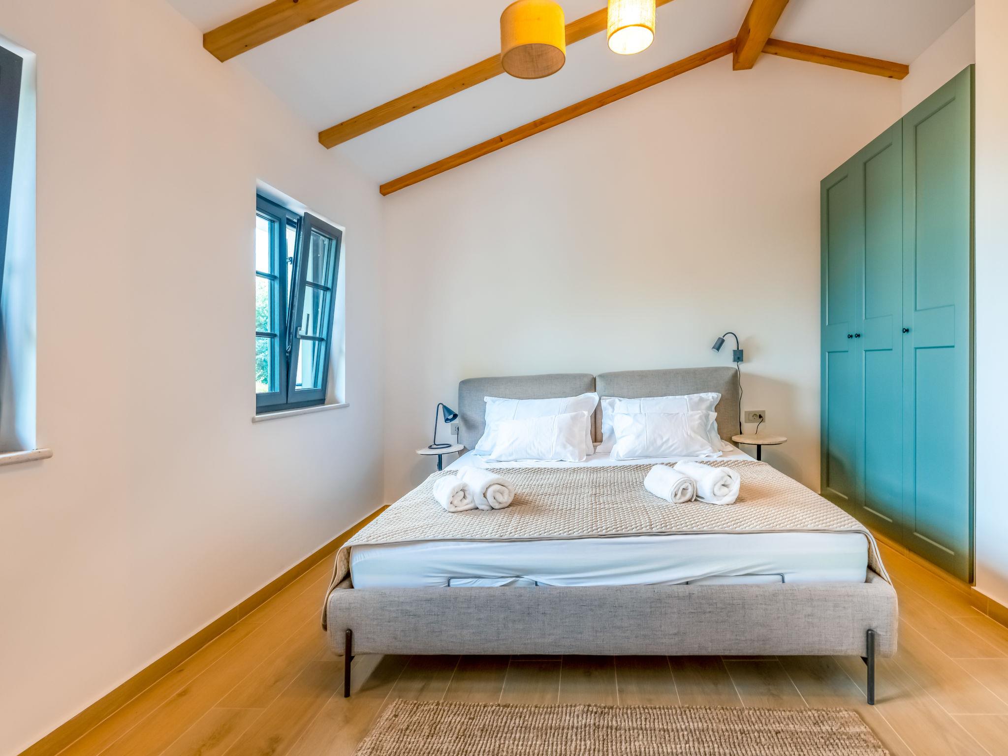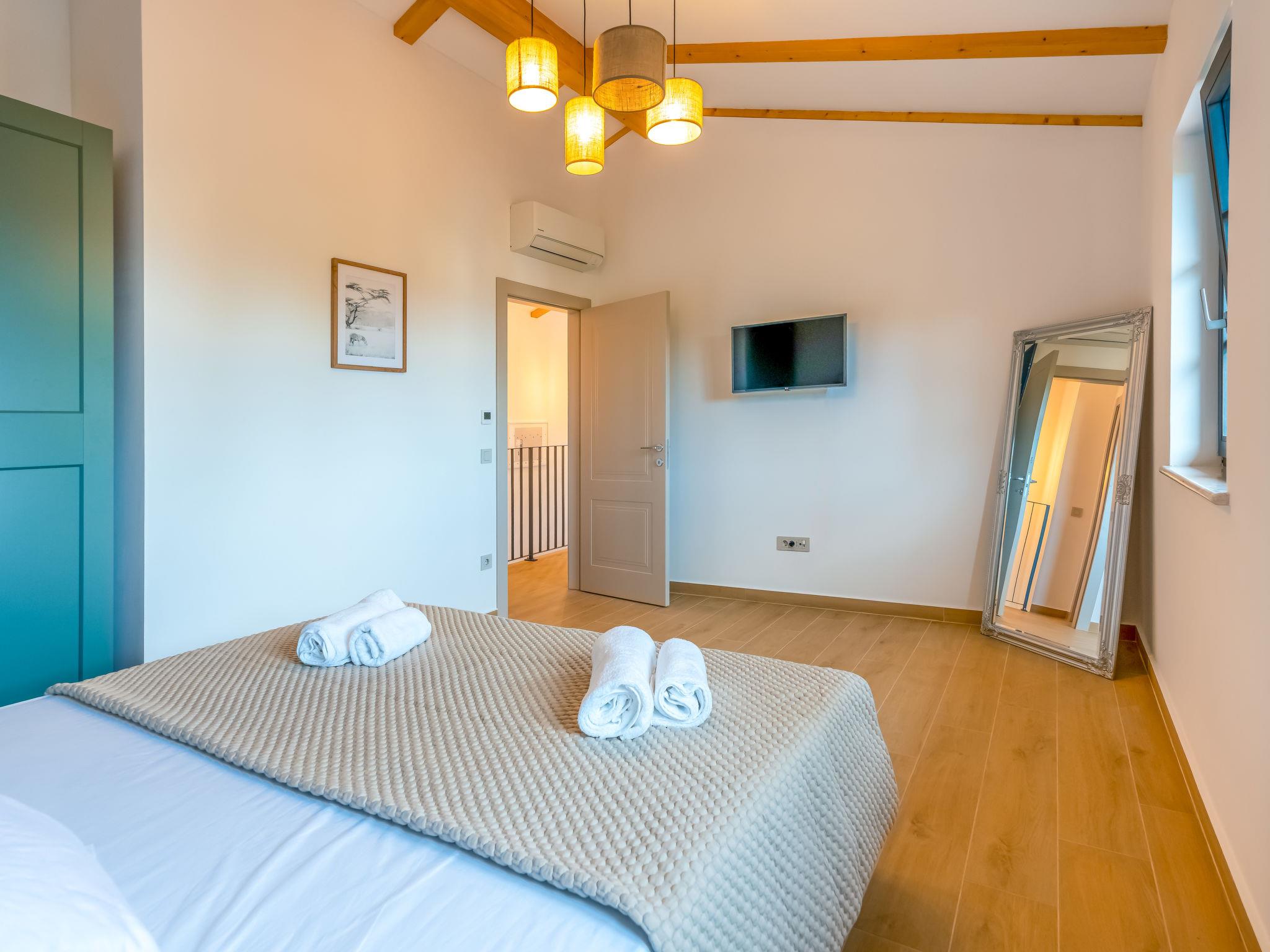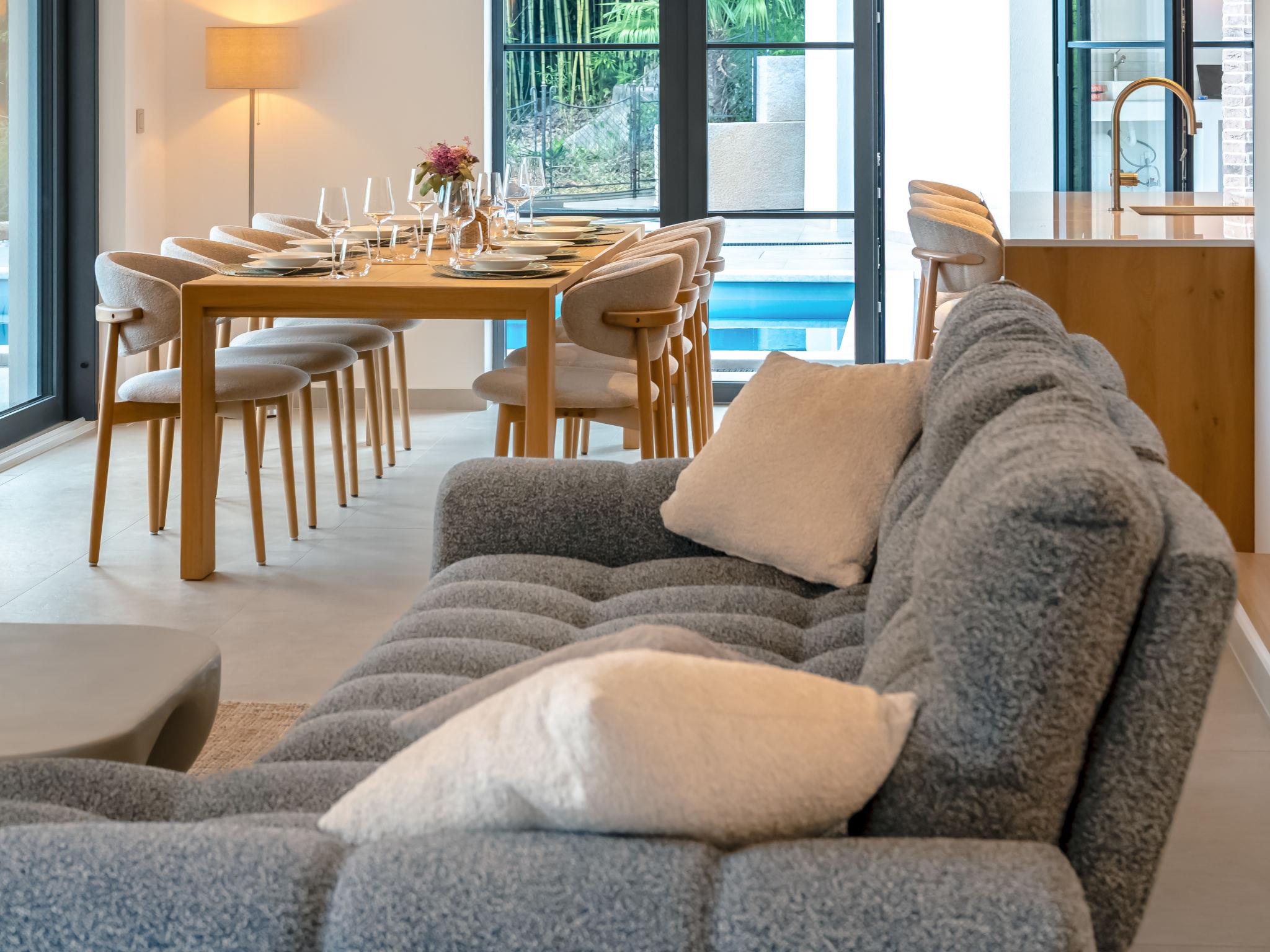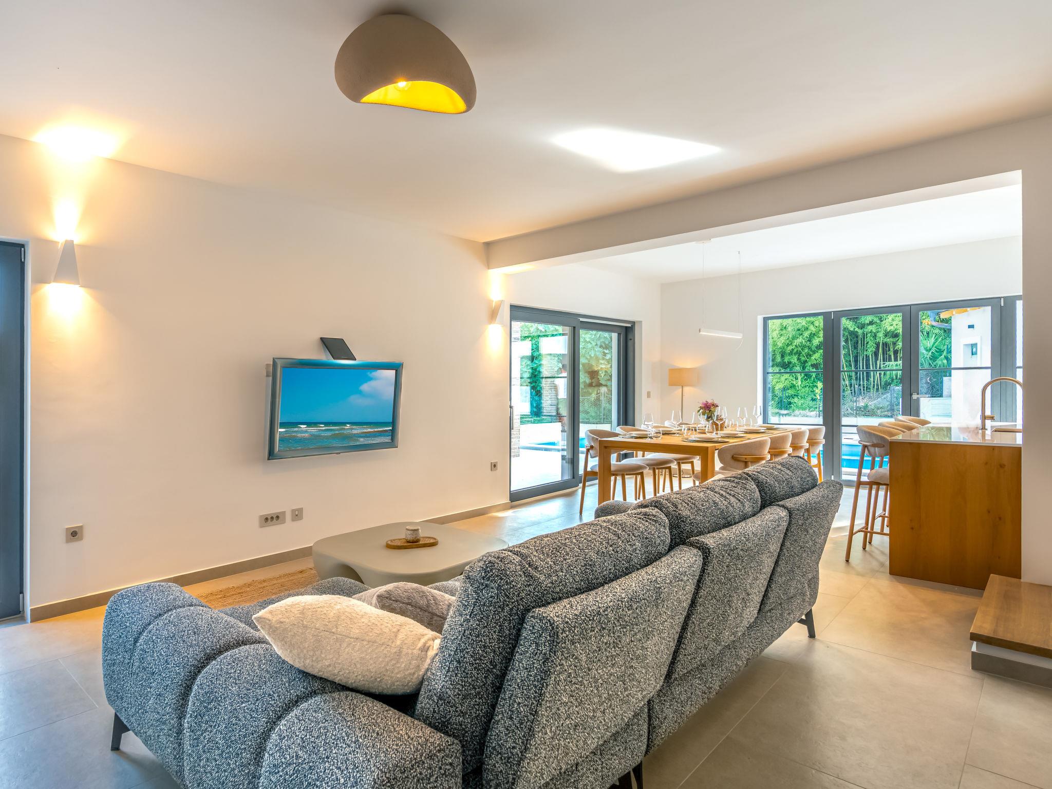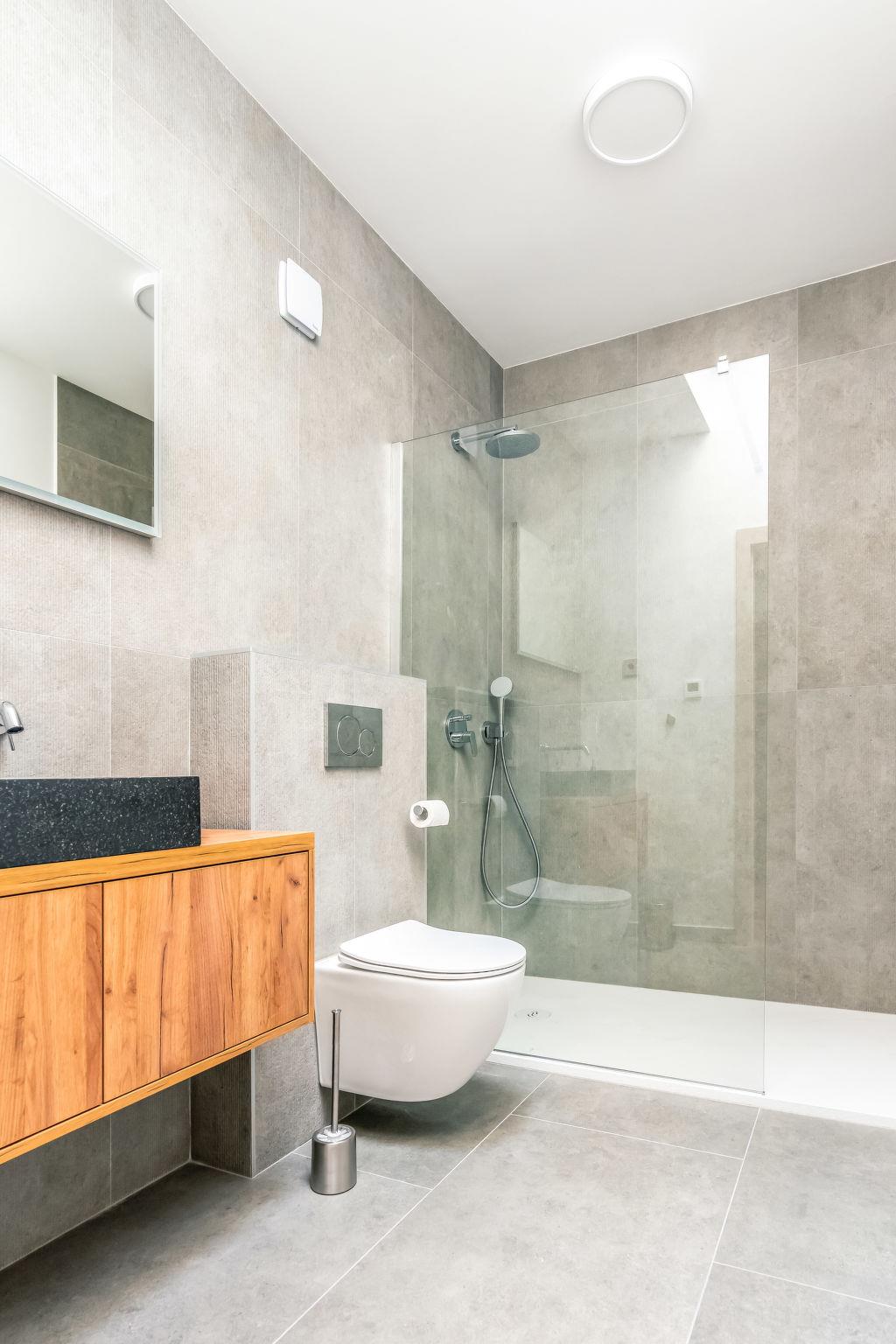 5-room villa 160 m2 on 2 levels, south facing position. Beautiful and tasteful furnishings: living/dining room with panoramic window with satellite TV (flat screen), air conditioning. Exit to the terrace, to the swimming pool. 1 room with 1 french bed (160 cm, length 200 cm), shower/WC and air conditioning. Open kitchen (oven, dishwasher, 5 induction hot plates, toaster, kettle, freezer, electric coffee machine). Exit to the terrace. Sep. WC. Upper floor: 1 room with Dressing room with 1 french bed (180 cm, length 200 cm), shower/WC and satellite TV (flat screen), air conditioning. 1 room with 1 french bed (180 cm, length 200 cm), satellite TV (flat screen), air conditioning. 1 room with 1 bed (80 cm, length 200 cm), 1 pull-out bed (length 200 cm). Shower/WC. Floor heating, forced-air heating. Large terrace 40 m2 partly roofed terrace 30 m2, roofed. Terrace furniture, barbecue (portable), deck chairs (4). Beautiful panoramic view of the sea and the forest. Facilities: hair dryer. Internet (WiFi, free). Please note: non-smoking house. Maximum 1 small pet/ dog allowed. Fire extinguisher.