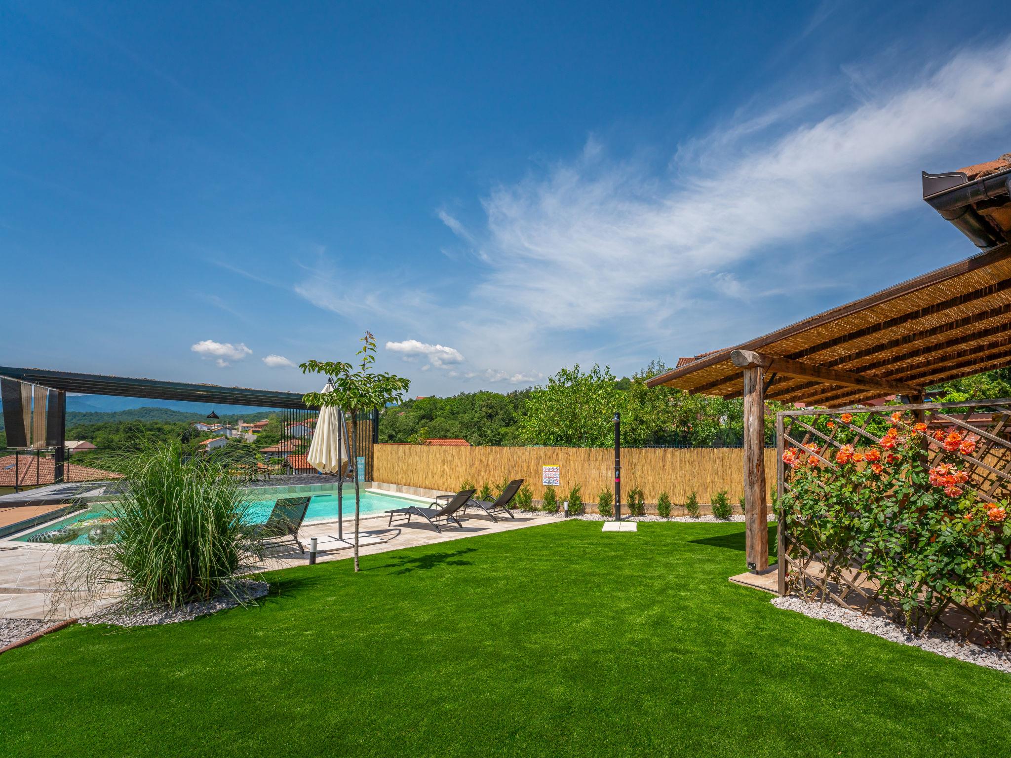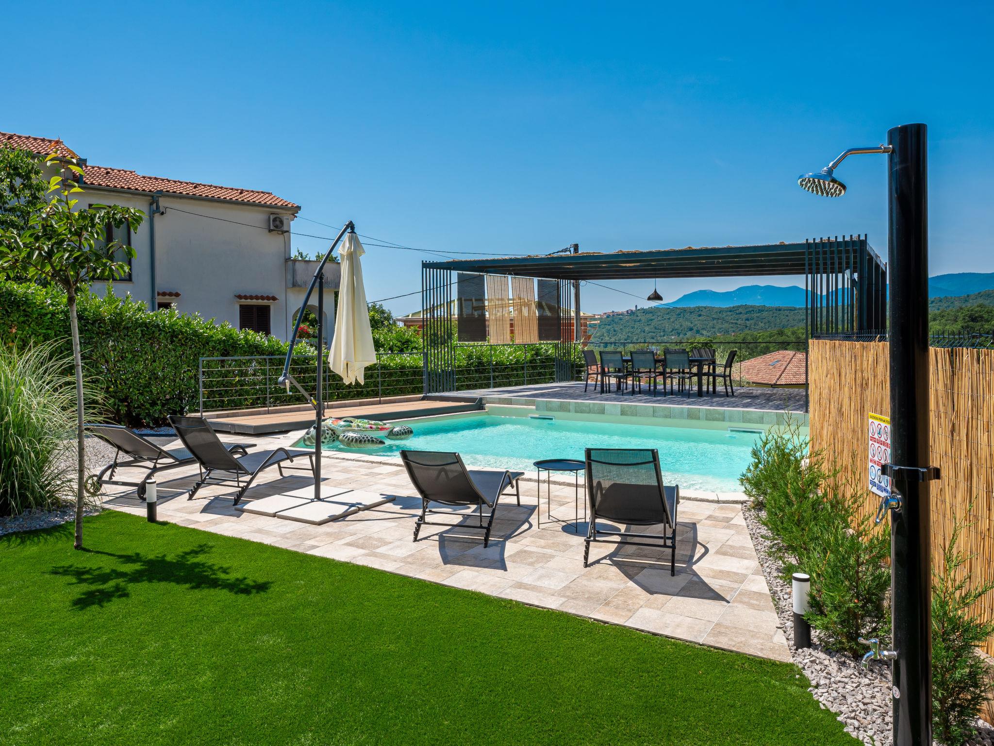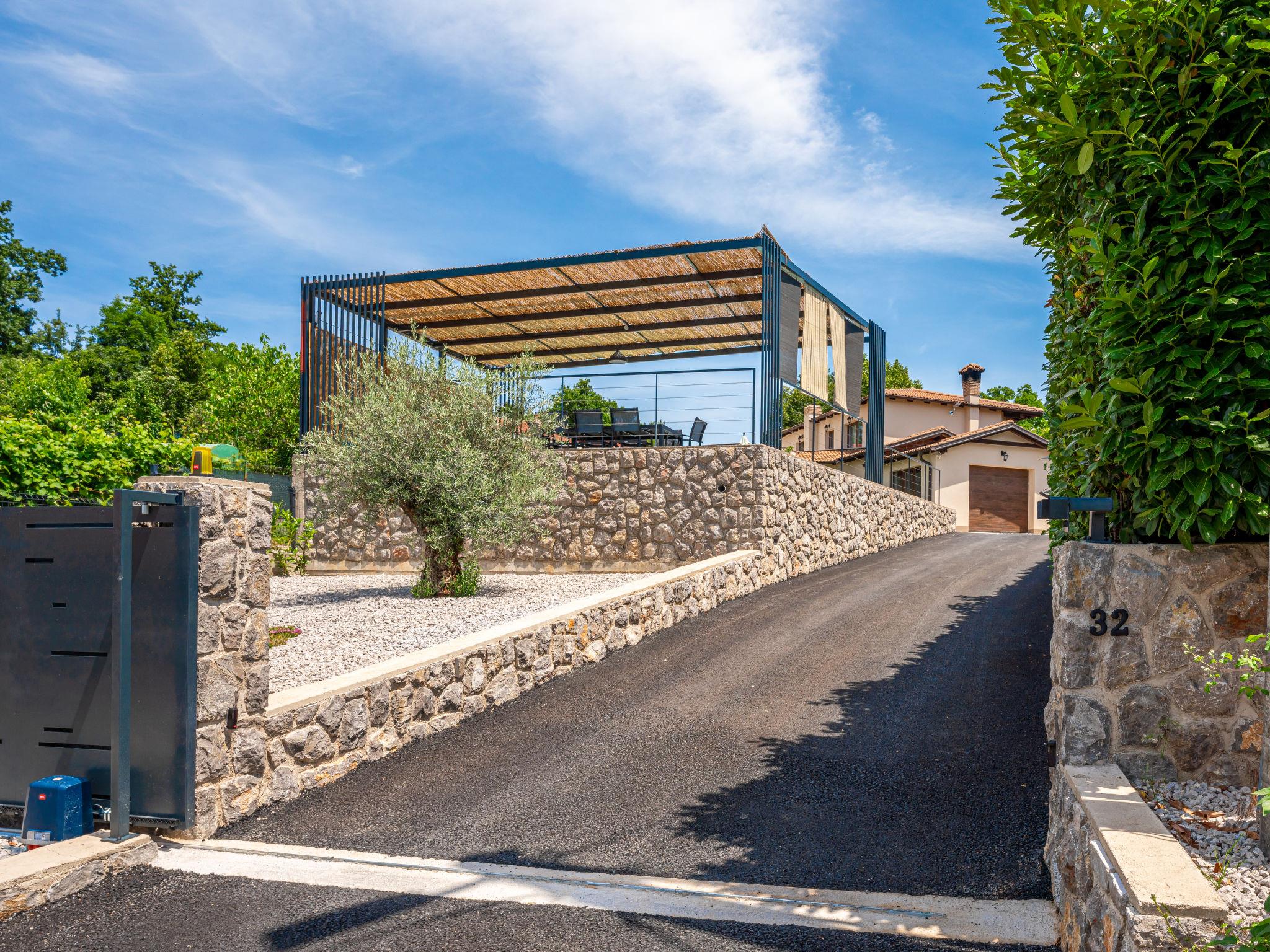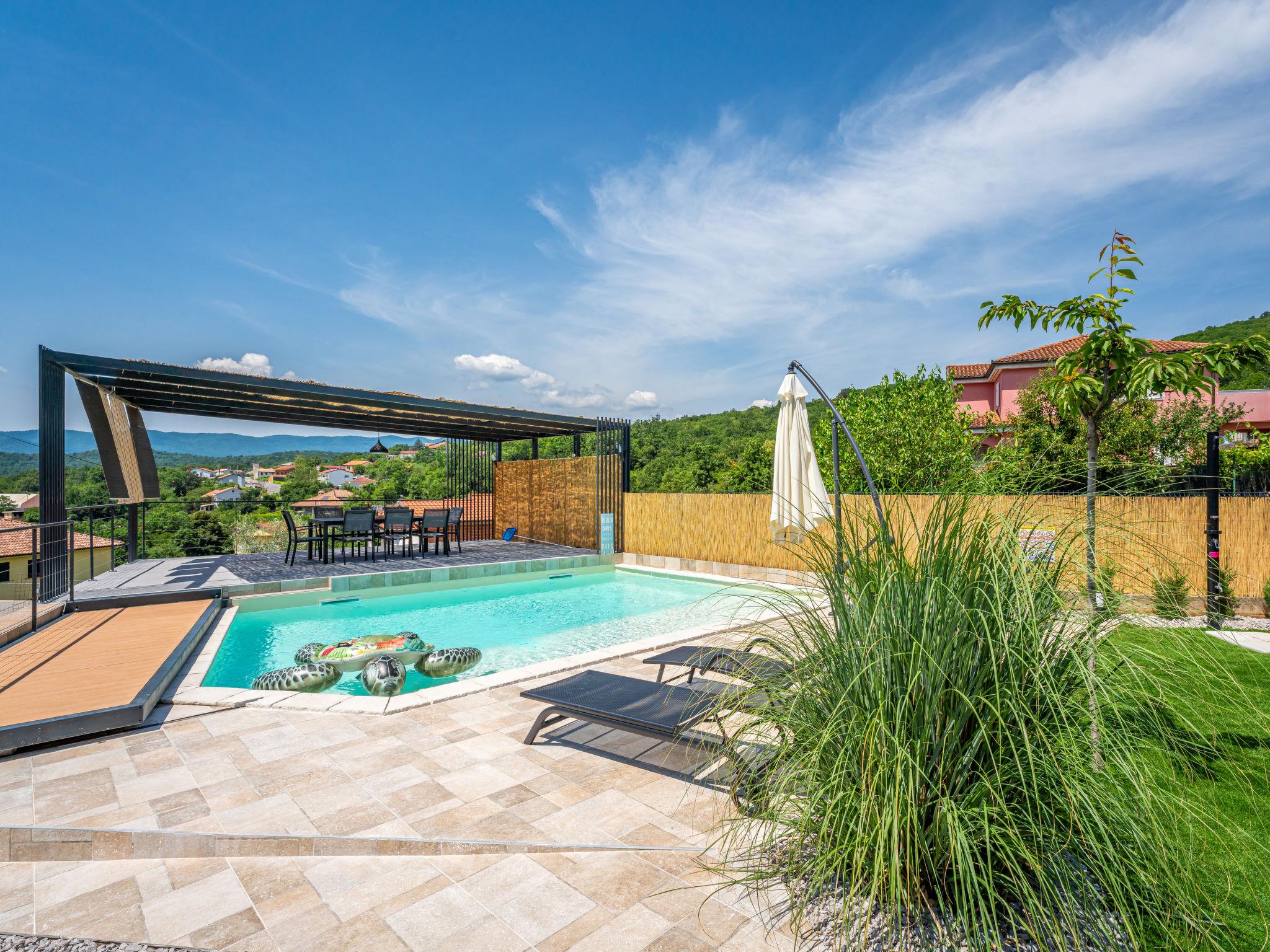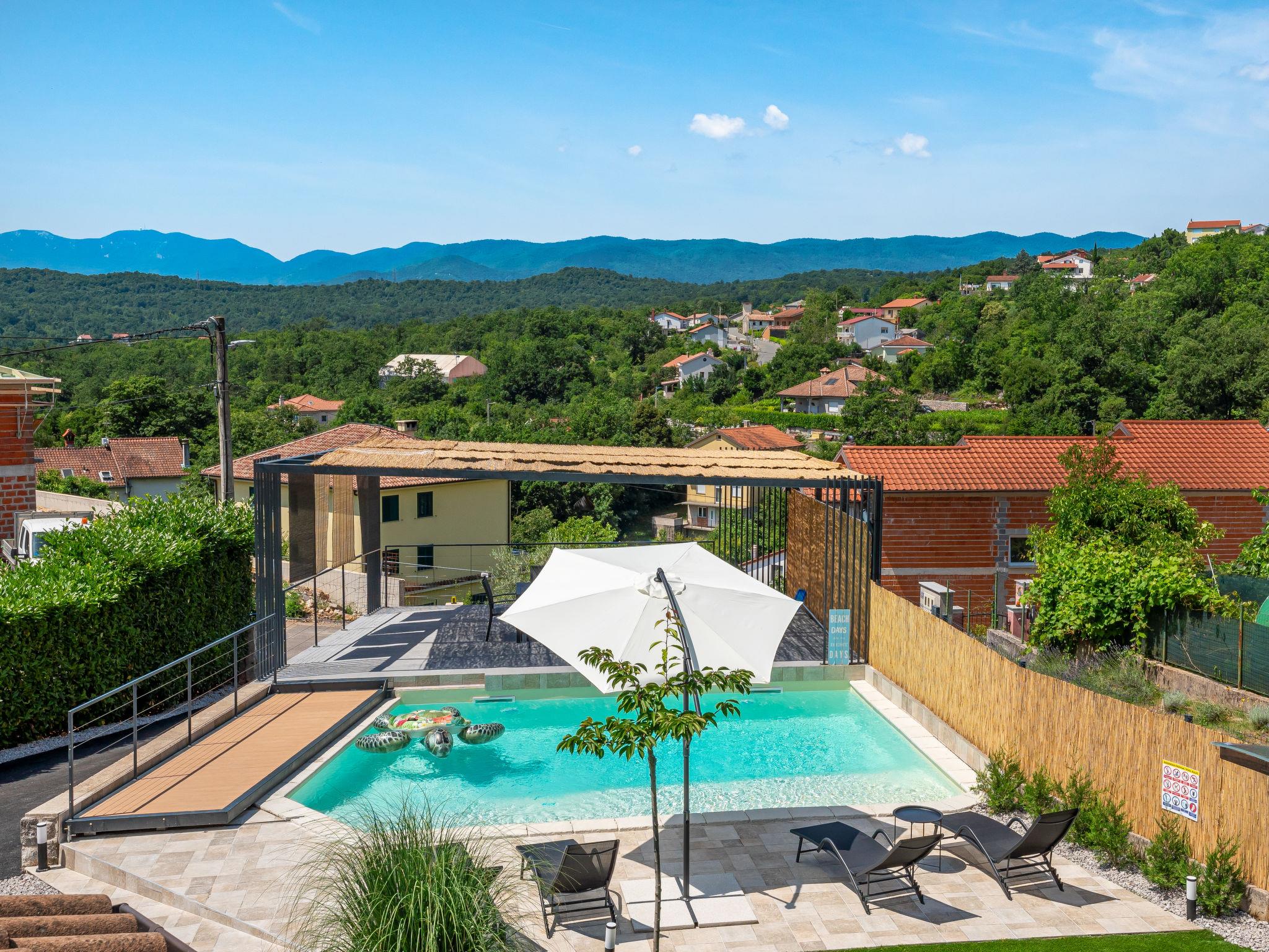 Kastav 6 km from Opatija: Comfortable single-family house "Campanero", 2 storeys, built in 2023. In the hamlet Kudeji 2.4 km from the centre of Viškovo, 3.7 km from the centre of Kastav, 9 km from the centre of Opatija, in a sunny, elevated position, 8 km from the sea, 8 km from the beach, in a cul-de-sac. Private: property 900 m2 (fenced), garden with lawn 300 m2, swimming pool angular (6 x 6 m, depth 140 cm, seasonal availability: 01.Jun. - 30.Sep.). WC in the pool area, outdoor shower, terrace, garden furniture. In the house: internet access. Parking at the house on the premises. Supermarket 2.4 km, shopping centre 2.4 km, restaurant 1.8 km, bakery 2.4 km, café 2.4 km, bus stop 160 m, pebble beach 8 km (small), outdoor swimming pool 10 km, indoor swimming pool 10 km, public bathing area 10 km, concrete beach 8 km. Nearby attractions: Kuca halubajskega zvoncara UNESCO 2 km. Groups of teenagers on request only. Part of the house is closed and unoccupied. The owner runs dry dock marine services. By groups of young people double deposit is requested on arrival.